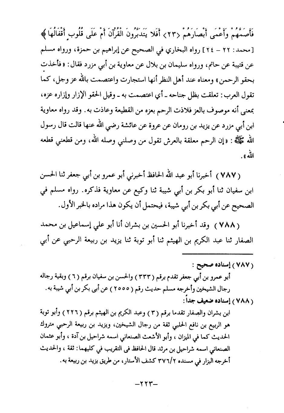 788 - وَقَدْ أَخْبَرَنَا أَبُو الْحُسَيْنِ بْنُ بِشْرَانَ، أنا أَبُو عَلِيٍّ إِسْمَاعِيلُ بْنُ مُحَمَّدٍ الصَّفَّارُ، ثنا عَبْدُ الْكَرِيمِ بْنُ الْهَيْثَمِ، ثنا أَبُو تَوْبَةَ، ثنا يَزِيدُ بْنُ رَبِيعَةَ الرَّحَبِيُّ، عَنْ أَبِي -[224]- الْأَشْعَثِ الصَّنْعَانِيِّ، عَنْ أَبِي عُثْمَانَ الصَّنْعَانِيِّ، عَنْ ثَوْبَانَ، رَضِيَ اللَّهُ عَنْهُ قَالَ: إِنَّ رَسُولَ اللَّهِ صَلَّى اللهُ عَلَيْهِ وَسَلَّمَ، قَالَ: " §ثَلَاثٌ مُعَلَّقَاتٌ بِالْعَرْشِ: الرَّحِمُ تَقُولُ: اللَّهُمَّ إِنِّي بِكَ فَلَا أُقْطَعُ، وَالْأَمَانَةُ تَقُولُ: اللَّهُمَّ إِنِّي بِكَ فَلَا أُخْتَانُ، وَالنِّعْمَةُ تَقُولُ: اللَّهُمَّ إِنِّي بِكَ فَلَا أُكْفَرُ "