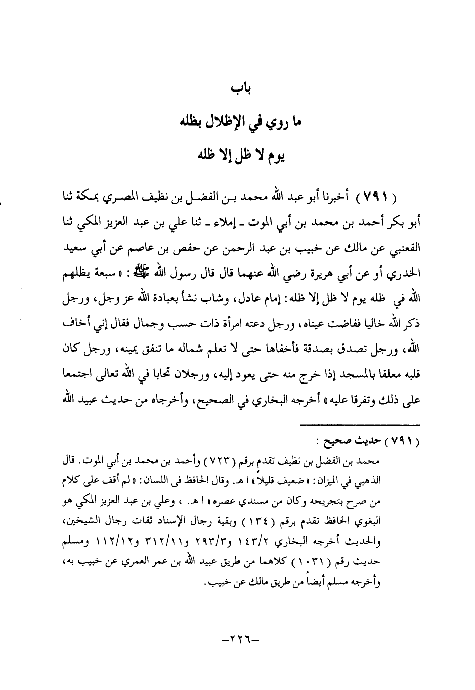 791 - أَخْبَرَنَا أَبُو عَبْدِ اللَّهِ مُحَمَّدُ بْنُ الْفَضْلِ بْنِ نَظِيفٍ الْمِصْرِيُّ بِمَكَّةَ، ثنا أَبُو بَكْرٍ أَحْمَدُ بْنُ مُحَمَّدِ بْنِ أَبِي الْمَوْتِ إِمْلَاءً، ثنا عَلِيُّ بْنُ عَبْدِ الْعَزِيزِ الْمَكِّيُّ، ثنا الْقَعْنَبِيُّ، عَنْ مَالِكٍ، عَنْ خُبَيْبِ بْنِ عَبْدِ الرَّحْمَنِ، عَنْ حَفْصِ بْنِ عَاصِمٍ، عَنْ أَبِي سَعِيدٍ الْخُدْرِيِّ، أَوْ عَنْ أَبِي هُرَيْرَةَ، رَضِيَ الْلَّهُ عَنْهُمَا، قَالَ: قَالَ رَسُولُ اللَّهِ صَلَّى اللهُ عَلَيْهِ وَسَلَّمَ: §" سَبْعَةٌ يُظِلُّهُمُ اللَّهُ فِي ظِلِّهِ يَوْمَ لَا ظِلَّ إِلَّا ظِلُّهُ: إِمَامٌ عَادِلٌ، وَشَابٌّ نَشَأَ بِعِبَادَةِ اللَّهِ عَزَّ وَجَلَّ، وَرَجُلٌ ذَكَرَ اللَّهَ خَالِيًا فَفَاضَتْ عَيْنَاهُ، وَرَجُلٌ دَعَتْهُ امْرَأَةٌ ذَاتُ حَسَبٍ وَجَمَالٍ فَقَالَ: إِنِّي أَخَافُ اللَّهَ، وَرَجُلٌ تَصَدَّقَ بِصَدَقَةٍ فَأَخْفَاهَا حَتَّى لَا تَعْلَمُ شِمَالُهُ مَا تُنْفِقُ يَمِينُهُ، وَرَجُلٌ كَانَ قَلْبُهُ مُعَلَّقًا بِالْمَسْجِدِ إِذَا خَرَجَ مِنْهُ حَتَّى يَعُودَ إِلَيْهِ، وَرَجُلَانِ تَحَابَّا فِي اللَّهِ تَعَالَى اجْتَمَعَا عَلَى ذَلِكَ وَتَفَرَّقَا عَلَيْهِ ". أَخْرَجَهُ الْبُخَارِيُّ فِي الصَّحِيحِ، وَأَخْرَجَاهُ مِنْ حَدِيثِ عُبَيْدِ اللَّهِ -[227]- بْنِ عُمَرَ، عَنْ خُبَيْبٍ. وَمَعْنَاهُ عِنْدَ أَهْلِ النَّظَرِ إِدْخَالُهُ إِيَّاهُمْ فِي رَحْمَتِهِ وَرِعَايَتِهِ، كَمَا يُقَالُ أَسْبَلَ الْأَمِيرُ، أَوِ الْوَزِيرُ ظِلَّهُ عَلَى فُلَانٍ؛ بِمَعْنَى الرِّعَايَةِ. وَقَدْ قِيلَ: الْمُرَادُ بِالْخَبَرِ ظِلُّ الْعَرْشِ، وَإِنَّمَا الْإِضَافةُ إِلَى اللَّهِ تَعَالَى وَقَعَتْ عَلَى مَعْنَى الْمِلْكِ