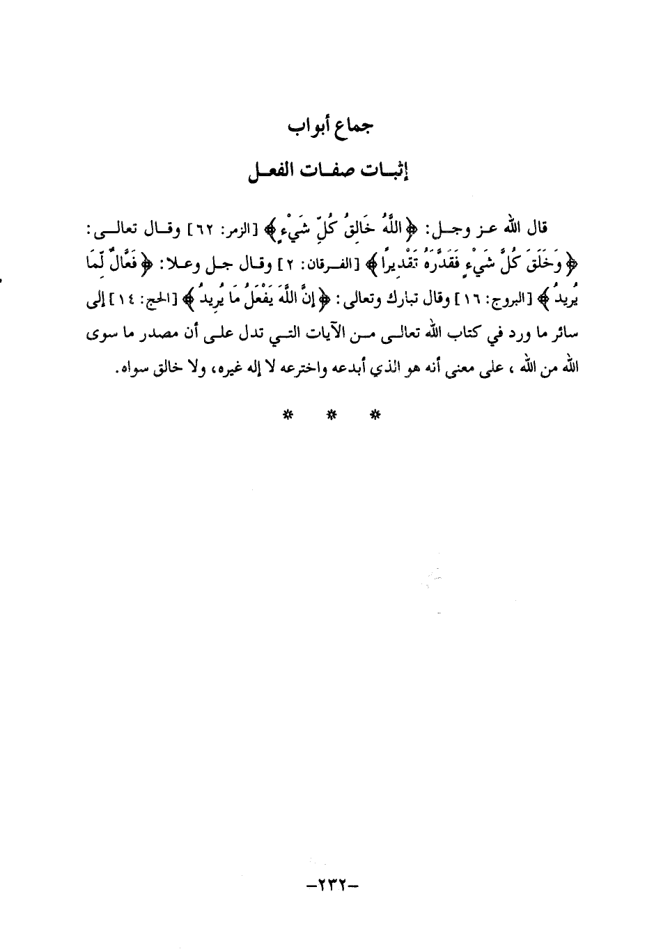 §جِمَاعُ أَبْوَابِ إِثْبَاتِ صِفَاتِ الْفِعْلِ قَالَ اللَّهُ عَزَّ وَجَلَّ: {اللَّهُ خَالِقُ كُلِّ شَيْءٍ} [الرعد: 16] ، وَقَالَ تَعَالَى: {وَخَلَقَ كُلَّ شَيْءٍ فَقَدَّرَهُ تَقْدِيرًا} [الفرقان: 2] ، وَقَالَ جَلَّ وَعَلَا: {فَعَّالٌ لِمَا يُرِيدُ} [هود: 107] ، وَقَالَ تَبَارَكَ وَتَعَالَى: {إِنَّ اللَّهَ يَفْعَلُ مَا يُرِيدُ} [الحج: 14] إِلَى سَائِرِ مَا وَرَدَ فِي كِتَابِ اللَّهِ تَعَالَى مِنَ الْآيَاتِ الَّتِي تَدُلُّ عَلَى أَنَّ مَصْدَرَ مَا سِوَى اللَّهِ مِنَ اللَّهِ، عَلَى مَعْنَى أَنَّهُ هُوَ الَّذِي أَبْدَعَهُ وَاخْتَرَعَهُ، لَا إِلَهَ غَيْرُهُ، وَلَا خَالِقَ سِوَاهُ.