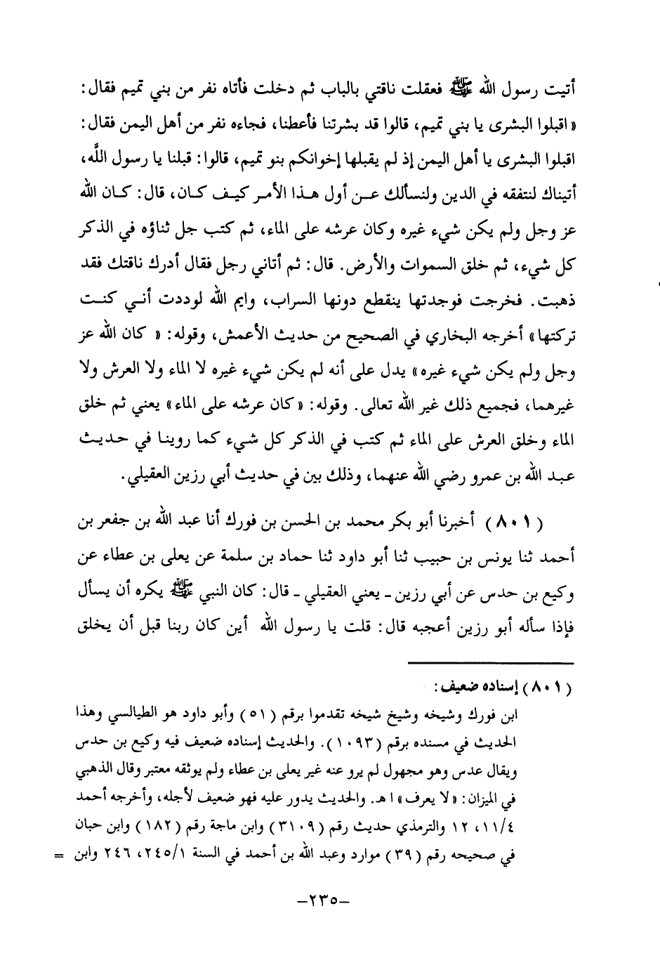 801 - أَخْبَرَنَا أَبُو بَكْرٍ مُحَمَّدُ بْنُ الْحَسَنِ بْنِ فُورَكٍ، أنا عَبْدُ اللَّهِ بْنُ جَعْفَرِ بْنِ أَحْمَدَ، ثنا يُونُسُ بْنُ حَبِيبٍ، ثنا أَبُو دَاوُدَ، ثنا حَمَّادُ بْنُ سَلَمَةَ، عَنْ يَعْلَى بْنِ عَطَاءٍ، عَنْ وَكِيعِ بْنِ حُدُسٍ، عَنْ أَبِي رَزِينٍ يَعْنِي الْعُقَيْلِيَّ، قَالَ: كَانَ النَّبِيُّ صَلَّى اللهُ عَلَيْهِ وَسَلَّمَ يَكْرَهُ أَنْ يُسْأَلَ، فَإِذَا سَأَلَهُ أَبُو رَزِينٍ أَعْجَبَهُ، قَالَ: قُلْتُ: يَا رَسُولَ اللَّهِ، أَيْنَ كَانَ رَبُّنَا قَبْلَ أَنْ يَخْلُقَ -[236]- السَّمَاوَاتِ وَالْأَرْضَ؟ قَالَ صَلَّى اللهُ عَلَيْهِ وَسَلَّمَ: «كَانَ §فِي عَمَاءٍ مَا فَوْقَهُ هَوَاءٌ، وَمَا تَحْتَهُ هَوَاءٌ ثُمَّ خَلَقَ الْعَرْشَ عَلَى الْمَاءِ» . هَذَا حَدِيثٌ تَفَرَّدَ بِهِ يَعْلَى بْنُ عَطَاءٍ عَنْ وَكِيعِ بْنِ حُدُسٍ، وَيُقَالُ: ابْنُ عُدُسٍ، وَلَا نَعْلَمُ لِوَكِيعِ بْنُ عُدُسٍ هَذَا رَاوِيًا غَيْرَ يَعْلَى بْنِ عَطَاءٍ، وَوَجَدْتُهُ فِي كِتَابِي. «فِي عَمَاءٍ» . مُقَيْدًا بِالْمَدِّ، فَإِنْ كَانَ فِي الْأَصْلِ مَمْدُودًا فَمَعْنَاهُ سَحَابٌ رَقِيقٌ. وَيُرِيدُ بِقَوْلِهِ «فِي عَمَاءٍ» . أَيْ: فَوْقَ سَحَابٍ مُدْبِرًا لَهُ وَعَالِيًا عَلَيْهِ، كَمَا قَالَ تَعَالَى: {أَأَمِنْتُمْ مَنْ فِي السَّمَاءِ} [الملك: 16] يَعْنِي: مَنْ فَوْقَ السَّمَاءِ. وَقَالَ: {وَلَأُصَلِّبَنَّكُمْ فِي جُذُوعِ النَّخْلِ} [طه: 71] يَعْنِي: عَلَى جُذُوعِهَا. وَقَوْلُهُ: «مَا فَوْقَهُ هَوَاءٌ» أَيْ مَا فَوْقَ السَّحَابِ هَوَاءٌ، وَكَذَلِكَ قَوْلُهُ: «وَمَا تَحْتَهُ هَوَاءٌ» أَيْ: مَا تَحْتَ السَّحَابِ هَوَاءٌ، وَقَدْ قِيلَ: إِنَّ ذَلِكَ مِنَ الْعَمَا مَقْصُورًا، وَالْعَمَا إِذَا كَانَ مَقْصُورًا، فَمَعْنَاهُ: لَا شَيْءَ ثَابِتٌ، لِأَنَّهُ مِمَّا يُعْمَى عَلَى الْخَلْقِ لِكَوْنِهِ غَيْرَ شَيْءٍ، وَكَأَنَّهُ قَالَ فِي جَوَابِهِ: كَانَ قَبْلَ أَنْ يَخْلُقَ خَلْقَهُ وَلَمْ يَكُنْ شَيْءٌ غَيْرَهُ. كَمَا قَالَ فِي حَدِيثِ عِمْرَانَ بْنِ حُصَيْنٍ رَضِيَ اللَّهُ عَنْهُ، ثُمَّ قَالَ «فَمَا فَوْقَهُ وَلَا تَحْتَهُ هَوَاءٌ» . أَيْ: لَيْسَ فَوْقَ الْعَمَى الَّذِي لَا شَيْءَ مَوْجُودٌ هَوَاءٌ، وَلَا تَحْتَهُ هَوَاءٌ، لِأَنَّ ذَلِكَ إِذَا كَانَ غَيْرَ شَيْءٍ فَلَيْسَ يَثْبُتُ لَهُ هَوَاءٌ بِوَجْهٍ، وَاللَّهُ أَعْلَمُ. وَقَالَ أَبُو عُبَيْدٍ الْهَرَوِيُّ صَاحِبُ الْغَرِيبَيْنِ، وَقَالَ بَعْضُ أَهْلِ الْعِلْمِ: مَعْنَاهُ أَيْنَ كَانَ عَرْشُ رَبِّنَا؟ فَحُذِفَ اخْتِصَارًا كَقَوْلِهِ: {وَاسْأَلِ الْقَرْيَةَ} [يوسف: 82] أَيْ: أَهْلَ الْقَرْيَةِ، وَيَدُلُّ عَلَى ذَلِكَ قَوْلُهُ: «وَكَانَ عَرْشُهُ عَلَى الْمَاءِ»