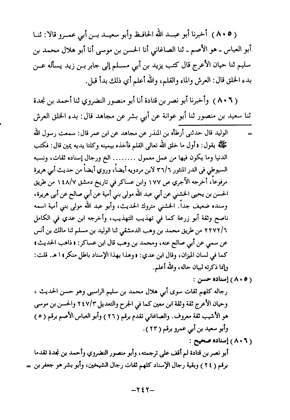 805 - أَخْبَرَنَا أَبُو عَبْدِ اللَّهِ الْحَافِظُ، وَأَبُو سَعِيدِ بْنُ أَبِي عَمْرٍو قَالَا: ثنا أَبُو الْعَبَّاسِ هُوَ الْأَصَمُّ، ثنا الصَّاغَانِيُّ، أنا الْحَسَنُ بْنُ مُوسَى، أنا أَبُو هِلَالٍ مُحَمَّدُ بْنُ سُلَيْمٍ، ثنا حَيَّانُ الْأَعْرَجُ، قَالَ: كَتَبَ يَزِيدُ بْنُ أَبِي مُسْلِمٍ إِلَى جَابِرِ بْنِ زَيْدٍ يَسْأَلُهُ عَنْ بَدْءِ الْخَلْقِ، قَالَ: §الْعَرْشُ وَالْمَاءُ وَالْقَلَمُ، وَاللَّهُ أَعْلَمُ أَيُّ ذَلِكَ بَدَأَ قَبْلُ