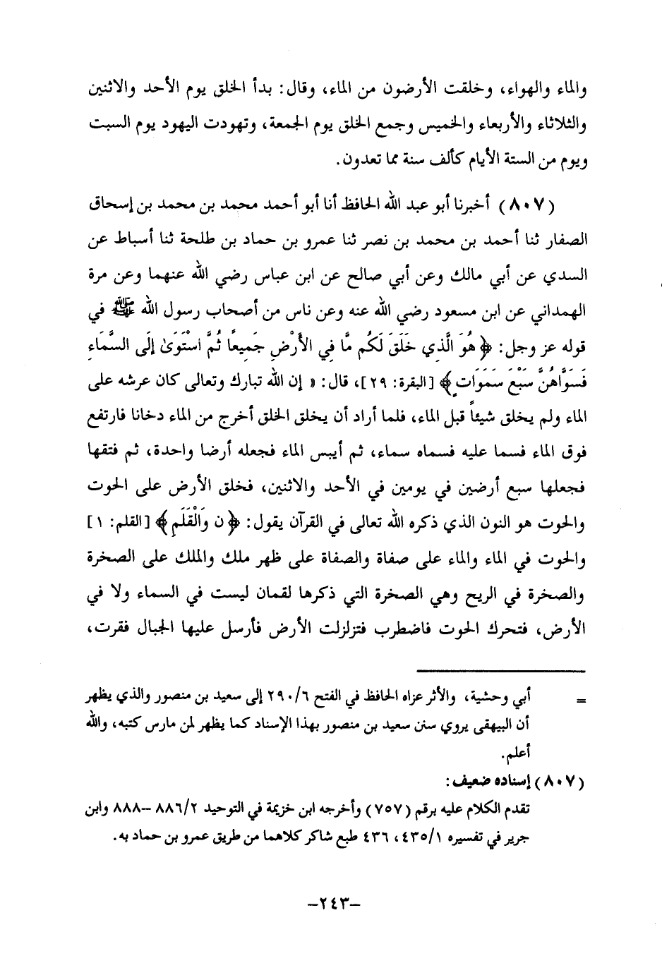 807 - أَخْبَرَنَا أَبُو عَبْدِ اللَّهِ الْحَافِظُ، أنا أَبُو أَحْمَدَ مُحَمَّدُ بْنُ مُحَمَّدِ بْنِ إِسْحَاقَ الصَّفَّارُ، ثنا أَحْمَدُ بْنُ مُحَمَّدِ بْنِ نَصْرٍ، ثنا عَمْرُو بْنُ حَمَّادِ بْنِ طَلْحَةَ، ثنا أَسْبَاطُ، عَنِ السُّدِّيِّ، عَنْ أَبِي مَالِكٍ، وَعَنْ أَبِي صَالِحٍ، عَنِ ابْنِ عَبَّاسٍ، رَضِيَ اللَّهُ عَنْهُمَا، وَعَنْ مُرَّةَ الْهَمْدَانِيِّ، عَنِ ابْنِ مَسْعُودٍ، رَضِيَ اللَّهُ عَنْهُ، وَعَنْ نَاسٍ مِنْ أَصْحَابِ رَسُولِ اللَّهِ صَلَّى اللهُ عَلَيْهِ وَسَلَّمَ فِي قَوْلِهِ عَزَّ وَجَلَّ: {هُوَ الَّذِي خَلَقَ لَكُمْ مَا فِي الْأَرْضِ جَمِيعًا ثُمَّ اسْتَوَى إِلَى السَّمَاءِ فَسَوَّاهُنَّ سَبْعَ سَمَاوَاتٍ} [البقرة: 29] ، قَالَ: " إِنَّ اللَّهَ تَبَارَكَ وَتَعَالَى §كَانَ عَرْشُهُ عَلَى الْمَاءِ، وَلَمْ يَخْلُقْ شَيْئًا قَبْلَ الْمَاءِ، فَلَمَّا أَرَادَ أَنْ يَخْلُقَ الْخَلْقَ أَخْرَجَ مِنَ الْمَاءِ دُخَانًا فَارْتَفَعَ فَوْقَ الْمَاءِ، فَسَمَا عَلَيْهِ فَسَمَّاهُ سَمَاءً، ثُمَّ أَيْبَسَ الْمَاءَ فَجَعَلَهُ أَرْضًا وَاحِدَةً، ثُمَّ فَتَقَهَا فَجَعَلَهَا سَبْعَ أَرَضِينَ فِي يَوْمَيْنِ: فِي الْأَحَدِ وَالْإِثْنَيْنِ، فَخَلَقَ الْأَرْضَ عَلَى الْحُوتِ وَالْحُوتُ هُوَ النُّونُ الَّذِي ذَكَرَهُ اللَّهُ تَعَالَى فِي الْقُرْآنِ يَقُولُ: {ن وَالْقَلَمِ} [القلم: 1] وَالْحُوتُ فِي الْمَاءِ، وَالْمَاءُ عَلَى صَفَاةٍ، وَالصَّفَاةُ عَلَى ظَهْرِ مَلَكٍ، وَالْمَلَكُ عَلَى الصَّخْرَةِ، وَالصَّخْرَةُ فِي الرِّيحِ وَهِيَ الصَّخْرَةُ الَّتِي ذَكَرَهَا لُقْمَانُ لَيْسَتْ فِي السَّمَاءِ وَلَا فِي الْأَرْضِ، فَتَحَرَّكَ الْحُوتُ فَاضْطَرَبَ فَتَزَلْزَلَتِ الْأَرْضُ فَأَرْسَلَ عَلَيْهَا الْجِبَالَ فَقَرَّتْ، -[244]- فَالْجِبَالُ تَفْخَرُ عَلَى الْأَرْضِ وَذَلِكَ قَوْلُهُ تَعَالَى: {وَأَلْقَى فِي الْأَرْضِ رَوَاسِيَ أَنْ تَمِيدَ بِكُمْ} [النحل: 15] وَخَلَقَ الْجِبَالَ فِيهَا، وَأَقْوَاتُ أَهْلِهَا وَشَجَرِهَا وَمَا يَنْبَغِي لَهَا فِي يَوْمَيْنِ فِي الثُّلَاثَاءِ وَالْأَرْبِعَاءِ، وَذَلِكَ حِينَ يَقُولُ: {أَئِنَّكُمْ لَتَكْفُرُونَ بِالَّذِي خَلَقَ الْأَرْضَ فِي يَوْمَيْنِ وَتَجْعَلُونَ لَهُ أَنْدَادًا ذَلِكَ رَبُّ الْعَالَمِينَ وَجَعَلَ فِيهَا رَوَاسِيَ مِنْ فَوْقِهَا وَبَارَكَ فِيهَا} [فصلت: 10] يَقُولُ: أَنْبَتَ شَجَرَهَا {وَقَدَّرَ فِيهَا أَقْوَاتَهَا} [فصلت: 10] يَقُولُ: أَقْوَاتُهَا لِأَهْلِهَا {فِي أَرْبَعَةِ أَيَّامٍ سَوَاءً لِلسَّائِلِينَ} [فصلت: 10] يَقُولُ: مَنْ سَأَلَ فَهَكَذَا الْأَمْرُ {ثُمَّ اسْتَوَى إِلَى السَّمَاءِ وَهِيَ دُخَانٌ} [فصلت: 11] وَكَانَ ذَلِكَ الدُّخَانُ مِنْ تَنَفُّسِ الْمَاءِ حِينَ تَنَفَّسَ فَجَعَلَهَا سَمَاءً وَاحِدَةً، ثُمَّ فَتَقَهَا فَجَعَلَهَا سَبْعَ سَمَاوَاتٍ فِي يَوْمَيْنِ فِي الْخَمِيسِ وَالْجُمُعَةِ، وَإِنَّمَا سُمِّيَ يَوْمَ الْجُمُعَةِ لِأَنَّهُ جَمَعَ فِيهِ خَلَقَ السَّمَاوَاتِ وَالْأَرْضِ: {وَأَوْحَى فِي كُلِّ سَمَاءٍ أَمَرَهَا} [فصلت: 12] ، قَالَ: خَلَقَ فِي كُلِّ سَمَاءٍ خَلْقًا مِنَ الْمَلَائِكَةِ، وَالْخَلْقُ الَّذِي فِيهَا مِنَ الْبِحَارِ وَجِبَالِ الْبَرِّ، وَمَا لَا يُعْلَمُ، ثُمَّ زَيَّنَ السَّمَاءَ الدُّنْيَا بِالْكَوَاكِبِ، فَجَعَلَهَا زِينَةً وَحِفْظًا يَحْفَظُ مِنَ الشَّيَاطِينِ، فَلَمَّا فَرَغَ مِنْ خَلْقِ مَا أَحَبَّ اسْتَوَى عَلَى الْعَرْشِ فَذَلِكَ حِينَ يَقُولُ: {خَلَقَ السَّمَاوَاتِ وَالْأَرْضَ فِي سِتَّةِ أَيَّامٍ} [الأعراف: 54] يَقُولُ: {كَانَتَا رَتْقًا فَفَتَقْنَاهُمَا} [الأنبياء: 30] ". وَذَكَرَ الْقِصَّةَ فِي خَلْقِ آدَمَ عَلَيْهِ السَّلَامُ، وَقَدْ مَضَى ذِكْرُهُ فِي بَابِ الرُّوحِ