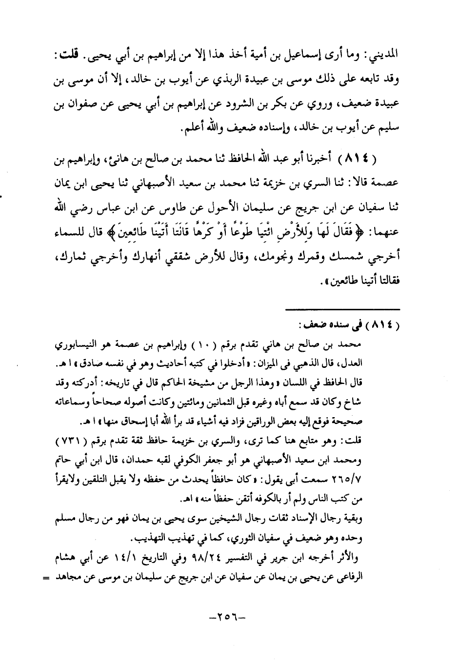 814 - أَخْبَرَنَا أَبُو عَبْدِ اللَّهِ الْحَافِظُ، ثنا مُحَمَّدُ بْنُ صَالِحِ بْنِ هَانِئٍ، وَإِبْرَاهِيمُ بْنُ عِصْمَةَ، قَالَا: ثنا السَّرِيُّ بْنُ خُزَيْمَةَ، ثنا مُحَمَّدُ بْنُ سَعِيدٍ الْأَصْبَهَانِيُّ، ثنا يَحْيَى بْنُ يَمَانَ، ثنا سُفْيَانُ، عَنِ ابْنِ جُرَيْجٍ، عَنْ سُلَيْمَانَ الْأَحْوَلِ، عَنْ طَاوُسٍ، عَنِ ابْنِ عَبَّاسٍ، رَضِيَ اللَّهُ عَنْهُمَا: {فَقَالَ لَهَا وَلِلْأَرْضِ ائْتِيَا طَوْعًا أَوْ كَرْهًا قَالَتَا أَتَيْنَا طَائِعِينَ} [فصلت: 11] §قَالَ لِلسَّمَاءِ: أَخْرِجِي شَمْسَكِ وَقَمَرَكِ وَنُجُومَكِ، وَقَالَ لِلْأَرْضِ: شَقِّقِي أَنْهَارَكِ وَأَخْرِجِي ثِمَارَكِ. -[257]- فَقَالَتَا: أَتَيْنَا طَائِعِينَ