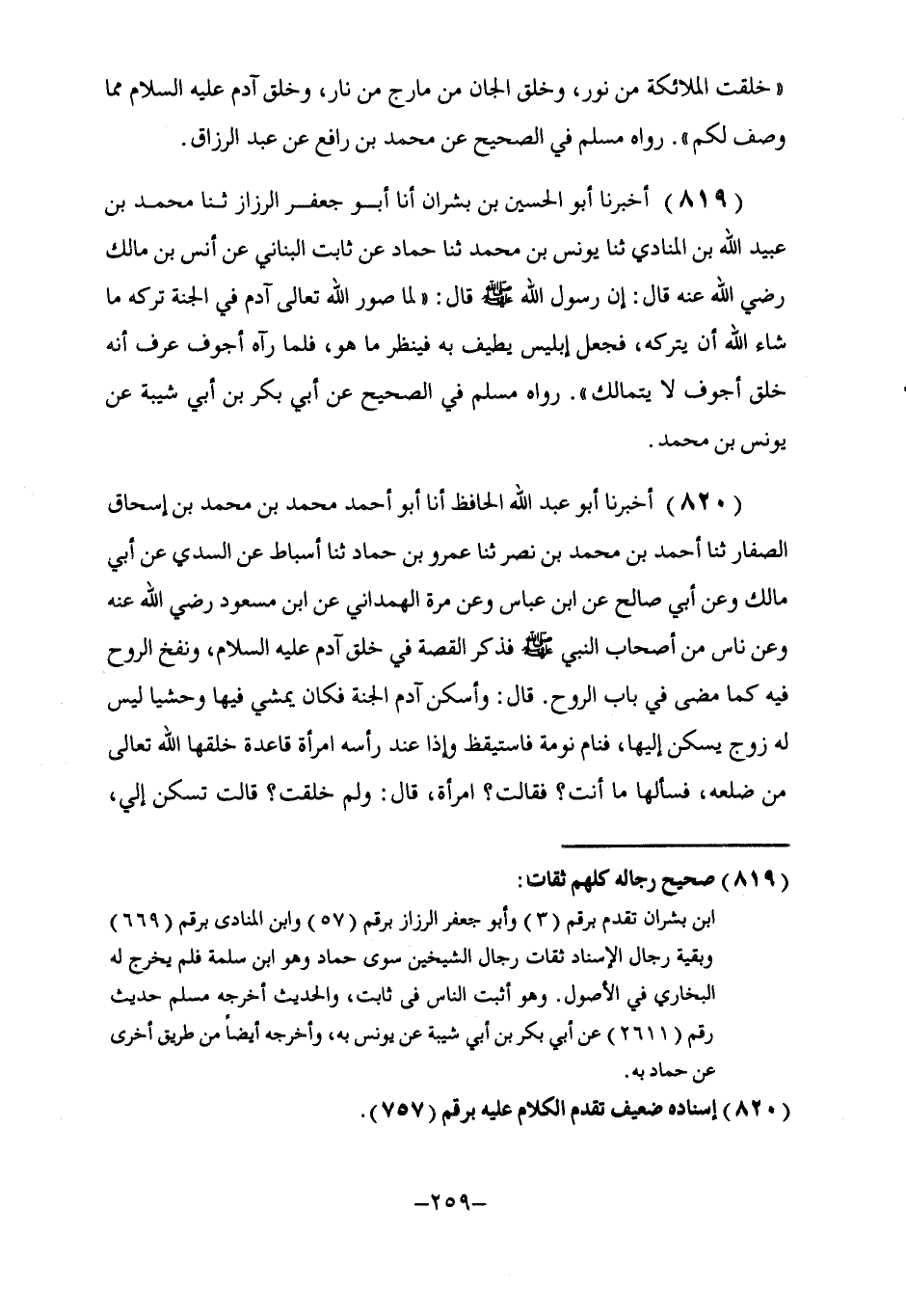 819 - أَخْبَرَنَا أَبُو الْحُسَيْنِ بْنُ بِشْرَانَ، أنا أَبُو جَعْفَرٍ الرَّزَّازُ، ثنا مُحَمَّدُ بْنُ عُبَيْدِ اللَّهِ بْنِ الْمُنَادِي، ثنا يُونُسُ بْنُ مُحَمَّدٍ، ثنا حَمَّادٌ، عَنْ ثَابِتٍ الْبُنَانِيِّ، عَنْ أَنَسِ بْنِ مَالِكٍ، رَضِيَ اللَّهُ عَنْهُ، قَالَ: إِنَّ رَسُولَ اللَّهِ صَلَّى اللهُ عَلَيْهِ وَسَلَّمَ قَالَ: §«لَمَّا صَوَّرَ اللَّهُ تَعَالَى آدَمَ فِي الْجَنَّةِ تَرَكَهُ مَا شَاءَ اللَّهُ أَنْ يَتْرُكَهُ، فَجَعَلَ إِبْلِيسُ يُطِيفُ بِهِ فَيَنْظُرُ مَا هُوَ، فَلَمَّا رَآهُ أَجْوَفَ عَرَفَ أَنَّهُ خُلِقَ أَجْوَفَ لَا يَتَمَالَكُ» . رَوَاهُ مُسْلِمٌ فِي الصَّحِيحِ عَنْ أَبِي بَكْرِ بْنِ أَبِي شَيْبَةَ، عَنْ يُونُسَ بْنِ مُحَمَّدٍ