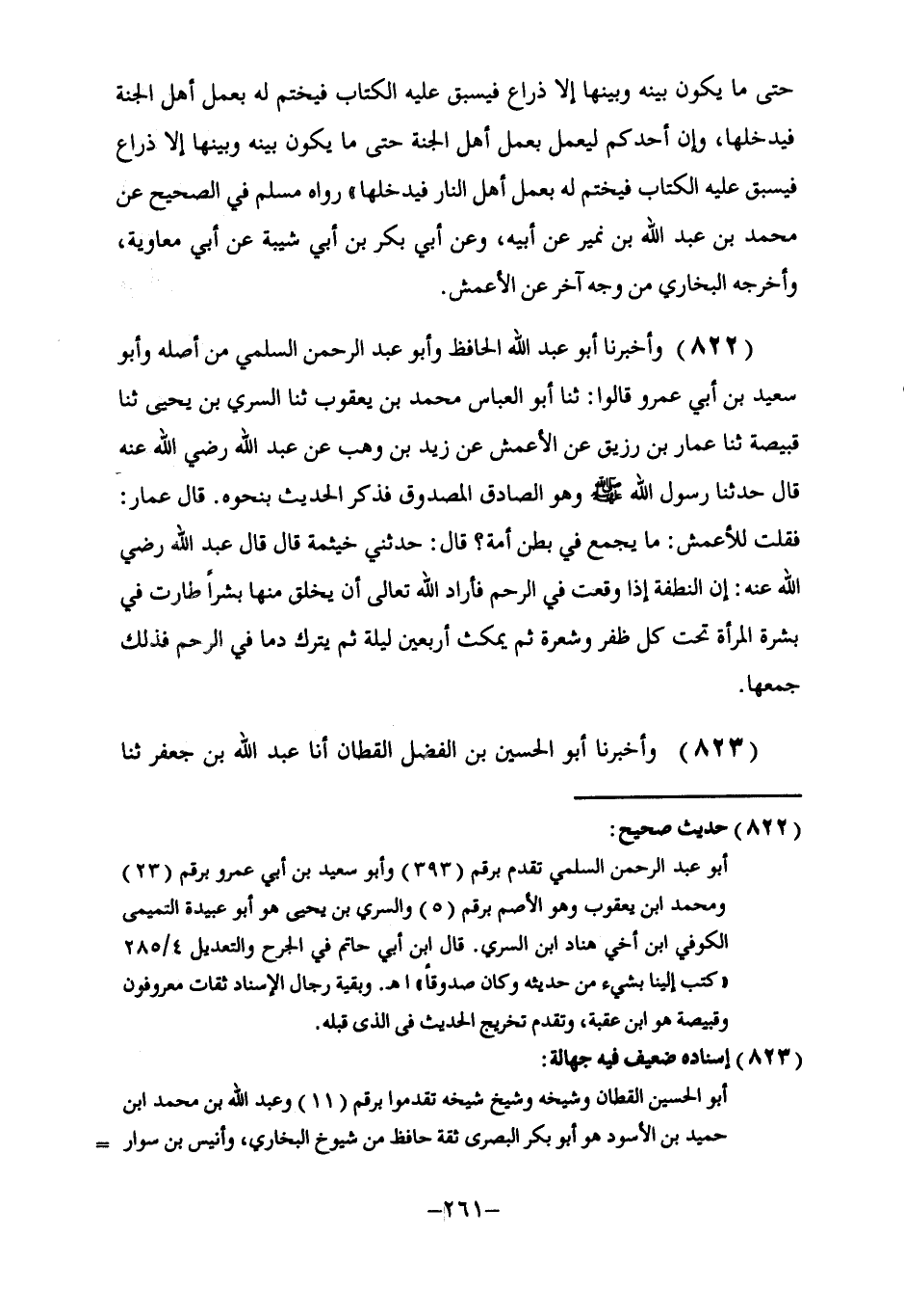 823 - وَأَخْبَرَنَا أَبُو الْحُسَيْنِ بْنُ الْفَضْلِ الْقَطَّانُ، أنا عَبْدُ اللَّهِ بْنُ جَعْفَرٍ، ثنا -[262]- يَعْقُوبُ بْنُ سُفْيَانَ، قَالَ: حَدَّثَنِي عَبْدُ اللَّهِ بْنُ مُحَمَّدِ بْنِ حُمَيْدِ بْنِ الْأَسْوَدِ، ثنا أُنَيْسُ بْنُ سَوَّارٍ الْجَرْمِيُّ، ثنا أَبِي، عَنْ مَالِكِ بْنِ الْحُوَيْرِثِ، صَاحِبِ النَّبِيِّ صَلَّى اللهُ عَلَيْهِ وَسَلَّمَ قَالَ: ذَكَرَ النَّبِيُّ صَلَّى اللهُ عَلَيْهِ وَسَلَّمَ قَالَ: «إِنَّ اللَّهَ عَزَّ وَجَلَّ §إِذَا أَرَادَ خَلْقَ عَبْدٍ فَجَامَعَ الرَّجُلُ الْمَرْأَةَ طَارَ مَاؤُهُ فِي كُلِّ عِرْقٍ وَعُضْوٍ مِنْهَا، فَإِذَا كَانَ يَوْمُ السَّابِعِ جَمَعَهُ اللَّهُ تَعَالَى ثُمَّ أَحْضَرَهُ كُلَّ عِرْقٍ لَهُ دُونَ آدَمَ فِي أَيِّ صُورَةٍ مَا شَاءَ رَكَّبَكَ»