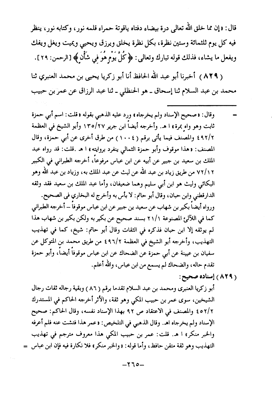 829 - أَخْبَرَنَا أَبُو عَبْدِ اللَّهِ الْحَافِظُ، أنا أَبُو زَكَرِيَّا يَحْيَى بْنُ مُحَمَّدٍ الْعَنْبَرِيُّ، ثنا مُحَمَّدُ بْنُ عَبْدِ السَّلَامِ، ثنا إِسْحَاقُ هُوَ الْحَنْظَلِيُّ، ثنا عَبْدُ الرَّزَّاقِ، عَنْ عُمَرَ بْنِ حَبِيبٍ -[266]- الْمَكِّيِّ، عَنْ حُمَيْدِ بْنِ قَيْسٍ الْأَعْرَجِ، عَنْ طَاوُسٍ، قَالَ: جَاءَ رَجُلٌ إِلَى عَبْدِ اللَّهِ بْنِ عَمْرِو بْنِ الْعَاصِ رَضِيَ اللَّهُ عَنْهُمَا فَسَأَلَهُ: §مِمَّ خُلِقَ الْخَلْقُ؟ قَالَ: مِنَ الْمَاءِ وَالنُّورِ وَالظُّلْمَةِ وَالرِّيحِ وَالتُّرَابِ. قَالَ الرَّجُلُ: فَمِمَّ خُلِقَ هَؤُلَاءِ؟ قَالَ: لَا أَدْرِي. ثُمَّ أَتَى الرَّجُلُ عَبْدَ اللَّهِ بْنَ الزُّبَيْرِ رَضِيَ اللَّهُ عَنْهُمَا فَسَأَلَهُ، فَقَالَ مِثْلَ قَوْلِ عَبْدِ اللَّهِ بْنِ عَمْرٍو، قَالَ: فَأَتَى الرَّجُلُ عَبْدَ اللَّهِ بْنَ عَبَّاسٍ فَسَأَلَهُ فَقَالَ: مِمَّ خُلِقَ الْخَلْقُ؟ قَالَ: مِنَ الْمَاءِ وَالنُّورِ وَالظُّلْمَةِ وَالرِّيحِ وَالتُّرَابِ. قَالَ الرَّجُلُ: فَمِمَّ خُلِقَ هَؤُلَاءِ؟ فَتَلَا عَبْدُ اللَّهِ بْنُ عَبَّاسٍ رَضِيَ اللَّهُ عَنْهُمَا: {وَسَخَّرَ لَكُمْ مَا فِي السَّمَاوَاتِ وَمَا فِي الْأَرْضِ جَمِيعًا مِنْهُ} [الجاثية: 13] فَقَالَ الرَّجُلُ: مَا كَانَ لِيَأْتِيَ بِهَذَا إِلَّا رَجُلٌ مِنْ أَهْلِ بَيْتِ النَّبِيِّ صَلَّى اللهُ عَلَيْهِ وَسَلَّمَ. قُلْتُ: أَرَادَ أَنَّ مَصْدَرَ الْجَمِيعِ مِنْهُ أَيْ مِنْ خَلْقِهِ، وَإِبْدَاعِهِ وَاخْتِرَاعِهِ، خَلَقَ الْمَاءَ أَوَّلًا أَوِ الْمَاءَ وَمَا شَاءَ مِنْ خَلْقِهِ لَا عَنْ أَصْلٍ وَلَا عَلَى مِثَالٍ سَبَقَ، ثُمَّ جَعَلَهُ أَصْلًا لِمَا خَلَقَ بَعْدَهُ، فَهُوَ الْمُبْدِعُ وَهُوَ الْبَارِئُ لَا إِلَهَ غَيْرُهُ وَلَا خَالِقَ سِوَاهُ