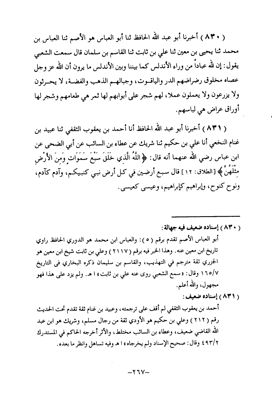 830 - أَخْبَرَنَا أَبُو عَبْدِ اللَّهِ الْحَافِظُ، ثنا أَبُو الْعَبَّاسِ هُوَ الْأَصَمُّ، ثنا الْعَبَّاسُ بْنُ مُحَمَّدٍ، ثنا يَحْيَى بْنُ مَعِينِ، ثنا عَلِيُّ بْنُ ثَابِتٍ، ثنا الْقَاسِمُ بْنُ سَلْمَانَ، قَالَ: سَمِعْتُ الشَّعْبِيَّ، يَقُولُ: إِنَّ §لِلَّهِ عِبَادًا مِنْ وَرَاءِ الْأَنْدُلُسِ كَمَا بَيْنَنَا وَبَيْنَ الْأَنْدَلُسِ مَا يَرَوْنَ أَنَّ اللَّهَ عَزَّ وَجَلَّ عَصَاهُ مَخْلُوقٌ، رَضْرَاضُهُمُ الدُّرُّ وَالْيَاقُوتُ، وَجِبَالُهُمُ الذَّهَبُ وَالْفِضَّةُ، لَا يَحْرُثُونَ وَلَا يَزْرَعُونَ وَلَا يَعْمَلُونَ عَمَلًا، لَهُمْ شَجَرٌ عَلَى أَبْوَابِهِمْ لَهَا ثَمَرٌ هِيَ طَعَامُهُمْ، وَشَجَرٌ لَهَا أَوْرَاقٌ عِرَاضٌ هِيَ لِبَاسُهُمْ