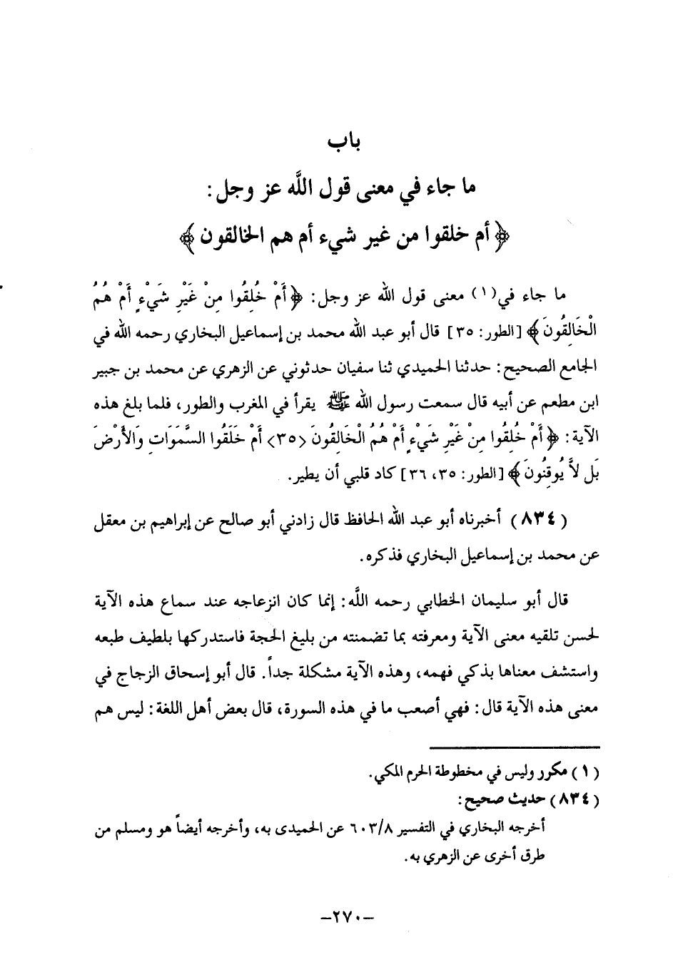 §بَابُ مَا جَاءَ فِي مَعْنَى قَوْلِ اللَّهِ عَزَّ وَجَلَّ: {أُمْ خُلِقُوا مِنْ غَيْرِ شَيْءٍ أَمْ هُمُ الْخَالِقُونَ} [الطور: 35] مَا جَاءَ فِي مَعْنَى قَوْلِ اللَّهِ عَزَّ وَجَلَّ: {أُمْ خُلِقُوا مِنْ غَيْرِ شَيْءٍ أَمْ هُمُ الْخَالِقُونَ} [الطور: 35] .