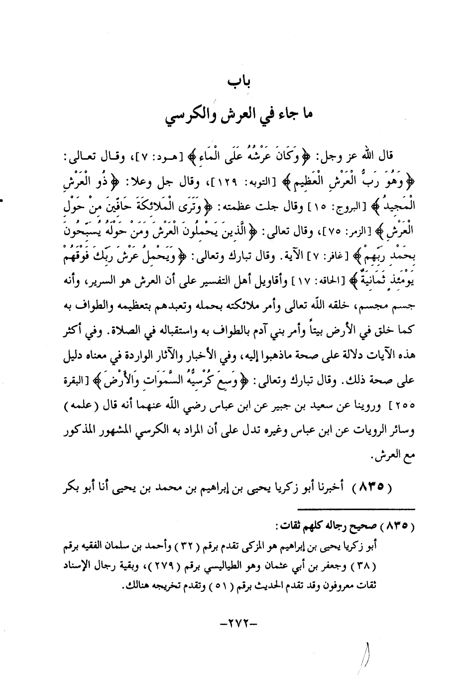 §بَابُ مَا جَاءَ فِي الْعَرْشِ وَالْكُرْسِيِّ قَالَ اللَّهُ عَزَّ وَجَلَّ: {وَكَانَ عَرْشُهُ عَلَى الْمَاءِ} [هود: 7] ، وَقَالَ تَعَالَى: {وَهُوَ رَبُّ الْعَرْشِ الْعَظِيمِ} [التوبة: 129] ، وَقَالَ جَلَّ وَعَلَا: {ذُو الْعَرْشِ الْمَجِيدُ} [البروج: 15] ، وَقَالَ جَلَّتْ عَظَمَتُهُ: {وَتَرَى الْمَلَائِكَةَ حَافِّينَ مِنْ حَوْلِ الْعَرْشِ} [الزمر: 75] ، وَقَالَ تَعَالَى: {الَّذِينَ يَحْمِلُونَ الْعَرْشَ وَمَنْ حَوْلَهُ يُسَبِّحُونَ بِحَمْدِ رَبِّهِمْ} [غافر: 7] الْآيَةُ. وَقَالَ تَبَارَكَ وَتَعَالَى: {وَيَحْمِلُ عَرْشَ رَبِّكَ فَوْقَهُمْ يَوْمَئِذٍ ثَمَانِيَةٌ} [الحاقة: 17] وَأَقَاوِيلُ أَهْلِ التَّفْسِيرِ عَلَى أَنَّ الْعَرْشَ هُوَ السَّرِيرُ، وَأَنَّهُ جِسْمٌ مُجَسَّمٌ، خَلَقَهُ اللَّهُ تَعَالَى وَأَمَرَ مَلَائِكَتَهُ بِحَمْلِهِ وَتَعَبَّدَهُمْ بِتَعْظِيمِهِ وَالطَّوَافِ بِهِ، كَمَا خَلَقَ فِي الْأَرْضِ بَيْتًا وَأَمَرَ بَنِي آدَمَ بِالطَّوَافِ بِهِ وَاسْتِقْبَالِهِ فِي الصَّلَاةِ. وَفِي أَكْثَرِ هَذِهِ الْآيَاتِ دَلَالَةٌ عَلَى صِحَّةِ مَا ذَهَبُوا إِلَيْهِ، وَفِي الْأَخْبَارِ وَالْآثَارِ الْوَارِدَةِ فِي مَعْنَاهُ دَلِيلٌ عَلَى صِحَّةِ ذَلِكَ. وَقَالَ تَبَارَكَ وَتَعَالَى: {وَسِعَ كُرْسِيُّهُ السَّمَاوَاتِ وَالْأَرْضَ} [البقرة: 255] . وَرُوِّينَا عَنْ سَعِيدِ بْنِ جُبَيْرٍ، عَنِ ابْنِ عَبَّاسٍ رَضِيَ اللَّهُ عَنْهُمَا أَنَّهُ قَالَ: عِلْمُهُ. وَسَائِرُ الرِّوَايَاتِ عَنِ ابْنِ عَبَّاسٍ وَغَيْرِهِ تَدُلُّ عَلَى أَنَّ الْمُرَادَ بِهِ الْكُرْسِيُّ الْمَشْهُورُ الْمَذْكُورُ مَعَ الْعَرْشِ