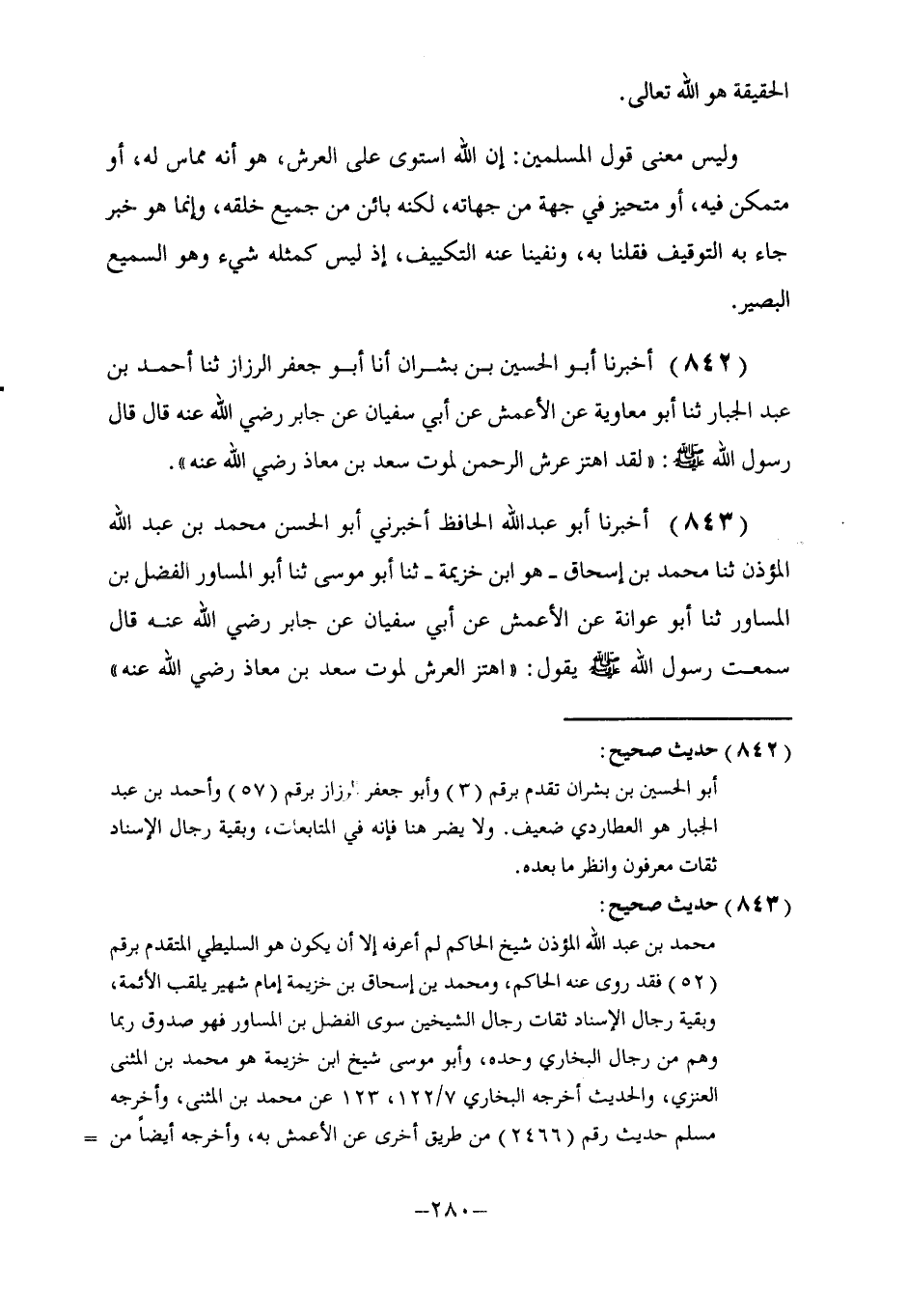 843 - أَخْبَرَنَا أَبُو عَبْدِ اللَّهِ الْحَافِظُ، أَخْبَرَنِي أَبُو الْحَسَنِ مُحَمَّدُ بْنُ عَبْدِ اللَّهِ الْمُؤَذِّنُ، ثنا مُحَمَّدُ بْنُ إِسْحَاقَ هُوَ ابْنُ خُزَيْمَةَ، ثنا أَبُو مُوسَى، ثنا أَبُو الْمُسَاوِرِ الْفَضْلُ بْنُ الْمُسَاوِرِ، ثنا أَبُو عَوَانَةَ، عَنِ الْأَعْمَشِ، عَنْ أَبِي سُفْيَانَ، عَنْ جَابِرٍ، رَضِيَ اللَّهُ عَنْهُ قَالَ: سَمِعْتُ رَسُولَ اللَّهِ صَلَّى اللهُ عَلَيْهِ وَسَلَّمَ يَقُولُ: §«اهْتَزَّ الْعَرْشُ لِمَوْتِ سَعْدِ بْنِ مُعَاذٍ رَضِيَ اللَّهُ عَنْهُ»