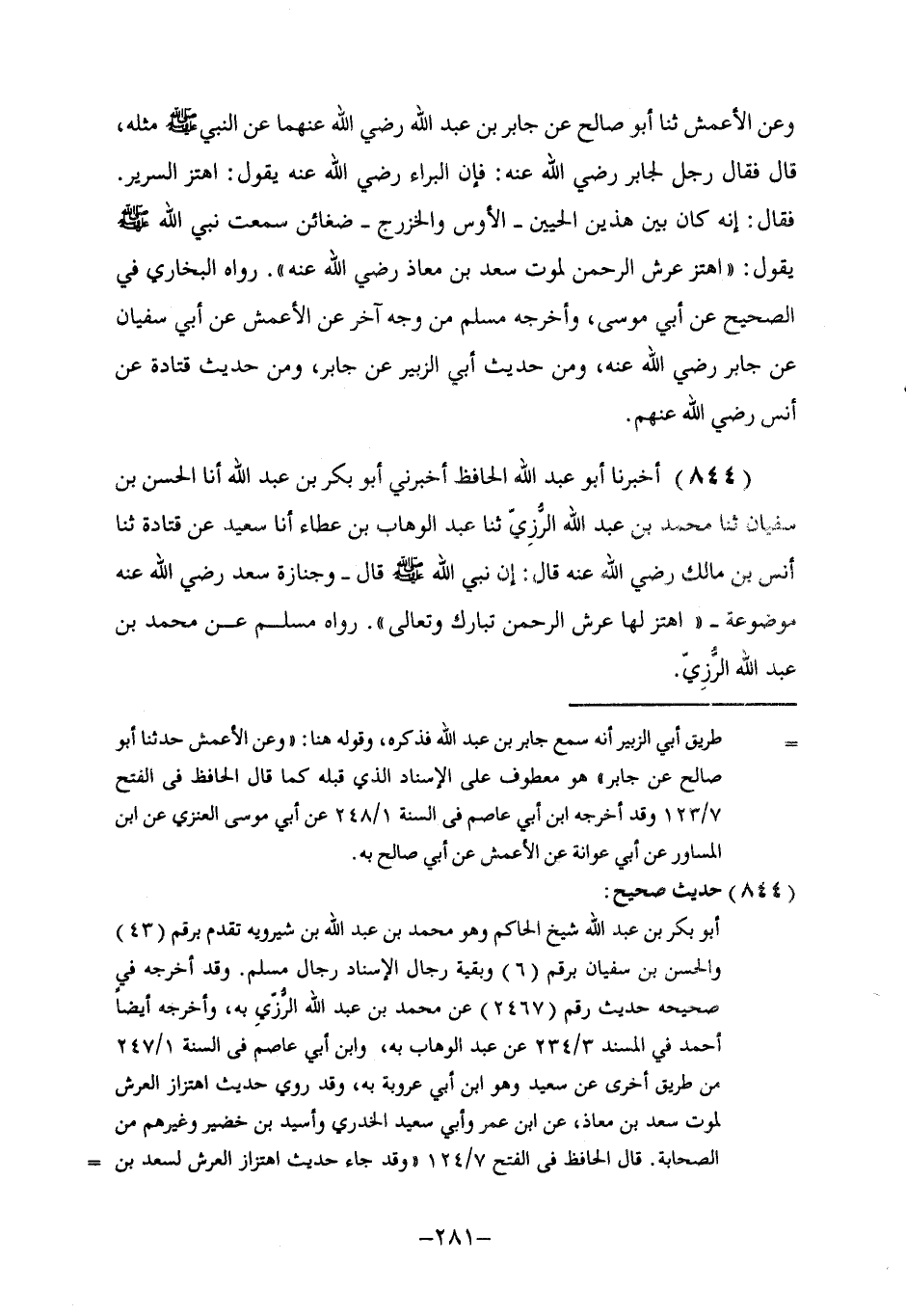 وَعَنِ الْأَعْمَشِ، ثنا أَبُو صَالِحٍ، عَنْ جَابِرِ بْنِ عَبْدِ اللَّهِ رَضِيَ اللَّهُ عَنْهُمَا عَنِ النَّبِيِّ صَلَّى اللهُ عَلَيْهِ وَسَلَّمَ مِثْلَهُ. قَالَ: فَقَالَ رَجُلٌ لِجَابِرٍ رَضِيَ اللَّهُ عَنْهُ: فَإِنَّ الْبَرَاءَ رَضِيَ اللَّهُ عَنْهُ يَقُولُ: اهْتَزَّ السَّرِيرُ. فَقَالَ: إِنَّهُ كَانَ بَيْنَ هَذَيْنِ الْحَيَّيْنِ ـ الْأَوْسِ وَالْخَزْرَجِ ـ ضَغَائِنُ، سَمِعْتُ نَبِيَّ اللَّهِ صَلَّى اللهُ عَلَيْهِ وَسَلَّمَ يَقُولُ: §«اهْتَزَّ عَرْشُ الرَّحْمَنِ لِمَوْتِ سَعْدِ بْنِ مُعَاذٍ رَضِيَ اللَّهُ عَنْهُ» . رَوَاهُ الْبُخَارِيُّ فِي الصَّحِيحِ عَنْ أَبِي مُوسَى، وَأَخْرَجَهُ مُسْلِمٌ مِنْ وَجْهٍ آخَرَ عَنِ الْأَعْمَشِ عَنْ أَبِي سُفْيَانَ عَنْ جَابِرٍ رَضِيَ اللَّهُ عَنْهُ، وَمِنْ حَدِيثِ أَبِي الزُّبَيْرِ عَنْ جَابِرٍ، وَمِنْ حَدِيثِ قَتَادَةَ عَنْ أَنَسٍ رَضِيَ اللَّهُ عَنْهُمْ