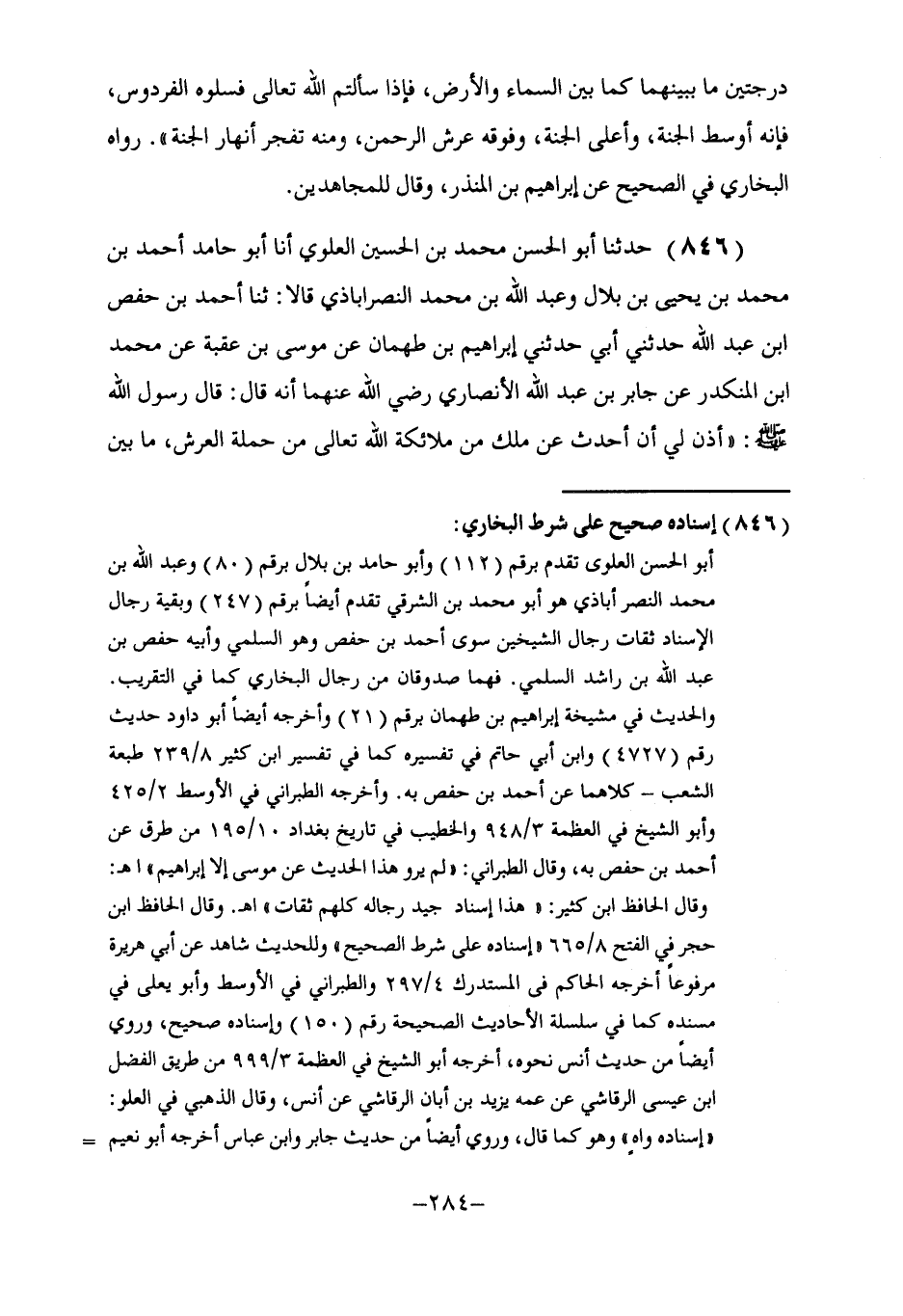 846 - حَدَّثَنَا أَبُو الْحَسَنِ مُحَمَّدُ بْنُ الْحُسَيْنِ الْعَلَوِيُّ، أنا أَبُو حَامِدٍ أَحْمَدُ بْنُ مُحَمَّدِ بْنِ يَحْيَى بْنِ بِلَالٍ، وَعَبْدُ اللَّهِ بْنُ مُحَمَّدٍ النَّصْرَابَاذِيُّ قَالَا: ثنا أَحْمَدُ بْنُ حَفْصِ بْنِ عَبْدِ اللَّهِ، حَدَّثَنِي أَبِي، حَدَّثَنِي إِبْرَاهِيمُ بْنُ طَهْمَانَ، عَنْ مُوسَى بْنِ عُقْبَةَ، عَنْ مُحَمَّدِ بْنِ الْمُنْكَدِرِ، عَنْ جَابِرِ بْنِ عَبْدِ اللَّهِ الْأَنْصَارِيِّ، رَضِيَ اللَّهُ عَنْهُمَا أَنَّهُ قَالَ: قَالَ رَسُولُ اللَّهِ صَلَّى اللهُ عَلَيْهِ وَسَلَّمَ: §«أُذِنَ لِي أَنْ أُحَدِّثَ عَنْ مَلَكٍ مِنْ مَلَائِكَةِ اللَّهِ تَعَالَى مِنْ حَمَلَةِ الْعَرْشِ، مَا بَيْنَ -[285]- شَحْمَةِ أُذُنِهِ إِلَى عَاتِقِهِ مَسِيرَةُ سَبْعِمِائَةِ عَامٍ»