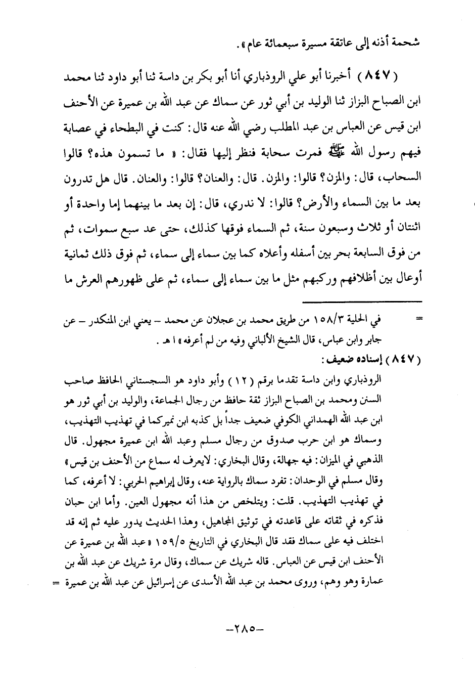 847 - أَخْبَرَنَا أَبُو عَلِيٍّ الرُّوذْبَارِيُّ، أنا أَبُو بَكْرِ بْنُ دَاسَةَ، ثنا أَبُو دَاوُدَ، ثنا مُحَمَّدُ بْنُ الصَّبَّاحِ الْبَزَّازُ، ثنا الْوَلِيدُ بْنُ أَبِي ثَوْرٍ، عَنْ سِمَاكٍ، عَنْ عَبْدِ اللَّهِ بْنِ عَمِيرَةَ، عَنِ الْأَحْنَفِ بْنِ قَيْسٍ، عَنِ الْعَبَّاسِ بْنِ عَبْدِ الْمُطَّلِبِ، رَضِيَ اللَّهُ عَنْهُ قَالَ: كُنْتُ فِي الْبَطْحَاءِ فِي عِصَابَةٍ فِيهِمْ رَسُولُ اللَّهِ صَلَّى اللهُ عَلَيْهِ وَسَلَّمَ، فَمَرَّتْ سَحَابَةٌ فَنَظَرَ إِلَيْهَا فَقَالَ: «مَا تُسَمُّونَ هَذِهِ؟» قَالُوا: السَّحَابَ، قَالَ: «وَالْمُزْنَ؟» قَالُوا: وَالْمُزْنَ. قَالَ: «وَالْعَنَانَ؟» قَالُوا: وَالْعَنَانَ. قَالَ: §«هَلْ تَدْرُونَ بُعْدَ مَا بَيْنَ السَّمَاءِ وَالْأَرْضِ؟» قَالُوا: لَا نَدْرِي. قَالَ: «إِنَّ بُعْدَ مَا بَيْنَهُمَا إِمَّا وَاحِدَةٌ أَوِ اثْنَتَانِ أَوْ ثَلَاثٌ وَسَبْعُونَ سَنَةً، ثُمَّ السَّمَاءُ فَوْقَهَا كَذَلِكَ، حَتَّى عَدَّ سَبْعَ سَمَاوَاتٍ، ثُمَّ مِنْ فَوْقِ السَّابِعَةِ بَحْرٌ بَيْنَ أَسْفَلِهِ وَأَعْلَاهُ كَمَا بَيْنَ سَمَاءٍ إِلَى سَمَاءٍ، ثُمَّ فَوْقَ ذَلِكَ ثَمَانِيَةُ أَوْعَالٍ بَيْنَ أَظْلَافِهِمْ وَرُكَبِهِمْ مِثْلُ مَا بَيْنَ سَمَاءٍ إِلَى سَمَاءٍ، ثُمَّ عَلَى ظُهُورِهِمُ الْعَرْشُ مَا -[286]- بَيْنَ أَسْفَلِهِ وَأَعْلَاهُ مِثْلُ مَا بَيْنَ سَمَاءٍ إِلَى سَمَاءٍ، ثُمَّ اللَّهُ تَبَارَكَ وَتَعَالَى جَلَّ ثَنَاؤُهُ فَوْقَ ذَلِكَ» . قَالَ أَبُو دَاوُدَ: وَحَدَّثَنَا أَحْمَدُ بْنُ حَفْصٍ قَالَ: حَدَّثَنِي أَبِي، عَنْ إِبْرَاهِيمَ بْنِ طَهْمَانَ، عَنْ سِمَاكٍ بِإِسْنَادِهِ وَمَعْنَاهُ