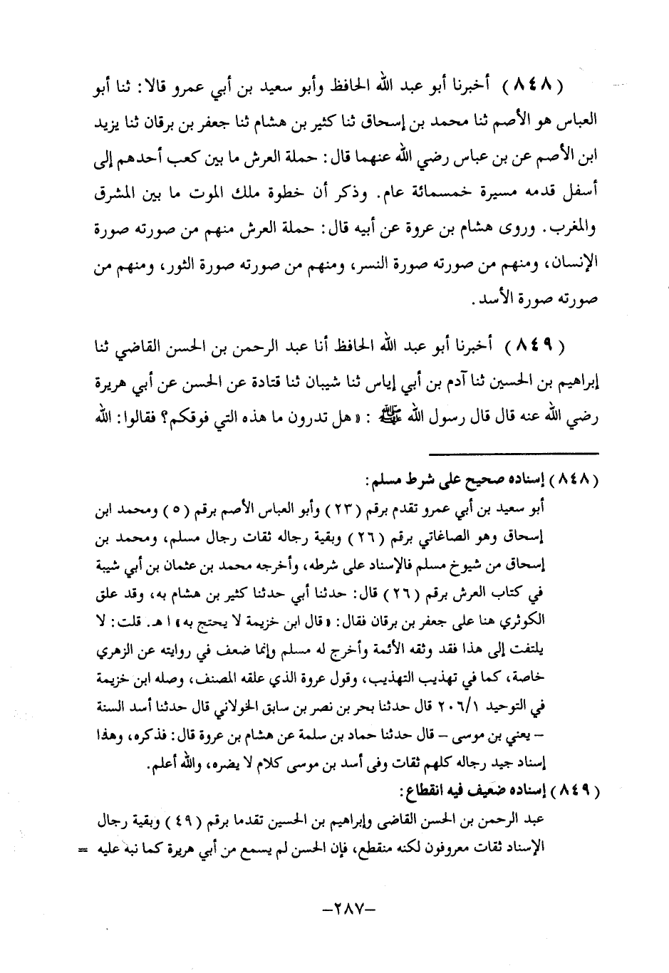 848 - أَخْبَرَنَا أَبُو عَبْدِ اللَّهِ الْحَافِظُ، وَأَبُو سَعِيدِ بْنُ أَبِي عَمْرٍو قَالَا: ثنا أَبُو الْعَبَّاسِ هُوَ الْأَصَمُّ، ثنا مُحَمَّدُ بْنُ إِسْحَاقَ، ثنا كَثِيرُ بْنُ هِشَامٍ، ثنا جَعْفَرُ بْنُ بُرْقَانَ، ثنا يَزِيدُ بْنُ الْأَصَمِّ، عَنِ ابْنِ عَبَّاسٍ، رَضِيَ اللَّهُ عَنْهُمَا قَالَ: §حَمَلَةُ الْعَرْشِ مَا بَيْنَ كَعْبِ أَحَدِهِمْ إِلَى أَسْفَلِ قَدَمِهِ مَسِيرَةُ خَمْسِمِائَةِ عَامٍ. وَذَكَرَ أَنَّ خُطْوَةَ مَلَكِ الْمَوْتِ مَا بَيْنَ الْمَشْرِقِ وَالْمَغْرِبِ. وَرَوَى هِشَامُ بْنُ عُرْوَةَ عَنْ أَبِيهِ قَالَ: حَمَلَةُ الْعَرْشِ مِنْهُمْ مَنْ صُورَتُهُ صُورَةُ الْإِنْسَانِ، وَمِنْهُمْ مَنْ صُورَتُهِ صُورَةُ النَّسْرِ، وَمِنْهُمْ مَنْ صُورَتُهُ صُورَةُ الثَّوْرِ، وَمِنْهُمْ مَنْ صُورَتُهُ صُورَةُ الْأَسَدِ