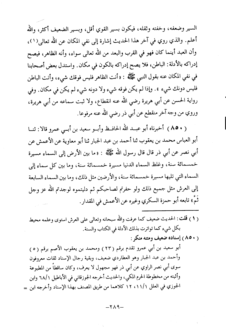 850 - أَخْبَرَنَاهُ أَبُو عَبْدِ اللَّهِ الْحَافِظُ، وَأَبُو سَعِيدِ بْنُ أَبِي عَمْرٍو قَالَا: ثنا أَبُو الْعَبَّاسِ مُحَمَّدُ بْنُ يَعْقُوبَ، ثنا أَحْمَدُ بْنُ عَبْدِ الْجَبَّارِ، ثنا أَبُو مُعَاوِيَةَ، عَنِ الْأَعْمَشِ، عَنْ أَبِي نَصْرٍ، عَنْ أَبِي ذَرٍّ، قَالَ: قَالَ رَسُولُ اللَّهِ صَلَّى اللهُ عَلَيْهِ وَسَلَّمَ: «§مَا بَيْنَ الْأَرْضِ إِلَى السَّمَاءِ مَسِيرَةُ خَمْسِمِائَةِ سَنَةٍ، وَغِلَظُ السَّمَاءِ الدُّنْيَا مَسِيرَةُ خَمْسِمِائَةِ سَنَةٍ، وَمَا بَيْنَ كُلِّ سَمَاءٍ إِلَى السَّمَاءِ الَّتِي تَلِيهَا مَسِيرَةُ خَمْسِمِائَةِ سَنَةٍ، وَالْأَرَضِينَ مِثْلُ ذَلِكَ، وَمَا بَيْنَ السَّمَاءِ السَّابِعَةِ إِلَى الْعَرْشِ مِثْلُ جَمِيعِ ذَلِكَ وَلَوْ حَفَرْتُمْ لِصَاحِبِكُمْ ثُمَّ دَلَّيْتُمُوهُ لَوَجَدْتُمُ اللَّهَ عَزَّ وَجَلَّ ثَمَّ» . تَابَعَهُ أَبُو حَمْزَةَ السُّكَّرِيُّ وَغَيْرُهُ عَنِ الْأَعْمَشِ فِي الْمِقْدَارِ