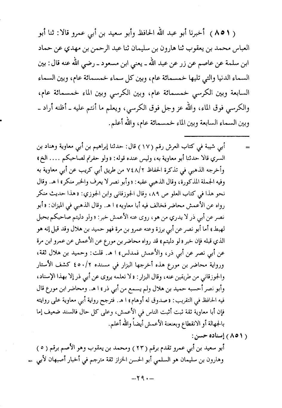 851 - أَخْبَرَنَا أَبُو عَبْدِ اللَّهِ الْحَافِظُ، وَأَبُو سَعِيدِ بْنُ أَبِي عَمْرٍو قَالَا: ثنا أَبُو الْعَبَّاسِ مُحَمَّدُ بْنُ يَعْقُوبَ، ثنا هَارُونُ بْنُ سُلَيْمَانَ، ثنا عَبْدُ الرَّحْمَنِ بْنُ مَهْدِيٍّ، عَنْ حَمَّادِ بْنِ سَلَمَةَ، عَنْ عَاصِمٍ، عَنْ زِرٍّ، عَنْ عَبْدِ اللَّهِ يَعْنِي ابْنَ مَسْعُودٍ رَضِيَ اللَّهُ عَنْهُ قَالَ: §بَيْنَ السَّمَاءِ الدُّنْيَا وَالَّتِي تَلِيهَا خَمْسِمِائَةِ عَامٍ، وَبَيْنَ كُلِّ سَمَاءٍ خَمْسِمِائَةِ عَامٍ، وَبَيْنَ السَّمَاءِ السَّابِعَةِ وَبَيْنَ الْكُرْسِيِّ خَمْسِمِائَةُ عَامٍ، وَبَيْنَ الْكُرْسِيِّ وَبَيْنَ الْمَاءِ خَمْسِمِائَةِ عَامٍ، وَالْكُرْسِيُّ فَوْقَ الْمَاءِ، وَاللَّهُ عَزَّ وَجَلَّ فَوْقَ الْكُرْسِيِّ، وَيَعْلَمُ مَا أَنْتُمْ عَلَيْهِ ـ أَظُنُّهُ أَرَادَ ـ وَبَيْنَ السَّمَاءِ السَّابِعَةِ وَبَيْنَ الْمَاءِ خَمْسِمِائَةِ عَامٍ، وَاللَّهُ أَعْلَمُ