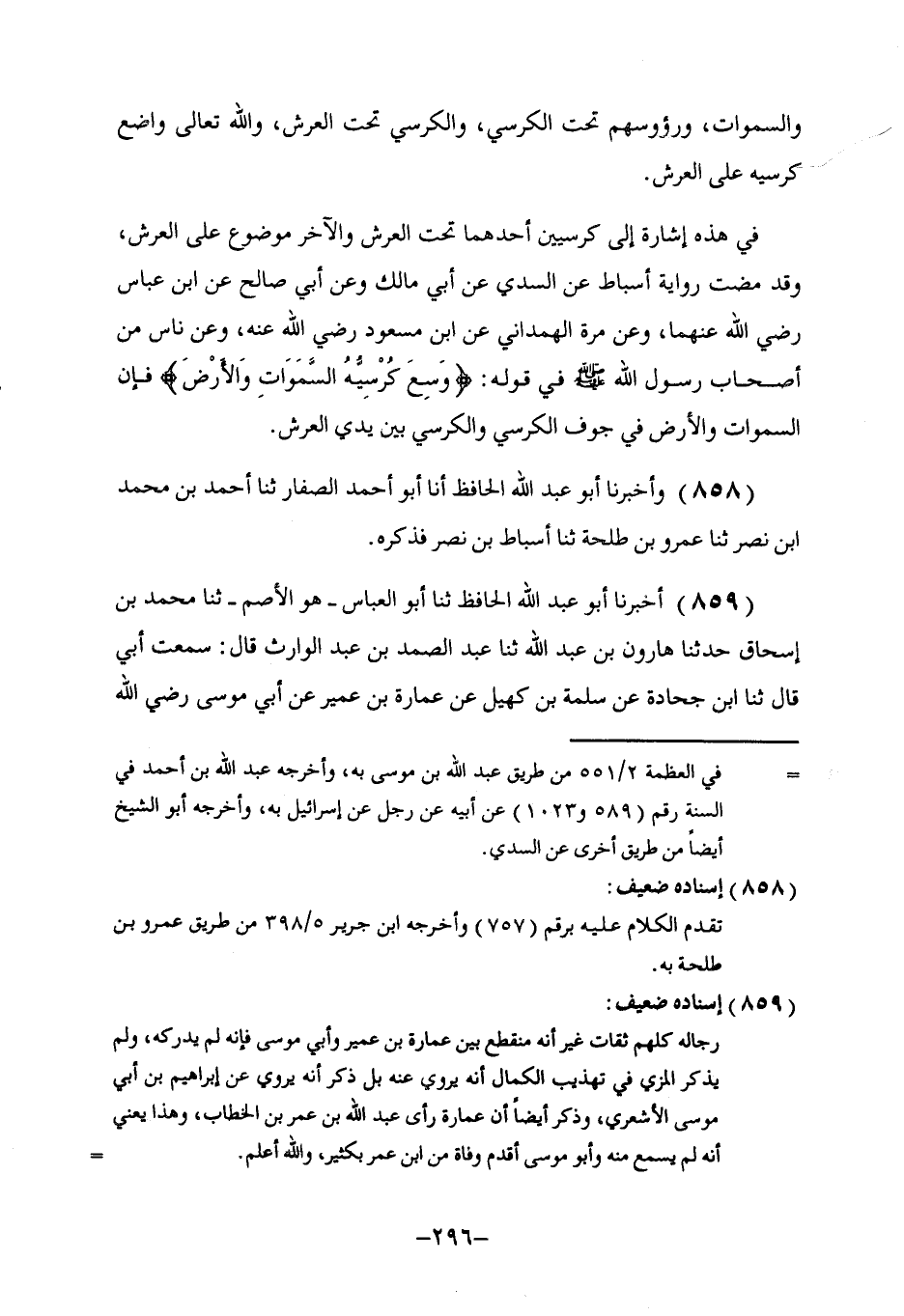 859 - أَخْبَرَنَا أَبُو عَبْدِ اللَّهِ الْحَافِظُ، ثنا أَبُو الْعَبَّاسِ هُوَ الْأَصَمُّ، ثنا مُحَمَّدُ بْنُ إِسْحَاقَ، حَدَّثَنَا هَارُونُ بْنُ عَبْدِ اللَّهِ، ثنا عَبْدُ الصَّمَدِ بْنُ عَبْدِ الْوَارِثِ، قَالَ: سَمِعْتُ أَبِي قَالَ: ثنا ابْنُ جُحَادَةَ، عَنْ سَلَمَةَ بْنِ كُهَيْلٍ، عَنْ عُمَارَةَ بْنِ عُمَيْرٍ، عَنْ أَبِي مُوسَى، رَضِيَ اللَّهُ -[297]- عَنْهُ قَالَ: §الْكُرْسِيُّ مَوْضِعُ الْقَدَمَيْنِ وَلَهُ أَطِيطٌ كَأَطِيطِ الرَّحْلِ. قَدْ رُوِّينَا فِي هَذَا أَيْضًا عَنِ ابْنِ عَبَّاسٍ رَضِيَ اللَّهُ عَنْهُمَا، وَذَكَرَنَا أَنَّ مَعْنَاهُ فِيمَا نَرَى أَنَّهُ مَوْضُوعٌ مِنَ الْعَرْشِ مَوْضِعَ الْقَدَمَيْنِ مِنَ السَّرِيرِ، وَلَيْسَ فِيهِ إِثْبَاتُ الْمَكَانِ لِلَّهِ سُبْحَانَهُ