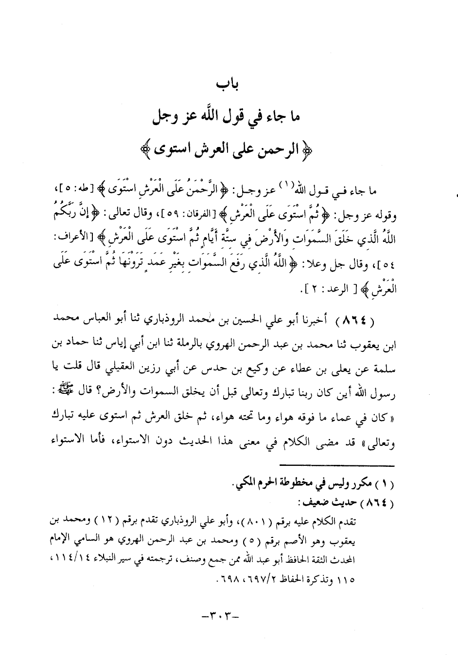 §بَابُ مَا جَاءَ فِي قَوْلِ اللَّهِ عَزَّ وَجَلَّ {الرَّحْمَنُ عَلَى الْعَرْشِ اسْتَوَى} [طه: 5] مَا جَاءَ فِي قَوْلِ اللَّهِ عَزَّ وَجَلَّ: {الرَّحْمَنُ عَلَى الْعَرْشِ اسْتَوَى} [طه: 5] ، وَقَوْلُهُ عَزَّ وَجَلَّ: {ثُمَّ اسْتَوَى عَلَى الْعَرْشِ} [الأعراف: 54] ، وَقَالَ تَعَالَى: {إِنَّ رَبَّكُمُ اللَّهُ الَّذِي خَلَقَ السَّمَاوَاتِ وَالْأَرْضَ فِي سِتَّةِ أَيَّامٍ ثُمَّ اسْتَوَى عَلَى الْعَرْشِ} [الأعراف: 54] ، وَقَالَ جَلَّ وَعَلَا: {اللَّهُ الَّذِي رَفَعَ السَّمَاوَاتِ بِغَيْرِ عَمَدٍ تَرَوْنَهَا ثُمَّ اسْتَوَى عَلَى الْعَرْشِ} [الرعد: 2] .