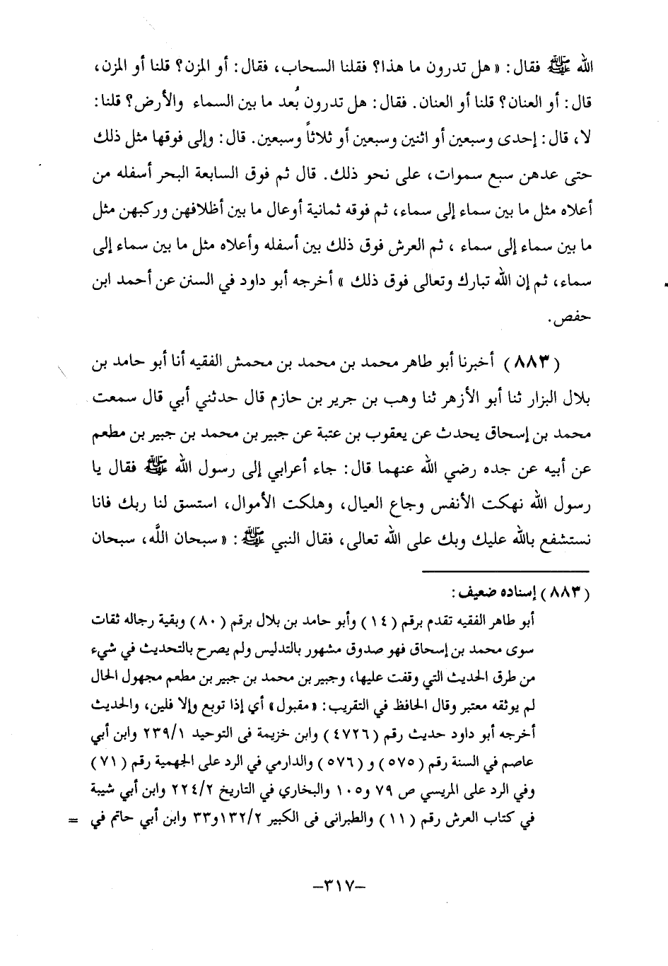 883 - أَخْبَرَنَا أَبُو طَاهِرٍ مُحَمَّدُ بْنُ مُحَمَّدِ بْنِ مَحْمَشٍ الْفَقِيهُ، أنا أَبُو حَامِدِ بْنُ بِلَالٍ الْبَزَّار، ثنا أَبُو الْأَزْهَرِ، ثنا وَهْبُ بْنُ جَرِيرِ بْنِ حَازِمٍ، قَالَ: حَدَّثَنِي أَبِي قَالَ: سَمِعْتُ مُحَمَّدَ بْنَ إِسْحَاقَ، يُحَدِّثُ عَنْ يَعْقُوبَ بْنِ عُتْبَةَ، عَنْ جُبَيْرِ بْنِ مُحَمَّدِ بْنِ جُبَيْرِ بْنِ مُطْعِمٍ، عَنْ أَبِيهِ، عَنْ جَدِّهِ رَضِيَ اللَّهُ عَنْهُمَا قَالَ: جَاءَ أَعْرَابِيٌّ إِلَى رَسُولِ اللَّهِ صَلَّى اللهُ عَلَيْهِ وَسَلَّمَ فَقَالَ: يَا رَسُولَ اللَّهِ نُهِكَتِ الْأَنْفُسُ وَجَاعَ الْعِيَالُ وَهَلَكَتِ الْأَمْوَالُ، اسْتَسْقِ لَنَا رَبَّكَ، فَإِنَّا نَسْتَشْفِعُ بِاللَّهِ عَلَيْكَ وَبِكَ عَلَى اللَّهِ تَعَالَى. فَقَالَ النَّبِيُّ صَلَّى اللهُ عَلَيْهِ وَسَلَّمَ: «سُبْحَانَ اللَّهِ، سُبْحَانَ -[318]- اللَّهِ» . فَمَا زَالَ يُسَبِّحُ حَتَّى عُرِفَ ذَلِكَ فِي وَجُوهِ أَصْحَابِهِ رَضِيَ اللَّهُ عَنْهُمْ، فَقَالَ: «وَيْحَكَ، أَتَدْرِي مَا اللَّهُ؟ إِنَّ شَأْنَهُ أَعْظَمُ مِنْ ذَلِكَ، إِنَّهُ §لَا يُسْتَشْفَعُ بِهِ عَلَى أَحَدٍ، إِنَّهُ لَفَوْقَ سَمَاوَاتِهِ عَلَى عَرْشِهِ، وَإِنَّهُ عَلَيْهِ لَهَكَذَا ـ وَأَشَارَ وَهْبٌ بِيَدِهِ مِثْلَ الْقُبَّةِ، وَأَشَارَ أَبُو الْأَزْهَرِ بِيَدِهِ مِثْلَ الْقُبَّةِ ـ وَإِنَّهُ لَيَئِطُّ بِهِ أَطِيطَ الرَّحْلِ بِالرَّاكِبِ» . أَخْرَجَهُ أَبُو دَاوُدَ فِي كِتَابِ السُّنَنِ. -[319]-