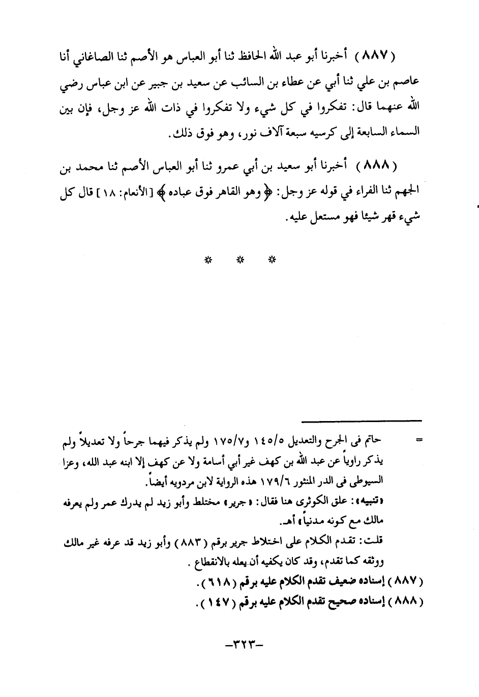 887 - أَخْبَرَنَا أَبُو عَبْدِ اللَّهِ الْحَافِظُ، ثنا أَبُو الْعَبَّاسِ هُوَ الْأَصَمُّ، ثنا الصَّاغَانِيُّ، أنا عَاصِمُ بْنُ عَلِيٍّ، ثَنَا أَبِي، عَنْ عَطَاءِ بْنِ السَّائِبِ، عَنْ سَعِيدِ بْنِ جُبَيْرٍ، عَنِ ابْنِ عَبَّاسٍ، رَضِيَ عَنْهُمَا، قَالَ: §تَفَكَّرُوا فِي كُلِّ شَيْءٍ، وَلَا تَفَكَّرُوا فِي ذَاتِ اللَّهِ عَزَّ وَجَلَّ، فَإِنَّ بَيْنَ السَّمَاءِ السَّابِعَةِ إِلَى كُرْسِيِّهِ سَبْعَةُ آلَافِ نُورٍ، وَهُوَ فَوْقَ ذَلِكَ