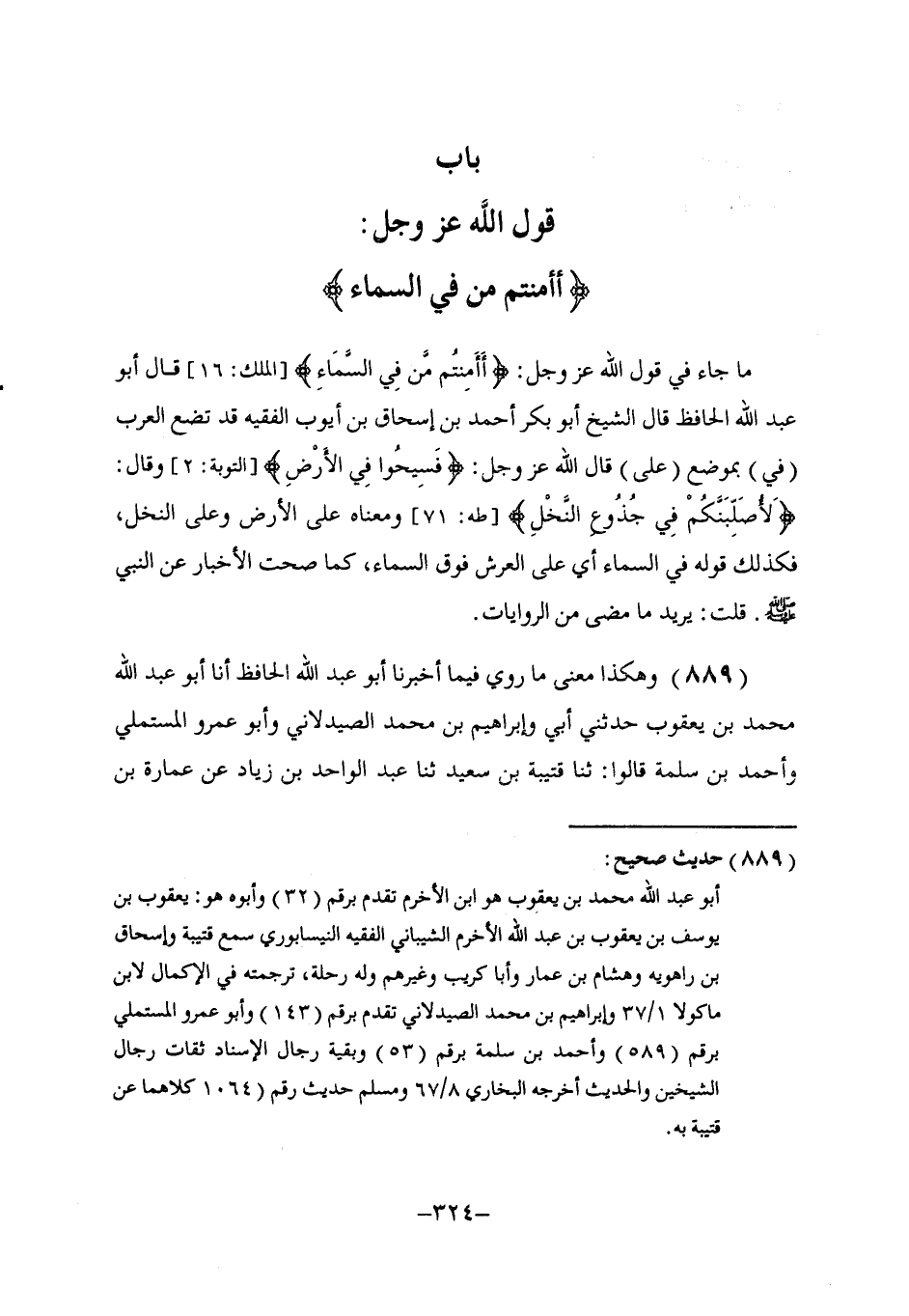 §بَابُ قَوْلِ اللَّهِ عَزَّ وَجَلَّ: {أَأَمِنْتُمْ مَنْ فِي السَّمَاءِ} [الملك: 16] مَا جَاءَ فِي قَوْلِ اللَّهِ عَزَّ وَجَلَّ: {أَأَمِنْتُمْ مَنْ فِي السَّمَاءِ} [الملك: 16] . قَالَ أَبُو عَبْدِ اللَّهِ الْحَافِظُ: قَالَ الشَّيْخُ أَبُو بَكْرٍ أَحْمَدُ بْنُ إِسْحَاقَ بْنِ أَيُّوبَ الْفَقِيهُ: «قَدْ تَضَعُ الْعَرَبُ» فِي «بِمَوْضِعِ» عَلَى " قَالَ اللَّهُ عَزَّ وَجَلَّ: {فَسِيحُوا فِي الْأَرْضِ} [التوبة: 2] وَقَالَ: {لَأُصَلِّبَنَّكُمْ فِي جُذُوعِ النَّخْلِ} [طه: 71] وَمَعْنَاهُ: عَلَى الْأَرْضِ وَعَلَى النَّخْلِ، فَكَذَلِكَ قَوْلُهُ: {فِي السَّمَاءِ} [البقرة: 144] أَيْ عَلَى الْعَرْشِ فَوْقَ السَّمَاءِ، كَمَا صَحَّتِ الْأَخْبَارُ عَنِ النَّبِيِّ صَلَّى اللهُ عَلَيْهِ وَسَلَّمَ. قُلْتُ: يُرِيدُ مَا مَضَى مِنَ الرِّوَايَاتِ "