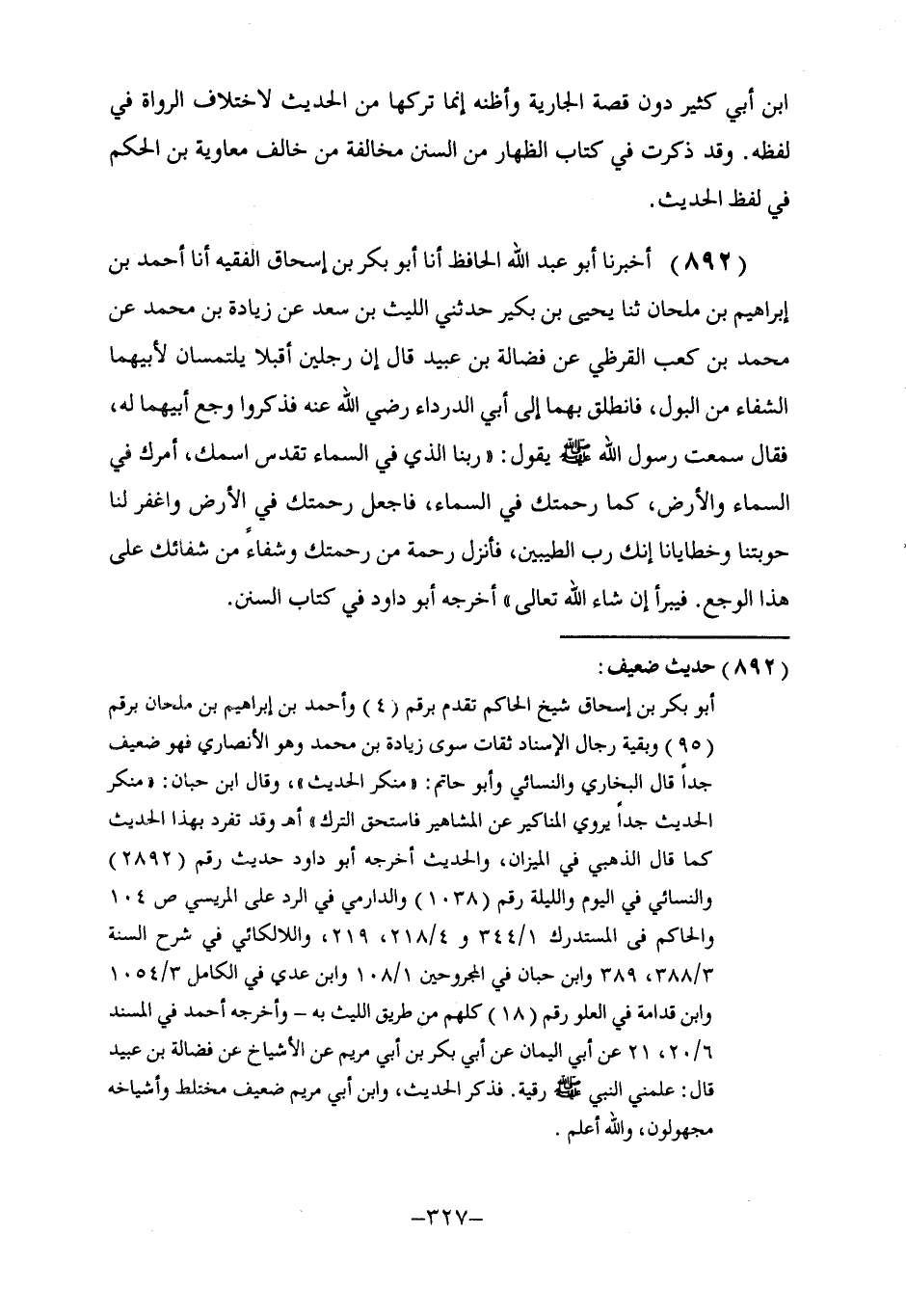 892 - أَخْبَرَنَا أَبُو عَبْدِ اللَّهِ الْحَافِظُ، أنا أَبُو بَكْرِ بْنُ إِسْحَاقَ الْفَقِيهُ، أنا أَحْمَدُ بْنُ إِبْرَاهِيمَ بْنِ مِلْحَانَ، ثنا يَحْيَى بْنُ بُكَيْرٍ، حَدَّثَنِي اللَّيْثُ بْنُ سَعْدٍ، عَنْ زِيَادَةَ بْنِ مُحَمَّدٍ، عَنْ مُحَمَّدِ بْنِ كَعْبٍ الْقُرَظِيِّ، عَنْ فَضَالَةَ بْنِ عُبَيْدٍ، قَالَ: إِنَّ رَجُلَيْنِ أَقْبَلَا يَلْتَمِسَانِ لِأَبِيهِمَا الشِّفَاءَ مِنَ الْبَوْلِ، فَانْطُلِقَ بِهِمَا إِلَى أَبِي الدَّرْدَاءِ رَضِيَ اللَّهُ عَنْهُ، فَذَكَرُوا وَجَعَ أَبِيهِمَا لَهُ، فَقَالَ: سَمِعْتُ رَسُولَ اللَّهِ صَلَّى اللهُ عَلَيْهِ وَسَلَّمَ يَقُولُ: «§رَبَّنَا الَّذِي فِي السَّمَاءِ تَقَدَّسَ اسْمُكَ، أَمَرُكَ فِي السَّمَاءِ وَالْأَرْضِ، كَمَا رَحْمَتُكَ فِي السَّمَاءِ فَاجْعَلْ رَحْمَتَكَ فِي الْأَرْضِ، وَاغْفِرْ لَنَا حَوْبَتَنَا وَخَطَايَانَا إِنَّكَ رَبُّ الطَّيِّبِينَ، فَأَنْزِلْ رَحْمَةً مِنْ رَحْمَتِكَ وَشِفَاءً مِنْ شِفَائِكَ عَلَى هَذَا الْوَجَعِ. فَيَبْرَأُ إِنْ شَاءَ اللَّهُ تَعَالَى» . أَخْرَجَهُ أَبُو دَاوُدَ فِي كِتَابِ السُّنَنِ