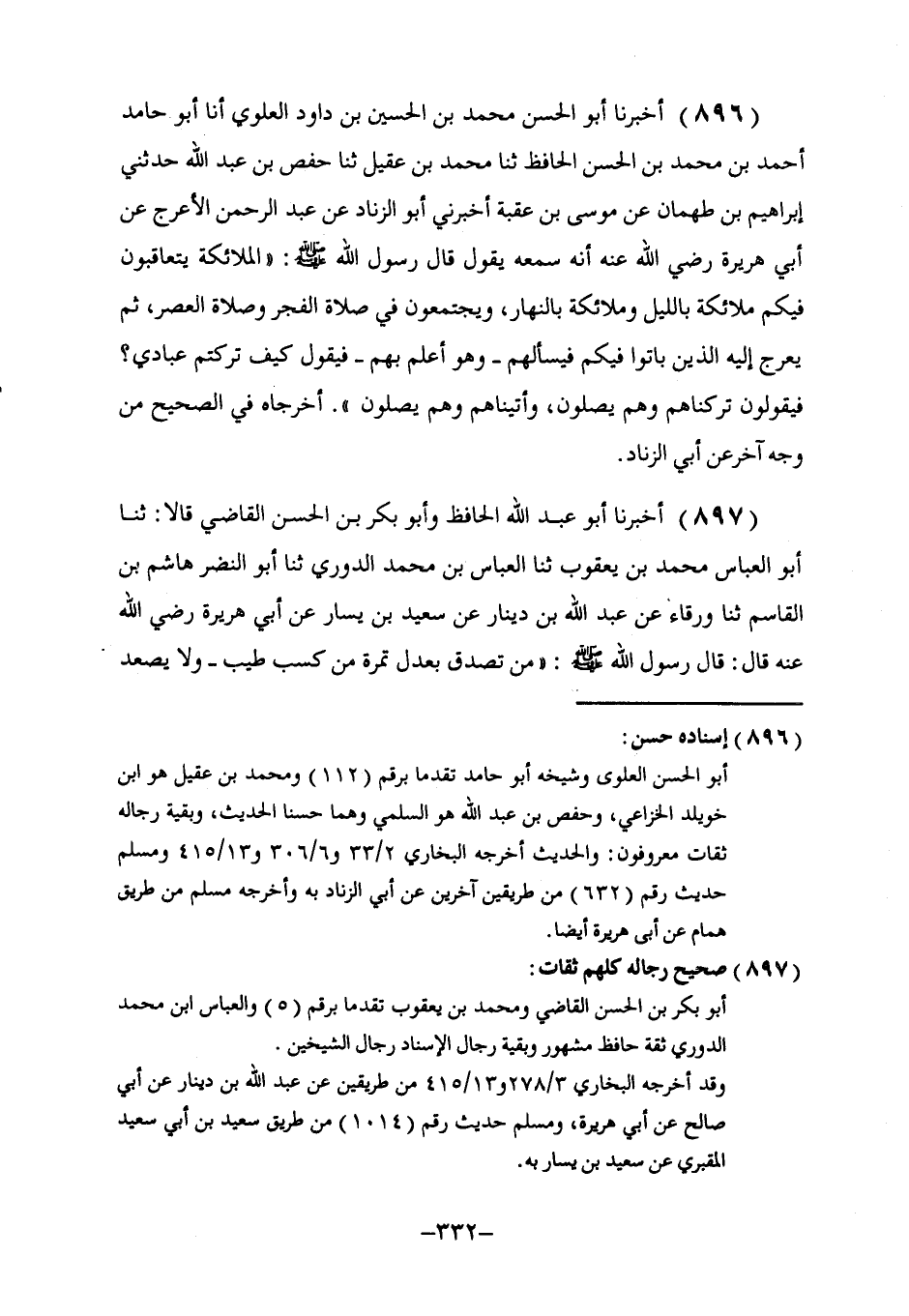 896 - أَخْبَرَنَا أَبُو الْحَسَنِ مُحَمَّدُ بْنُ الْحُسَيْنِ بْنِ دَاوُدَ الْعَلَوِيُّ، أنا أَبُو حَامِدٍ أَحْمَدُ بْنُ مُحَمَّدٍ بْنِ الْحَسَنِ الْحَافِظُ، ثنا مُحَمَّدُ بْنُ عَقِيلٍ، ثنا حَفْصُ بْنُ عَبْدِ اللَّهِ، حَدَّثَنِي إِبْرَاهِيمُ بْنُ طَهْمَانَ، عَنْ مُوسَى بْنِ عُقْبَةَ، أَخْبَرَنِي أَبُو الزِّنَادِ، عَنْ عَبْدِ الرَّحْمَنِ الْأَعْرَجِ، عَنْ أَبِي هُرَيْرَةَ، رَضِيَ اللَّهُ عَنْهُ أَنَّهُ سَمِعَهُ يَقُولُ: قَالَ رَسُولُ اللَّهِ صَلَّى اللهُ عَلَيْهِ وَسَلَّمَ: " §الْمَلَائِكَةُ يَتَعَاقَبُونَ فِيكُمْ مَلَائِكَةٌ بِاللَّيْلِ وَمَلَائِكَةٌ بِالنَّهَارِ، وَيَجْتَمِعُونَ فِي صَلَاةِ الْفَجْرِ وَصَلَاةِ الْعَصْرِ، ثُمَّ يَعْرُجُ إِلَيْهِ الَّذِينَ بَاتُوا فِيكُمْ فَيَسْأَلُهُمْ ـ وَهُوَ أَعْلَمُ بِهِمْ ـ فَيَقُولُ: كَيْفَ تَرَكْتُمْ عِبَادِي؟ فَيَقُولُونَ: تَرَكْنَاهُمْ وَهُمْ يُصَلُّونَ، وَأَتَيْنَاهُمْ وَهُمْ يُصَلُّونَ ". أَخْرَجَاهُ فِي الصَّحِيحِ مِنْ وَجْهٍ آخَرَ عَنْ أَبِي الزِّنَادِ
