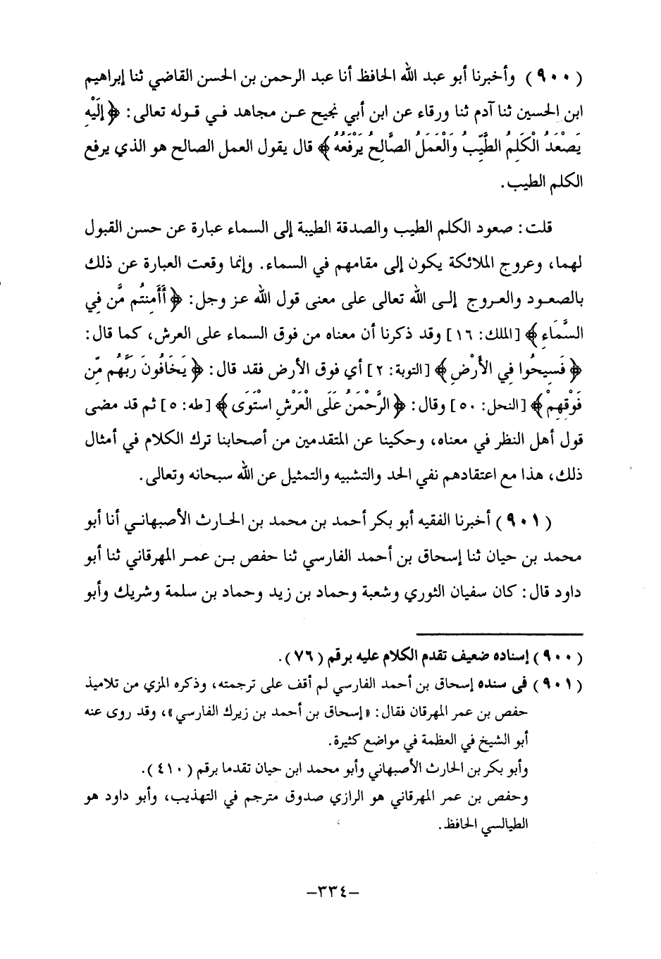 900 - وَأَخْبَرَنَا أَبُو عَبْدِ اللَّهِ الْحَافِظُ، أنا عَبْدُ الرَّحْمَنِ بْنُ الْحَسَنِ الْقَاضِي، ثنا إِبْرَاهِيمُ بْنُ الْحُسَيْنِ، ثنا آدَمُ، ثنا وَرْقَاءُ، عَنِ ابْنِ أَبِي نَجِيحٍ، عَنْ مُجَاهِدٍ، فِي قَوْلِهِ تَعَالَى: {إِلَيْهِ يَصْعَدُ الْكَلِمُ الطَّيِّبُ وَالْعَمَلُ الصَّالِحُ يَرْفَعُهُ} [فاطر: 10] قَالَ: يَقُولُ: §الْعَمَلُ الصَّالِحُ هُوَ الَّذِي يَرْفَعُ الْكَلِمَ الطَّيِّبَ. قُلْتُ: صُعُودُ الْكَلِمِ الطَّيِّبِ وَالصَّدَقَةِ الطَّيِّبَةِ إِلَى السَّمَاءِ عِبَارَةٌ عَنْ حُسْنِ الْقَبُولِ لَهُمَا، وَعُرُوجِ الْمَلَائِكَةِ يَكُونُ إِلَى مَقَامِهِمْ فِي السَّمَاءِ. وَإِنَّمَا وَقَعَتِ الْعِبَارَةُ عَنْ ذَلِكَ بِالصُّعُودِ وَالْعُرُوجِ إِلَى اللَّهِ تَعَالَى عَلَى مَعْنَى قَوْلِ اللَّهِ عَزَّ وَجَلَّ: {أَأَمِنْتُمْ مَنْ فِي السَّمَاءِ} [الملك: 16] وَقَدْ ذَكَرْنَا أَنَّ مَعْنَاهُ: مَنْ فَوْقِ السَّمَاءِ عَلَى الْعَرْشِ، كَمَا قَالَ: {فَسِيحُوا فِي الْأَرْضِ} [التوبة: 2] أَيْ: فَوْقَ الْأَرْضِ، فَقَدْ قَالَ: {يَخَافُونَ رَبَّهُمْ مِنْ فَوْقِهِمْ} [النحل: 50] وَقَالَ: {الرَّحْمَنُ عَلَى الْعَرْشِ اسْتَوَى} [طه: 5] ثُمَّ قَدْ مَضَى قَوْلُ أَهْلِ النَّظَرِ فِي مَعْنَاهُ، وَحَكَيْنَا عَنِ الْمُتَقَدِّمِينَ مِنْ أَصْحَابِنَا تَرْكَ الْكَلَامِ فِي أَمْثَالِ ذَلِكَ، هَذَا مَعَ اعْتِقَادِهِمْ نَفْيَ الْحَدِّ وَالتَّشْبِيهِ وَالتَّمْثِيلِ عَنِ اللَّهِ سُبْحَانَهُ وَتَعَالَى