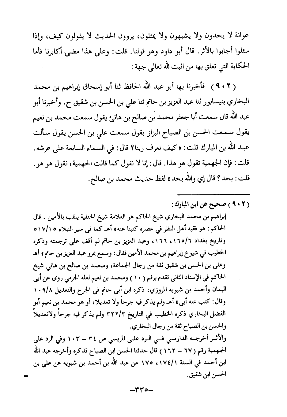 902 - فَأَخْبَرَنَا بِهَا أَبُو عَبْدِ اللَّهِ الْحَافِظُ، ثنا أَبُو إِسْحَاقَ إِبْرَاهِيمُ بْنُ مُحَمَّدٍ الْبُخَارِيُّ بِنَيْسَابُورَ، ثنا عَبْدُ الْعَزِيزِ بْنُ حَاتِمٍ، ثنا عَلِيُّ بْنُ الْحَسَنِ بْنِ شَقِيقٍ، ح. وَأَخْبَرَنَا أَبُو عَبْدِ اللَّهِ، قَالَ: سَمِعْتُ أَبَا جَعْفَرٍ مُحَمَّدَ بْنَ صَالِحِ بْنِ هَانِئٍ، يَقُولُ: سَمِعْتُ مُحَمَّدَ بْنَ نُعَيْمٍ، يَقُولُ: سَمِعْتُ الْحَسَنَ بْنَ الصَّبَّاحِ الْبَزَّازَ، يَقُولُ: سَمِعْتُ عَلِيَّ بْنَ الْحَسَنِ، يَقُولُ: سَأَلْتُ عَبْدَ اللَّهِ بْنَ الْمُبَارَكِ قُلْتُ: §كَيْفَ نَعْرِفُ رَبَّنَا؟ قَالَ: فِي السَّمَاءِ السَّابِعَةِ عَلَى عَرْشِهِ. قُلْتُ: فَإِنَّ الْجَهْمِيَّةَ تَقُولُ: هُوَ هَذَا. قَالَ: إِنَّا لَا نَقُولُ كَمَا قَالَتِ الْجَهْمِيَّةُ، نَقُولُ: هُوَ هُوَ. قُلْتُ: بِحَدٍّ؟ قَالَ: إِي وَاللَّهِ بِحَدٍّ. لَفْظُ حَدِيثِ مُحَمَّدِ بْنِ صَالِحٍ. -[336]- قَالَ الشَّيْخُ أَحْمَدُ بْنُ الْحُسَيْنِ الْبَيْهَقِيُّ: إِنَّمَا أَرَادَ عَبْدُ اللَّهِ بِالْحَدِّ حَدَّ السَّمْعِ، وَهُوَ أَنَّ خَبَرَ الصَّادِقِ وَرَدَ بِأَنَّهُ عَلَى الْعَرْشِ اسْتَوَى، فَهُوَ عَلَى عَرْشِهِ كَمَا أَخْبَرَ، وَقَصَدَ بِذَلِكَ تَكْذِيبَ الْجَهْمِيَّةِ فِيمَا زَعَمُوا أَنَّهُ بِكُلِّ مَكَانٍ، وَحِكَايَتُهُ الْأُخْرَى تَدُلُّ عَلَى مُرَادِهِ وَاللَّهُ أَعْلَمُ