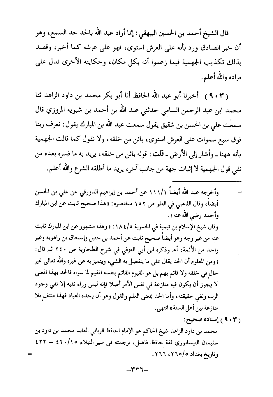 903 - أَخْبَرَنَا أَبُو عَبْدِ اللَّهِ الْحَافِظُ، أنا أَبُو بَكْرٍ مُحَمَّدُ بْنُ دَاوُدَ الزَّاهِدُ، ثنا مُحَمَّدُ بْنُ عَبْدِ الرَّحْمَنِ السَّامِيُّ، حَدَّثَنِي عَبْدُ اللَّهِ بْنُ أَحْمَدَ بْنِ شَبُّوَيْهِ الْمَرْوَزِيُّ، قَالَ: سَمِعْتُ عَلِيَّ بْنَ الْحَسَنِ بْنِ شَقِيقٍ، يَقُولُ: سَمِعْتُ عَبْدَ اللَّهِ بْنَ الْمُبَارَكِ، يَقُولُ: §نَعْرِفُ رَبَّنَا فَوْقَ سَبْعِ سَمَاوَاتٍ، عَلَى الْعَرْشِ اسْتَوَى، بَائِنٌ مِنْ خَلْقِهِ، وَلَا نَقُولُ كَمَا قَالَتِ الْجَهْمِيَّةُ بِأَنَّهُ هَهُنَا. وَأَشَارَ إِلَى الْأَرْضِ. قُلْتُ: قَوْلُهُ: «بَائِنٌ مِنْ خَلْقِهِ» . يُرِيدُ بِهِ مَا فَسَّرَهُ بَعْدَهُ مِنْ نَفْيِ قَوْلِ الْجَهْمِيَّةِ لَا إِثْبَاتِ جِهَةٍ مِنْ جَانِبٍ آخِرَ، يُرِيدُ مَا أَطْلَقَهُ الشَّرْعُ وَاللَّهُ أَعْلَمُ