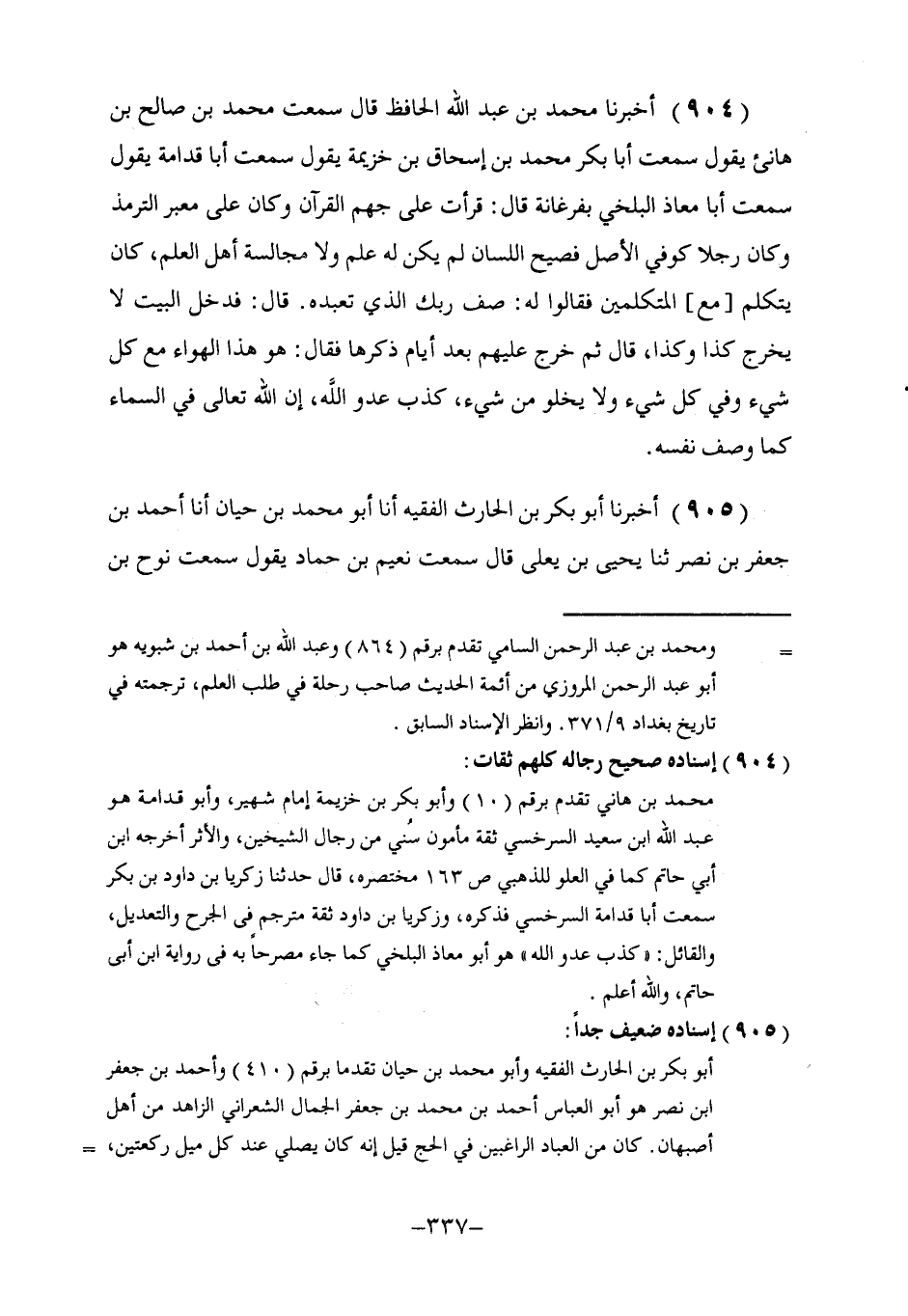 904 - أَخْبَرَنَا مُحَمَّدُ بْنُ عَبْدِ اللَّهِ الْحَافِظُ، قَالَ: سَمِعْتُ مُحَمَّدَ بْنَ صَالِحِ بْنِ هَانِئٍ، يَقُولُ: سَمِعْتُ أَبَا بَكْرٍ مُحَمَّدُ بْنُ إِسْحَاقَ بْنِ خُزَيْمَةَ يَقُولُ: سَمِعْتُ أَبَا قُدَامَةَ، يَقُولُ: سَمِعْتُ أَبَا مُعَاذٍ الْبَلْخِيَّ بِفَرْغَانَةَ قَالَ: قَرَأْتُ عَلَى جَهْمٍ الْقُرْآنَ وَكَانَ عَلَى مَعْبَرِ التِّرْمِذِ وَكَانَ رَجُلًا كُوفِيَّ الْأَصْلِ فَصِيحَ اللِّسَانِ، لَمْ يَكُنْ لَهُ عِلْمٌ وَلَا مُجَالَسَةُ أَهْلِ الْعِلْمِ، كَانَ يَتَكَلَّمُ مَعَ الْمُتَكَلِّمِينَ فَقَالُوا لَهُ: صِفْ رَبَّكَ الَّذِي تَعْبُدُهُ. قَالَ: فَدَخَلَ الْبَيْتَ لَا يَخْرُجُ كَذَا وَكَذَا، قَالَ: ثُمَّ خَرَجَ عَلَيْهِمْ بَعْدَ أَيَّامٍ ذَكَرَهَا فَقَالَ: §هُوَ هَذَا الْهَوَاءُ مَعَ كُلِّ شَيْءٍ وَفِي كُلِّ شَيْءٍ وَلَا يَخْلُو مِنْ شَيْءٍ، كَذَبَ عَدُوُّ اللَّهِ، إِنَّ اللَّهَ تَعَالَى فِي السَّمَاءِ كَمَا وَصَفَ نَفْسَهُ