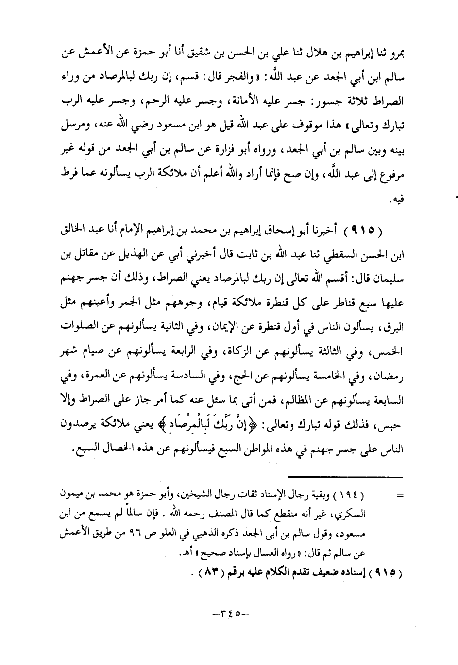 915 - أَخْبَرَنَا أَبُو إِسْحَاقَ إِبْرَاهِيمُ بْنُ مُحَمَّدِ بْنِ إِبْرَاهِيمَ الْإِمَامُ، أنا عَبْدُ الْخَالْقِ بْنُ الْحَسَنِ السَّقَطِيُّ، ثنا عَبْدُ اللَّهِ بْنُ ثَابِتٍ، قَالَ: أَخْبَرَنِي أَبِي، عَنِ الْهُذَيْلِ، عَنْ مُقَاتِلِ بْنِ سُلَيْمَانَ، قَالَ: §أَقْسَمَ اللَّهُ تَعَالَى {إِنَّ رَبَّكَ لَبِالْمِرْصَادِ} [الفجر: 14] يَعْنِي الصِّرَاطَ، وَذَلِكَ أَنَّ جِسْرَ جَهَنَّمَ عَلَيْهَا سَبْعُ قَنَاطِرَ، عَلَى كُلِّ قَنْطَرَةٍ مَلَائِكَةٌ قِيَامٌ، وُجُوهُهُمْ مِثْلُ الْجَمْرِ، وَأَعُيُنُهُمْ مِثْلُ الْبَرْقِ، يَسْأَلُونَ النَّاسَ فِي أَوَّلِ قَنْطَرَةٍ عَنِ الْإِيمَانِ، وَفِي الثَّانِيَةِ يَسْأَلُونَهُمْ عَنِ الصَّلَوَاتِ الْخَمْسِ، وَفِي الثَّالِثَةِ يَسْأَلُونَهُمْ عَنِ الزَّكَاةِ، وَفِي الرَّابِعَةِ يَسْأَلُونَهُمْ عَنِ صِيَامِ شَهْرِ رَمَضَانَ، وَفِي الْخَامِسَةِ يَسْأَلُونَهُمْ عَنِ الْحَجِّ، وَفِي السَّادِسَةِ يَسْأَلُونَهُمْ عَنِ الْعُمْرَةِ، وَفِي السَّابِعَةِ يَسْأَلُونَهُمْ عَنِ الْمَظَالِمِ، فَمَنْ أَتَى بِمَا سُئِلَ عَنْهُ كَمَا أُمِرَ جَازَ عَلَى الصِّرَاطِ وَإِلَّا حُبِسَ، فَذَلِكَ قَوْلُهُ تَبَارَكَ وَتَعَالَى: {إِنَّ رَبَّكَ لَبِالْمِرْصَادِ} [الفجر: 14] يَعْنِي مَلَائِكَةً يَرْصُدُونَ النَّاسَ عَلَى جِسْرِ جَهَنَّمَ فِي هَذِهِ الْمَوَاطِنِ السَّبْعِ فَيَسْأَلُونَهُمْ عَنْ هَذِهِ الْخِصَالِ السَّبْعِ