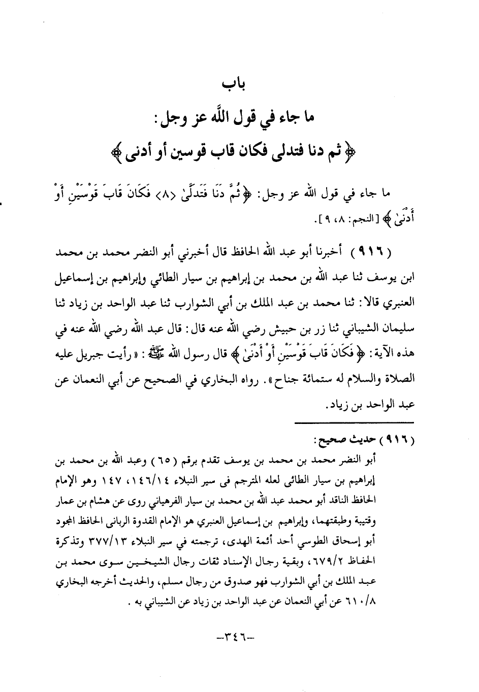 916 - أَخْبَرَنَا أَبُو عَبْدِ اللَّهِ الْحَافِظُ، قَالَ: أَخْبَرَنِي أَبُو النَّضْرِ مُحَمَّدُ بْنُ مُحَمَّدِ بْنِ يُوسُفَ، ثنا عَبْدُ اللَّهِ بْنُ مُحَمَّدِ بْنِ إِبْرَاهِيمَ بْنِ سَيَّارٍ الطَّائِيُّ، وَإِبْرَاهِيمُ بْنُ إِسْمَاعِيلَ الْعَنْبَرِيُّ، قَالَا: ثنا مُحَمَّدُ بْنُ عَبْدِ الْمَلِكِ بْنِ أَبِي الشَّوَارِبِ، ثنا عَبْدُ الْوَاحِدِ بْنُ زِيَادٍ، ثنا سُلَيْمَانُ الشَّيْبَانِيُّ، ثنا زِرُّ بْنُ حُبَيْشٍ، رَضِيَ اللَّهُ عَنْهُ، قَالَ: قَالَ عَبْدُ اللَّهِ: رَضِيَ اللَّهُ عَنْهُ فِي هَذِهِ الْآيَةِ: {فَكَانَ قَابَ قَوْسَيْنِ أَوْ أَدْنَى} [النجم: 9] قَالَ رَسُولُ اللَّهِ صَلَّى اللهُ عَلَيْهِ وَسَلَّمَ: §«رَأَيْتُ جِبْرِيلَ عَلَيْهِ الصَّلَاةُ وَالسَّلَامُ لَهُ سِتُّمِائَةِ جَنَاحٍ» . رَوَاهُ الْبُخَارِيُّ فِي الصَّحِيحِ عَنْ أَبِي النُّعْمَانِ عَنْ عَبْدِ الْوَاحِدِ بْنِ زِيَادٍ