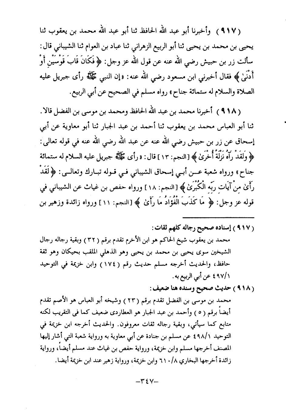 917 - وَأَخْبَرَنَا أَبُو عَبْدِ اللَّهِ الْحَافِظُ، ثنا أَبُو عَبْدِ اللَّهِ مُحَمَّدُ بْنُ يَعْقُوبَ، ثنا يَحْيَى بْنُ مُحَمَّدٍ بْنِ يَحْيَى، ثنا أَبُو الرَّبِيعِ الزَّهْرَانِيُّ، ثنا عَبَّادُ بْنُ الْعَوَّامِ، ثنا الشَّيْبَانِيُّ، قَالَ: سَأَلْتُ زِرَّ بْنَ حُبَيْشٍ رَضِيَ اللَّهُ عَنْهُ عَنْ قَوْلِ اللَّهِ عَزَّ وَجَلَّ: {فَكَانَ قَابَ قَوْسَيْنِ أَوْ أَدْنَى} [النجم: 9] فَقَالَ: أَخْبَرَنِي ابْنُ مَسْعُودٍ رَضِيَ اللَّهُ عَنْهُ: إِنَّ النَّبِيَّ صَلَّى اللهُ عَلَيْهِ وَسَلَّمَ §رَأَى جِبْرِيلَ عَلَيْهِ الصَّلَاةُ وَالسَّلَامُ لَهُ سِتُّمِائَةِ جَنَاحٍ. رَوَاهُ مُسْلِمٌ فِي الصَّحِيحِ عَنْ أَبِي الرَّبِيعِ