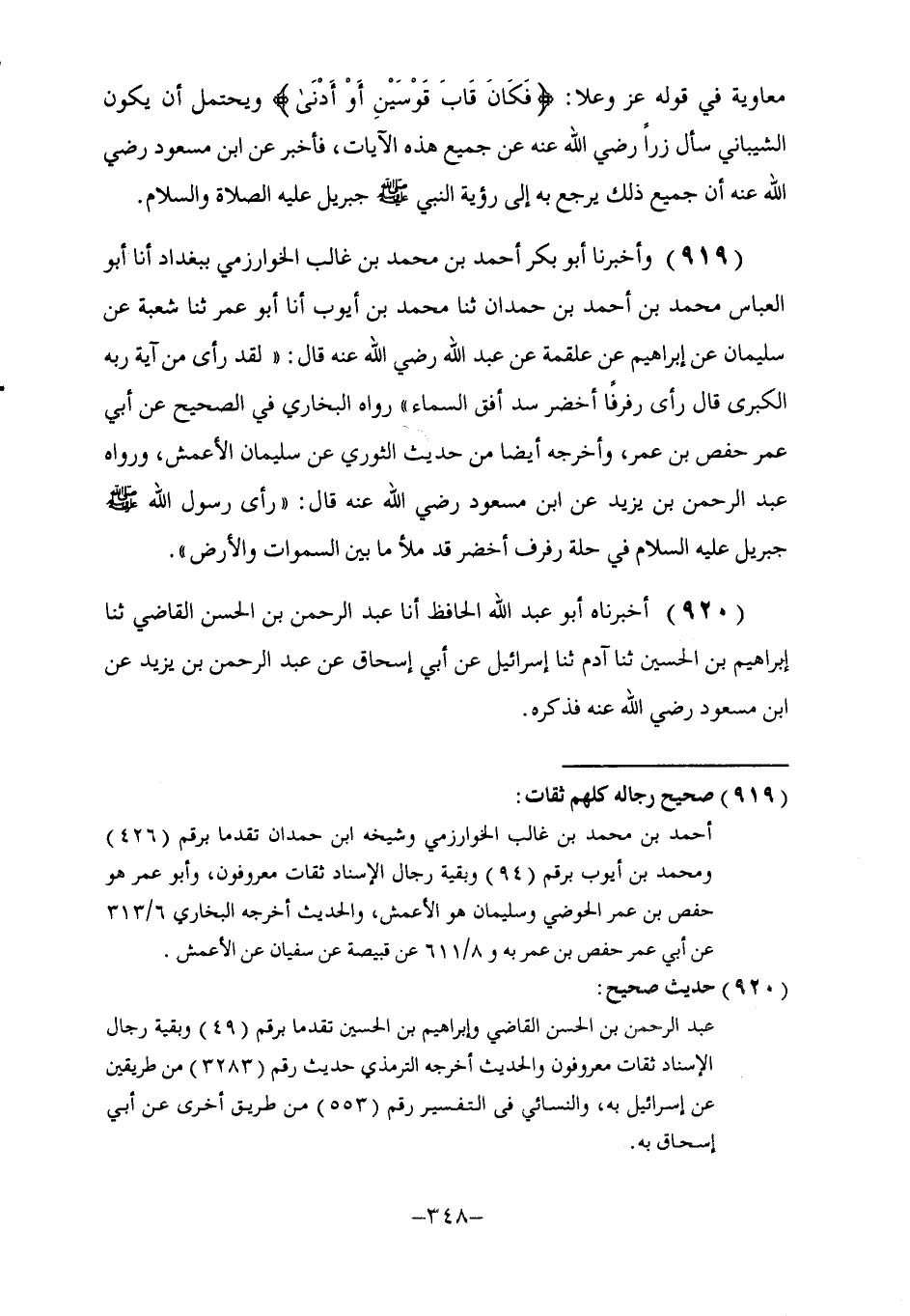 919 - وَأَخْبَرَنَا أَبُو بَكْرٍ أَحْمَدُ بْنُ مُحَمَّدِ بْنِ غَالِبٍ الْخَوَارِزْمِيُّ بِبَغْدَادَ، أنا أَبُو الْعَبَّاسِ مُحَمَّدُ بْنُ أَحْمَدَ بْنِ حَمْدَانَ، ثنا مُحَمَّدُ بْنُ أَيُّوبَ، أنا أَبُو عُمَرَ، ثنا شُعْبَةُ، عَنْ سُلَيْمَانَ، عَنْ إِبْرَاهِيمَ، عَنْ عَلْقَمَةَ، عَنْ عَبْدِ اللَّهِ، رَضِيَ اللَّهُ عَنْهُ قَالَ: {لَقَدْ رَأَى مِنْ آيَةِ رَبِّهِ الْكُبْرَى} قَالَ: §رَأَى رَفْرَفًا أَخْضَرَ سَدَّ أُفُقَ السَّمَاءِ. رَوَاهُ الْبُخَارِيُّ فِي الصَّحِيحِ عَنْ أَبِي عُمَرَ حَفْصِ بْنِ عُمَرَ، وَأَخْرَجَهُ أَيْضًا مِنْ حَدِيثِ الثَّوْرِيِّ عَنْ سُلَيْمَانَ الْأَعْمَشِ. وَرَوَاهُ عَبْدُ الرَّحْمَنِ بْنُ يَزِيدَ عَنِ ابْنِ مَسْعُودٍ رَضِيَ اللَّهُ عَنْهُ قَالَ: " رَأَى رَسُولُ اللَّهِ صَلَّى اللهُ عَلَيْهِ وَسَلَّمَ جِبْرِيلَ عَلَيْهِ السَّلَامُ فِي حُلَّةِ رَفْرَفٍ أَخْضَرَ قَدْ مَلَأَ مَا بَيْنَ السَّمَاوَاتِ وَالْأَرْضَ