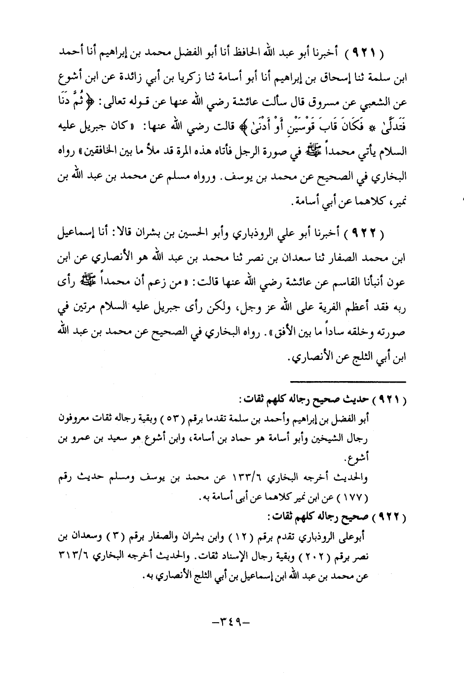921 - أَخْبَرَنَا أَبُو عَبْدِ اللَّهِ الْحَافِظُ، أنا أَبُو الْفَضْلِ مُحَمَّدُ بْنُ إِبْرَاهِيمَ، أنا أَحْمَدُ بْنُ سَلَمَةَ، ثنا إِسْحَاقُ بْنُ إِبْرَاهِيمَ، أنا أَبُو أُسَامَةَ، ثنا زَكَرِيَّا بْنُ أَبِي زَائِدَةَ، عَنِ ابْنِ أَشْوَعَ، عَنِ الشَّعْبِيِّ , عَنْ مَسْرُوقٍ، قَالَ: سَأَلْتُ عَائِشَةَ رَضِيَ اللَّهُ عَنْهَا عَنْ قَوْلِهِ تَعَالَى: {ثُمَّ دَنَا فَتَدَلَّى فَكَانَ قَابَ قَوْسَيْنِ أَوْ أَدْنَى} [النجم: 9] قَالَتْ رَضِيَ اللَّهُ عَنْهَا: §كَانَ جِبْرِيلُ عَلَيْهِ السَّلَامُ يَأْتِي مُحَمَّدًا صَلَّى اللهُ عَلَيْهِ وَسَلَّمَ فِي صُورَةِ الرَّجُلِ، فَأَتَاهُ هَذِهِ الْمَرَّةَ قَدْ مَلَأَ مَا بَيْنَ الْخَافِقَيْنِ ". رَوَاهُ الْبُخَارِيُّ فِي الصَّحِيحِ عَنْ مُحَمَّدِ بْنِ يُوسُفَ، وَرَوَاهُ مُسْلِمٌ عَنْ مُحَمَّدِ بْنِ عَبْدِ اللَّهِ بْنِ نُمَيْرٍ، كِلَاهُمَا عَنْ أَبِي أُسَامَةَ