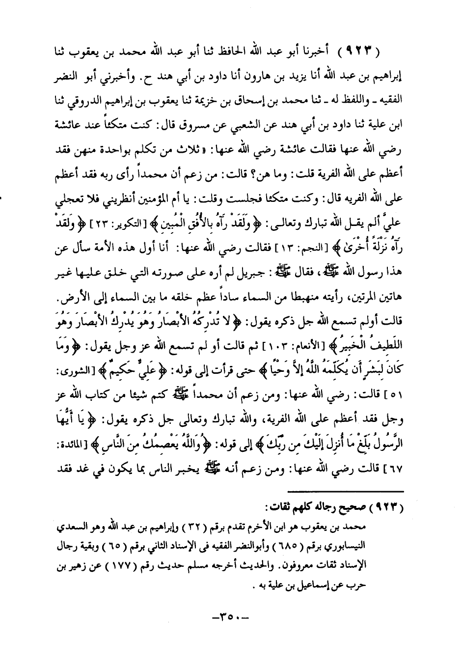 923 - أَخْبَرَنَا أَبُو عَبْدِ اللَّهِ الْحَافِظُ، ثنا أَبُو عَبْدِ اللَّهِ مُحَمَّدُ بْنُ يَعْقُوبَ، ثنا إِبْرَاهِيمُ بْنُ عَبْدِ اللَّهِ، أنا يَزِيدُ بْنُ هَارُونَ، أنا دَاوُدُ بْنُ أَبِي هِنْدَ، ح. وَأَخْبَرَنِي أَبُو النَّضْرِ الْفَقِيهُ، وَاللَّفْظُ لَهُ، ثنا مُحَمَّدُ بْنُ إِسْحَاقَ بْنِ خُزَيْمَةَ، ثنا يَعْقُوبُ بْنُ إِبْرَاهِيمَ الدَّرْوَقِيُّ، ثنا ابْنُ عُلَيَّةَ، ثنا دَاوُدُ بْنُ أَبِي هِنْدَ، عَنِ الشَّعْبِيِّ، عَنْ مَسْرُوقٍ، قَالَ: كُنْتُ مُتَّكِئًا عِنْدَ عَائِشَةَ رَضِيَ اللَّهُ عَنْهَا، فَقَالَتْ عَائِشَةُ رَضِيَ اللَّهُ عَنْهَا: ثَلَاثٌ مَنْ تَكَلَّمَ بِوَاحِدَةٍ مِنْهُنَّ فَقَدْ أَعْظَمَ عَلَى اللَّهِ الْفِرْيَةَ. قُلْتُ: وَمَا هُنَّ؟ قَالَتْ: مَنْ زَعَمَ أَنَّ مُحَمَّدًا رَأَى رَبَّهُ فَقَدْ أَعْظَمَ عَلَى اللَّهِ الْفِرْيَةَ. قَالَ: وَكُنْتُ مُتَّكِئًا فَجَلَسْتُ، وَقُلْتُ: يَا أُمَّ الْمُؤْمِنِينَ، أَنْظِرِينِي فَلَا تَعْجَلِي عَلَيَّ، أَلَمْ يَقُلِ اللَّهُ تَبَارَكَ وَتَعَالَى: {وَلَقَدْ رَآهُ بِالْأُفُقِ الْمُبِينِ} [التكوير: 23] ، {وَلَقَدْ رَآهُ نَزْلَةً أُخْرَى} [النجم: 13] ؟ فَقَالَتْ رَضِيَ اللَّهُ عَنْهَا: أَنَا أَوَّلُ هَذِهِ الْأُمَّةِ سَأَلَ عَنْ هَذَا رَسُولَ اللَّهِ صَلَّى اللهُ عَلَيْهِ وَسَلَّمَ، فَقَالَ صَلَّى اللهُ عَلَيْهِ وَسَلَّمَ: §«جِبْرِيلُ لَمْ أَرَهُ عَلَى صُورَتِهِ الَّتِي خُلِقَ عَلَيْهَا غَيْرَ هَاتَيْنِ الْمَرَّتَيْنِ، رَأَيْتُهُ مُنْهَبِطًا مِنَ السَّمَاءِ سَادًّا عِظَمُ خَلْقِهِ مَا بَيْنَ السَّمَاءِ إِلَى الْأَرْضِ» . قَالَتْ: أَوَلَمْ تَسْمَعِ اللَّهَ جَلَّ ذِكْرُهُ يَقُولُ: {لَا تُدْرِكُهُ الْأَبْصَارُ وَهُوَ يُدْرِكُ الْأَبْصَارَ وَهُوَ اللَّطِيفُ الْخَبِيرُ} [الأنعام: 103] ؟ ثُمَّ قَالَتْ: أَوَلَمْ تَسْمَعِ اللَّهَ عَزَّ وَجَلَّ يَقُولُ: {وَمَا كَانَ لِبَشَرٍ أَنْ يُكَلِّمَهُ اللَّهُ إِلَّا وَحْيًا} [الشورى: 51] ؟ حَتَّى قَرَأَتْ إِلَى قَوْلِهِ: {عَلِيُّ حَكِيمٌ} [الشورى: 51] قَالَتْ رَضِيَ اللَّهُ عَنْهَا: وَمَنْ زَعَمَ أَنَّ مُحَمَّدًا صَلَّى اللهُ عَلَيْهِ وَسَلَّمَ كَتَمَ شَيْئًا مِنْ كِتَابِ اللَّهِ عَزَّ وَجَلَّ فَقَدْ أَعْظَمَ عَلَى اللَّهِ الْفِرْيَةَ، وَاللَّهُ تَبَارَكَ وَتَعَالَى جَلَّ ذِكْرُهُ يَقُولُ: {يَا أَيُّهَا الرَّسُولُ بَلِّغْ مَا أُنْزِلَ إِلَيْكَ مِنْ رَبِّكَ} [المائدة: 67] إِلَى قَوْلِهِ: {وَاللَّهُ يَعْصِمُكَ مِنَ النَّاسِ} [المائدة: 67] قَالَتْ رَضِيَ اللَّهُ عَنْهَا: وَمَنْ زَعَمَ أَنَّهُ صَلَّى اللهُ عَلَيْهِ وَسَلَّمَ يُخْبِرُ النَّاسَ بِمَا يَكُونُ فِي غَدٍ فَقَدْ -[351]- أَعْظَمَ عَلَى اللَّهِ الْفِرْيَةَ، وَاللَّهُ تَعَالَى يَقُولُ: {لَا يَعْلَمُ مَنْ فِي السَّمَوَاتِ وَالْأَرْضِ الْغَيْبَ إِلَّا اللَّهُ} ". رَوَاهُ مُسْلِمٌ فِي الصَّحِيحِ عَنْ زُهَيْرِ بْنِ حَرْبٍ عَنْ إِسْمَاعِيلَ بْنِ عُلَيَّةَ
