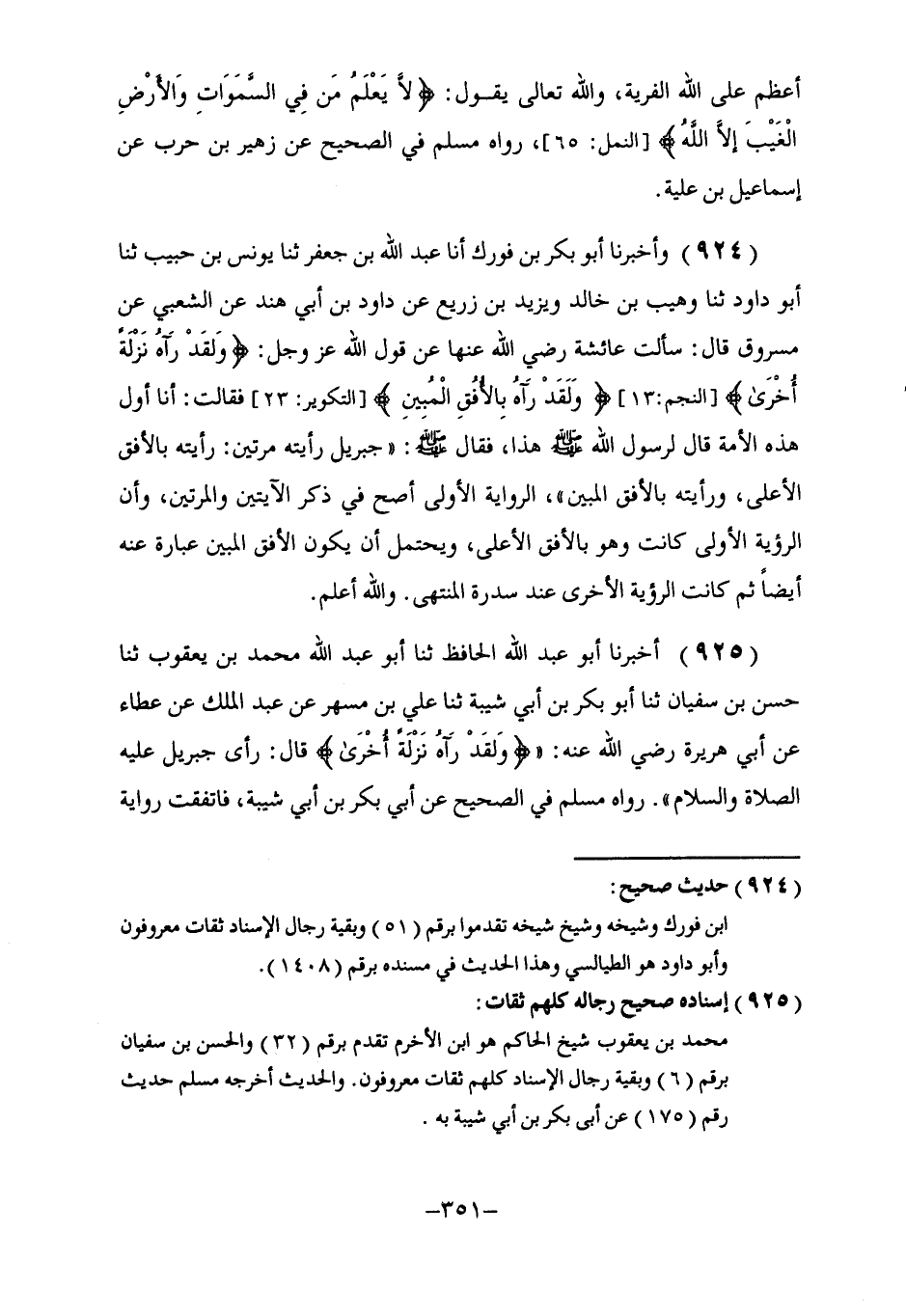 924 - وَأَخْبَرَنَا أَبُو بَكْرِ بْنُ فُورَكٍ، أنا عَبْدُ اللَّهِ بْنُ جَعْفَرٍ، ثنا يُونُسُ بْنُ حَبِيبٍ، ثنا أَبُو دَاوُدَ، ثنا وُهَيْبُ بْنُ خَالِدٍ، وَيَزِيدُ بْنُ زُرَيْعٍ، عَنْ دَاوُدَ بْنِ أَبِي هِنْدَ، عَنِ الشَّعْبِيِّ، عَنْ مَسْرُوقٍ، قَالَ: سَأَلْتُ عَائِشَةَ رَضِيَ اللَّهُ عَنْهَا عَنْ قَوْلِ اللَّهِ عَزَّ وَجَلَّ: {وَلَقَدْ رَآهُ نَزْلَةً أُخْرَى} [النجم: 13] ، {وَلَقَدْ رَآهُ بِالْأُفُقِ الْمُبِينِ} [التكوير: 23] فَقَالَتْ: أَنَا أَوَّلُ هَذِهِ الْأُمَّةِ قَالَ لِرَسُولِ اللَّهِ صَلَّى اللهُ عَلَيْهِ وَسَلَّمَ هَذَا، فَقَالَ صَلَّى اللهُ عَلَيْهِ وَسَلَّمَ: " §جِبْرِيلُ رَأَيْتُهُ مَرَّتَيْنِ: رَأَيْتُهُ بِالْأُفُقِ الْأَعْلَى، وَرَأَيْتُهُ بِالْأُفُقِ الْمُبِينِ ". الرِّوَايَةُ الْأُولَى أَصَحُّ فِي ذِكْرِ الْآيَتَيْنِ وَالْمَرَّتَيْنِ، وَأَنَّ الرُّؤْيَةَ الْأُولَى كَانَتْ وَهُوَ بِالْأُفُقِ الْأَعْلَى، وَيُحْتَمَلُ أَنْ يَكُونَ الْأُفُقُ الْمُبِينُ عِبَارَةً عَنْهُ أَيْضًا ثُمَّ كَانَتِ الرُّؤْيَةُ الْأُخْرَى عِنْدَ سِدْرَةِ الْمُنْتَهَى، وَاللَّهُ أَعْلَمُ