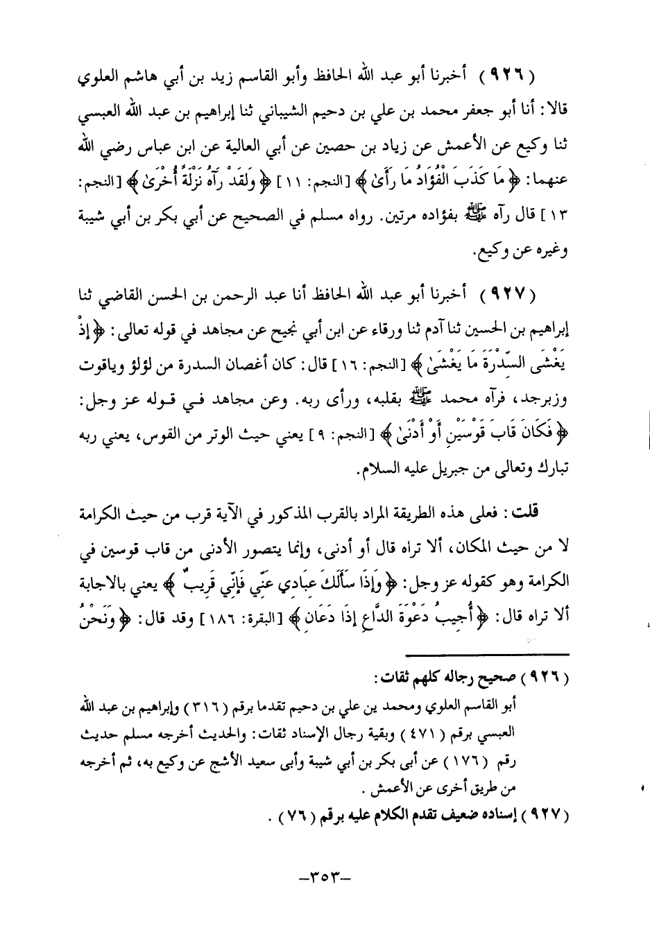 926 - أَخْبَرَنَا أَبُو عَبْدِ اللَّهِ الْحَافِظُ، وَأَبُو الْقَاسِمِ زَيْدُ بْنُ أَبِي هَاشِمٍ الْعَلَوِيُّ قَالَا: أنا أَبُو جَعْفَرٍ مُحَمَّدُ بْنُ عَلِيِّ بْنِ دُحَيْمٍ الشَّيْبَانِيُّ، ثنا إِبْرَاهِيمُ بْنُ عَبْدِ اللَّهِ الْعَبْسِيُّ، ثنا وَكِيعٌ، عَنِ الْأَعْمَشِ، عَنْ زِيَادِ بْنِ حُصَيْنٍ، عَنْ أَبِي الْعَالِيَةِ، عَنِ ابْنِ عَبَّاسٍ، رَضِيَ اللَّهُ عَنْهُمَا: {مَا كَذَبَ الْفُؤَادُ مَا رَأَى} [النجم: 11] ، {وَلَقَدْ رَآهُ نَزْلَةً أُخْرَى} [النجم: 13] قَالَ: §رَآهُ صَلَّى اللهُ عَلَيْهِ وَسَلَّمَ بِفُؤَادِهِ مَرَّتَيْنِ. رَوَاهُ مُسْلِمٌ فِي الصَّحِيحِ عَنْ أَبِي بَكْرِ بْنِ أَبِي شَيْبَةَ وَغَيْرِهِ، عَنْ وَكِيعٍ