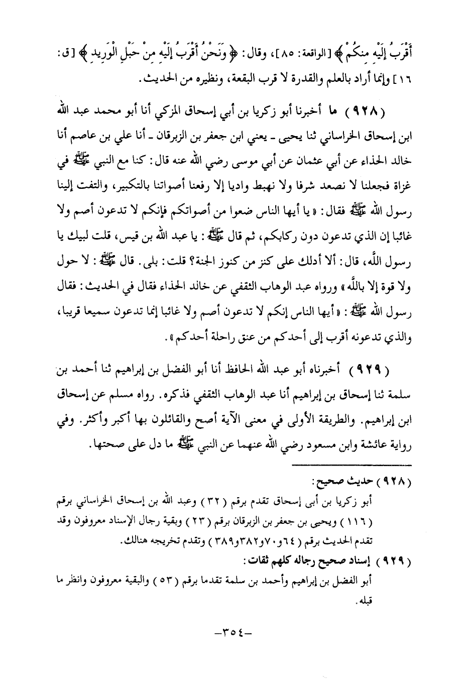 928 - مَا أَخْبَرَنَا أَبُو زَكَرِيَّا بْنُ أَبِي إِسْحَاقَ الْمُزَكِّي، أنا أَبُو مُحَمَّدٍ عَبْدُ اللَّهِ بْنُ إِسْحَاقَ الْخُرَاسَانِيُّ، ثنا يَحْيَى يَعْنِي ابْنَ جَعْفَرِ بْنَ الزِّبْرِقَانِ، أنا عَلِيُّ بْنُ عَاصِمٍ، أنا خَالِدٌ الْحَذَّاءُ، عَنْ أَبِي عُثْمَانَ، عَنْ أَبِي مُوسَى، رَضِيَ اللَّهُ عَنْهُ قَالَ: كُنَّا مَعَ النَّبِيِّ صَلَّى اللهُ عَلَيْهِ وَسَلَّمَ فِي غَزَاةٍ، فَجَعَلْنَا لَا نَصْعَدُ شَرَفًا وَلَا نَهْبِطُ وَادِيًا إِلَّا رَفَعْنَا أَصْوَاتَنَا بِالتَّكْبِيرِ، وَالْتَفَتَ إِلَيْنَا رَسُولُ اللَّهِ صَلَّى اللهُ عَلَيْهِ وَسَلَّمَ فَقَالَ: «يَا أَيُّهَا النَّاسُ، §ضَعُوا مِنْ أَصْوَاتِكُمْ؛ فَإِنَّكُمْ لَا تَدْعُونَ أَصَمَّ وَلَا غَائِبًا، إِنَّ الَّذِي تَدْعُونَ دُونَ رِكَابِكُمْ» . ثُمَّ قَالَ صَلَّى اللهُ عَلَيْهِ وَسَلَّمَ: «يَا عَبْدَ اللَّهِ بْنَ قَيْسٍ» . قُلْتُ: لَبَّيْكَ يَا رَسُولَ اللَّهِ. قَالَ: «أَلَا أَدُلُّكَ عَلَى كَنْزٍ مِنْ كُنُوزِ الْجَنَّةِ؟» قُلْتُ: بَلَى. قَالَ صَلَّى اللهُ عَلَيْهِ وَسَلَّمَ: «لَا حَوْلَ وَلَا قُوَّةَ إِلَّا بِاللَّهِ» . وَرَوَاهُ عَبْدُ الْوَهَّابِ الثَّقَفِيُّ عَنْ خَالِدٍ الْحَذَّاءِ. فَقَالَ فِي الْحَدِيثِ: فَقَالَ رَسُولُ اللَّهِ صَلَّى اللهُ عَلَيْهِ وَسَلَّمَ: أَيُّهَا النَّاسُ؛ إِنَّكُمْ لَا تَدْعُونَ أَصَمَّ وَلَا غَائِبًا، إِنَّمَا تَدْعُونَ سَمِيعًا قَرِيبًا، وَالَّذِي تَدْعُونَهُ أَقْرَبُ إِلَى أَحَدِكُمْ مِنْ عُنُقِ رَاحِلَةِ أَحَدِكُمْ.