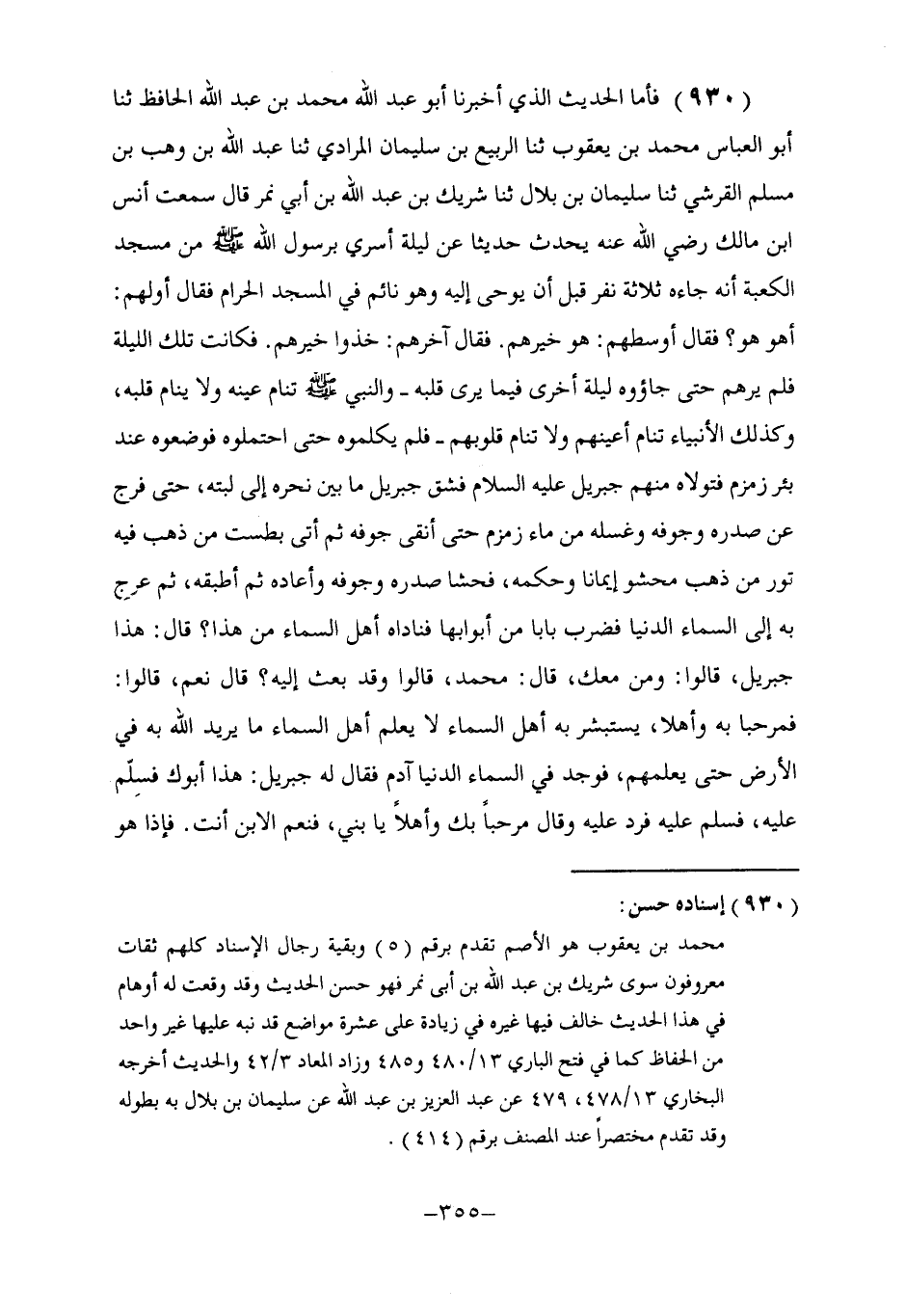 930 - فَأَمَّا الْحَدِيثُ الَّذِي أَخْبَرَنَا أَبُو عَبْدِ اللَّهِ مُحَمَّدُ بْنُ عَبْدِ اللَّهِ الْحَافِظُ، ثنا أَبُو الْعَبَّاسِ مُحَمَّدُ بْنُ يَعْقُوبَ، ثنا الرَّبِيعُ بْنُ سُلَيْمَانَ الْمُرَادِيُّ، ثنا عَبْدُ اللَّهِ بْنُ وَهْبِ بْنِ مُسْلِمٍ الْقُرَشِيُّ، ثنا سُلَيْمَانُ بْنُ بِلَالٍ، ثنا شَرِيكُ بْنُ عَبْدِ اللَّهِ بْنِ أَبِي نَمِرٍ، قَالَ: سَمِعْتُ أَنَسَ بْنَ مَالِكٍ، رَضِيَ اللَّهُ عَنْهُ يُحَدِّثُ حَدِيثًا عَنْ لَيْلَةِ أُسْرِيَ بِرَسُولِ اللَّهِ صَلَّى اللهُ عَلَيْهِ وَسَلَّمَ مِنْ مَسْجِدِ الْكَعْبَةِ، أَنَّهُ جَاءَهُ ثَلَاثَةُ نَفَرٍ قَبْلَ أَنْ يُوحَى إِلَيْهِ وَهُوَ نَائِمٌ فِي الْمَسْجِدِ الْحَرَامِ، فَقَالَ أَوَّلُهُمْ: أَهُوَ هُوَ؟ فَقَالَ أَوْسَطُهُمْ: هُوَ خَيْرُهُمْ. فَقَالَ آخِرُهُمْ: خُذُوا خَيْرَهُمْ. فَكَانَتْ تِلْكَ اللَّيْلَةُ فَلَمْ يَرَهُمْ حَتَّى جَاءُوهُ لَيْلَةً أُخْرَى فِيمَا يَرَى قَلْبَهُ ـ وَالنَّبِيُّ صَلَّى اللهُ عَلَيْهِ وَسَلَّمَ تَنَامُ عَيْنُهُ وَلَا يَنَامُ قَلْبُهُ، وَكَذَلِكَ الْأَنْبِيَاءُ، تَنَامُ أَعْيُنُهُمْ وَلَا تَنَامُ قُلُوبُهُمْ ـ فَلَمْ يُكَلِّمُوهُ حَتَّى احْتَمَلُوهُ فَوَضَعُوهُ عِنْدَ بِئْرِ زَمْزَمَ، فَتَوَلَّاهُ مِنْهُمْ جِبْرِيلُ عَلَيْهِ السَّلَامُ فَشَقَّ جِبْرِيلُ مَا بَيْنَ نَحْرِهِ إِلَى لَبَّتِهِ، حَتَّى فَرَّجَ عَنْ صَدْرِهِ وَجَوْفِهِ، وَغَسَلَهُ مِنْ مَاءِ زَمْزَمَ، حَتَّى أَنْقَى جَوْفَهُ ثُمَّ أَتَى بِطَسْتٍ مِنْ ذَهَبٍ، فِيهِ تَوْرٌ مِنْ ذَهَبٍ مَحْشُوٌّ إِيمَانًا وَحِكْمَةً، فَحَشَا صَدْرَهُ وَجَوْفَهُ وَأَعَادَهُ ثُمَّ أَطْبَقَهُ، §ثُمَّ عُرِجَ بِهِ إِلَى السَّمَاءِ الدُّنْيَا فَضَرَبَ بَابًا مِنْ أَبْوَابِهَا فَنَادَاهُ أَهْلُ السَّمَاءِ: مَنْ هَذَا؟ قَالَ: هَذَا جِبْرِيلُ، قَالُوا: وَمَنْ مَعَكَ. قَالَ: مُحَمَّدٌ. قَالُوا: وَقَدْ بُعِثَ إِلَيْهِ؟ قَالَ: نَعَمْ. قَالُوا: فَمَرْحَبًا بِهِ وَأَهْلًا، يَسْتَبْشِرُ بِهِ أَهْلُ السَّمَاءِ لَا يَعْلَمُ أَهْلُ السَّمَاءِ مَا يُرِيدُ اللَّهُ بِهِ فِي الْأَرْضِ حَتَّى يُعْلِمَهُمْ، فَوَجَدَ فِي السَّمَاءِ الدُّنْيَا آدَمَ، فَقَالَ لَهُ جِبْرِيلُ: هَذَا أَبُوكَ، فَسَلِّمْ عَلَيْهِ. فَسَلَّمَ عَلَيْهِ فَرَدَّ عَلَيْهِ، وَقَالَ: مَرْحَبًا بِكَ وَأَهْلًا يَا بُنَيَّ، فَنِعْمَ الِابْنُ أَنْتَ. فَإِذَا هُوَ -[356]- فِي السَّمَاءِ الدُّنْيَا بِنَهْرَيْنِ يَطَّرِدَانِ، فَقَالَ: «مَا هَذَانِ النَّهْرَانِ يَا جِبْرِيلُ؟» قَالَ: هَذَانِ: النِّيلُ وَالْفُرَاتُ عُنْصُرُهُمَا. ثُمَّ مَضَى بِهِ فِي السَّمَاءِ فَإِذَا هُوَ بِنَهَرٍ آخَرَ عَلَيْهِ قَصْرٌ مِنْ لُؤْلُؤٍ وَزَبَرْجَدٍ، فَذَهَبَ يَشُمُّ تُرَابَهُ فَإِذَا هُوَ الْمِسْكُ، فَقَالَ: «يَا جِبْرِيلُ وَمَا هَذَا النَّهَرُ؟» قَالَ: هَذَا الْكَوْثَرُ الَّذِي خَبَأَ لَكَ رَبُّكَ. ثُمَّ عُرِجَ بِهِ إِلَى السَّمَاءِ الثَّانِيَةِ، فَقَالَتِ لَهُ الْمَلَائِكَةُ مِثْلَ مَا قَالَتْ لَهُ فِي الْأُولَى: مَنْ هَذَا مَعَكَ؟ قَالَ: مُحَمَّدٌ. قَالُوا: وَقَدْ بُعِثَ إِلَيْهِ؟ قَالَ: نَعَمْ. قَالُوا: فَمَرْحَبًا بِهِ وَأَهْلًا. ثُمَّ عُرِجَ بِهِ إِلَى السَّمَاءِ الثَّالِثَةِ، فَقَالُوا لَهُ مِثْلَ مَا قَالَتْ فِي الْأُولَى وَالثَّانِيَةِ ثُمَّ عَرَجَ إِلَى السَّمَاءِ الرَّابِعَةِ، فَقَالُوا لَهُ مِثْلَ ذَلِكَ، ثُمَّ عُرِجَ بِهِ إِلَى السَّمَاءِ الْخَامِسَةِ، فَقَالُوا لَهُ مِثْلَ ذَلِكَ. ثُمَّ عُرِجَ بِهِ إِلَى السَّمَاءِ السَّادِسَةِ، فَقَالُوا لَهُ مِثْلَ ذَلِكَ ثُمَّ عُرِجَ بِهِ إِلَى السَّمَاءِ السَّابِعَةِ فَقَالُوا لَهُ مِثْلَ ذَلِكَ، وَكُلُّ سَمَاءٍ فِيهَا أَنْبِيَاءٌ قَدْ سَمَّاهُمْ أَنَسٌ رَضِيَ اللَّهُ عَنْهُ، 