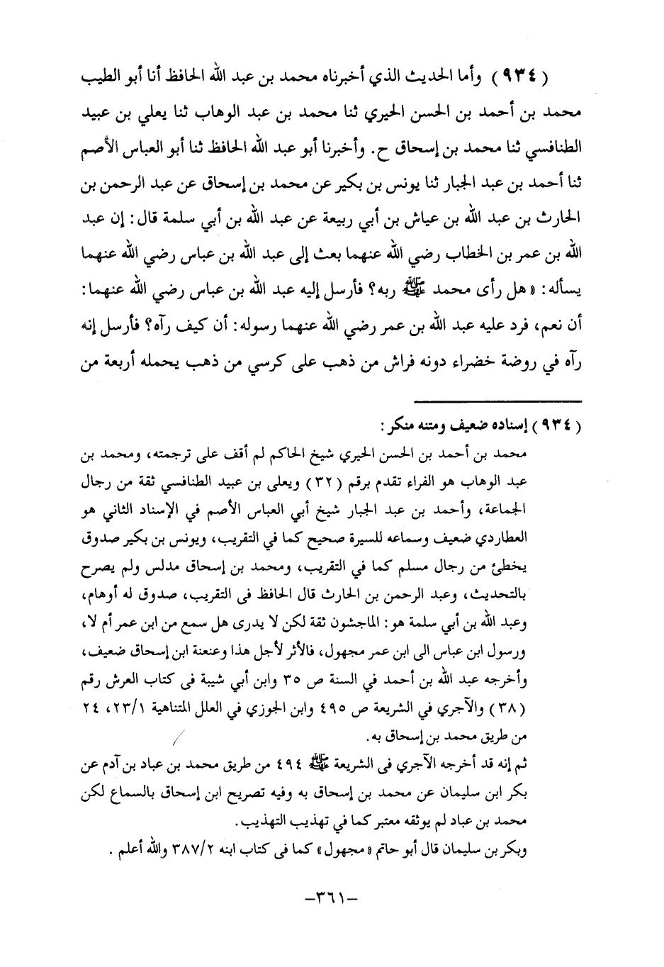 934 - وَأَمَّا الْحَدِيثُ الَّذِي أَخْبَرَنَاهُ مُحَمَّدُ بْنُ عَبْدِ اللَّهِ الْحَافِظُ، أنا أَبُو الطِّيبِ مُحَمَّدُ بْنُ أَحْمَدَ بْنِ الْحَسَنِ الْحِيرِيُّ، ثنا مُحَمَّدُ بْنُ عَبْدِ الْوَهَّابِ، ثنا يَعْلَى بْنُ عُبَيْدٍ الطَّنَافِسِيُّ، ثنا مُحَمَّدُ بْنُ إِسْحَاقَ، ح. وَأَخْبَرَنَا أَبُو عَبْدِ اللَّهِ الْحَافِظُ، ثنا أَبُو الْعَبَّاسِ الْأَصَمُّ، ثنا أَحْمَدُ بْنُ عَبْدِ الْجَبَّارِ، ثنا يُونُسُ بْنُ بُكَيْرٍ، عَنْ مُحَمَّدِ بْنِ إِسْحَاقَ، عَنْ عَبْدِ الرَّحْمَنِ بْنِ الْحَارِثِ بْنِ عَبْدِ اللَّهِ بْنِ عَيَّاشِ بْنِ أَبِي رَبِيعَةَ، عَنْ عَبْدِ اللَّهِ بْنِ أَبِي سَلَمَةَ، قَالَ: إِنَّ عَبْدَ اللَّهِ بْنَ عُمَرَ بْنِ الْخَطَّابِ رَضِيَ اللَّهُ عَنْهُمَا بَعَثَ إِلَى عَبْدِ اللَّهِ بْنِ عَبَّاسٍ رَضِيَ اللَّهُ عَنْهُمَا يَسْأَلُهُ: هَلْ رَأَى مُحَمَّدٌ صَلَّى اللهُ عَلَيْهِ وَسَلَّمَ رَبَّهُ؟ فَأَرْسَلَ إِلَيْهِ عَبْدُ اللَّهِ بْنُ عَبَّاسٍ رَضِيَ اللَّهُ عَنْهُمَا أَنْ نَعَمْ. فَرَدَّ عَلَيْهِ عَبْدُ اللَّهِ بْنُ عُمَرَ رَضِيَ اللَّهُ عَنْهُمَا رَسُولَهُ أَنْ كَيْفَ رَآهُ؟ فَأَرْسَلَ: إِنَّهُ §رَآهُ فِي رَوْضَةٍ خَضْرَاءَ، دُونَهُ فِرَاشٌ مِنْ ذَهَبٍ عَلَى كُرْسِيٍّ مِنْ ذَهَبٍ، يَحْمِلُهُ أَرْبَعَةٌ مِنَ -[362]- الْمَلَائِكَةِ: مَلَكٌ فِي صُورَةِ رَجُلٍ، وَمَلَكٌ فِي صُورَةِ ثَوْرٍ، وَمَلَكٌ فِي صُورَةِ نَسْرٍ، وَمَلَكٌ فِي صُورَةِ أَسَدٍ. لَفْظُ حَدِيثِ يَعْلَى. زَادَ يُونُسُ فِي رِوَايَتِهِ: فِي صُورَةِ رَجُلٍ شَابٍّ. قُلْتُ فَهَذَا حَدِيثٌ تَفَرَّدَ بِهِ مُحَمَّدُ بْنُ إِسْحَاقَ بْنِ يَسَارٍ، وَقَدْ مَضَى الْكَلَامُ فِي ضَعْفِ مَا يَرْوِيهِ إِذَا لَمْ يُبَيِّنْ سَمَاعَهُ فِيهِ، وَفِي هَذِهِ الرِّوَايَةِ انْقِطَاعٌ بَيْنَ ابْنِ عَبَّاسٍ رَضِيَ اللَّهُ عَنْهُمَا وَبَيْنَ الرَّاوِي عَنْهُ، وَلَيْسَ شَيْءٌ مِنْ هَذِهِ الْأَلْفَاظِ فِي الرِّوَايَاتِ الصَّحِيحَةِ عَنِ ابْنِ عَبَّاسٍ رَضِيَ اللَّهُ عَنْهُمَا، وَرُوِيَ مِنْ وَجْهٍ آخَرَ ضَعِيفٍ