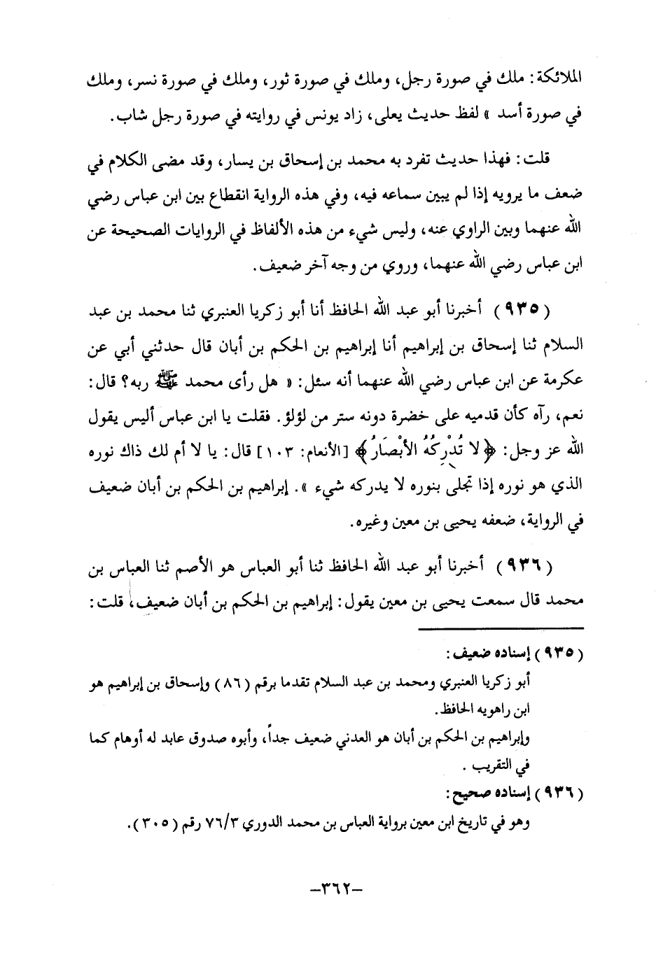 935 - أَخْبَرَنَا أَبُو عَبْدِ اللَّهِ الْحَافِظُ، أنا أَبُو زَكَرِيَّا الْعَنْبَرِيُّ، ثنا مُحَمَّدُ بْنُ عَبْدِ السَّلَامِ، ثنا إِسْحَاقُ بْنُ إِبْرَاهِيمَ، أنا إِبْرَاهِيمُ بْنُ الْحَكَمِ بْنِ أَبَانَ، قَالَ: حَدَّثَنِي أَبِي، عَنْ عِكْرِمَةَ، عَنِ ابْنِ عَبَّاسٍ، رَضِيَ اللَّهُ عَنْهُمَا أَنَّهُ سُئِلَ: §هَلْ رَأَى مُحَمَّدٌ صَلَّى اللهُ عَلَيْهِ وَسَلَّمَ رَبَّهُ؟ قَالَ: نَعَمْ، رَآهُ كَأَنَّ قَدَمَيْهِ عَلَى خُضْرَةٍ، دُونَهُ سِتْرٌ مِنْ لُؤْلُؤٍ. فَقُلْتُ: يَا ابْنَ عَبَّاسٍ أَلَيْسَ يَقُولُ اللَّهُ عَزَّ وَجَلَّ: {لَا تُدْرِكُهُ الْأَبْصَارُ} [الأنعام: 103] قَالَ: يَا لَا أُمَّ لَكَ، ذَاكَ نُورُهُ الَّذِي هُوَ نُورُهُ، إِذَا تَجَلَّى بِنُورِهِ لَا يُدْرِكَهُ شَيْءٌ. إِبْرَاهِيمُ بْنُ الْحَكَمِ بْنِ أَبَانَ ضَعِيفٌ فِي الرِّوَايَةِ، ضَعَّفَهُ يَحْيَى بْنُ مَعِينٍ وَغَيْرُهُ.