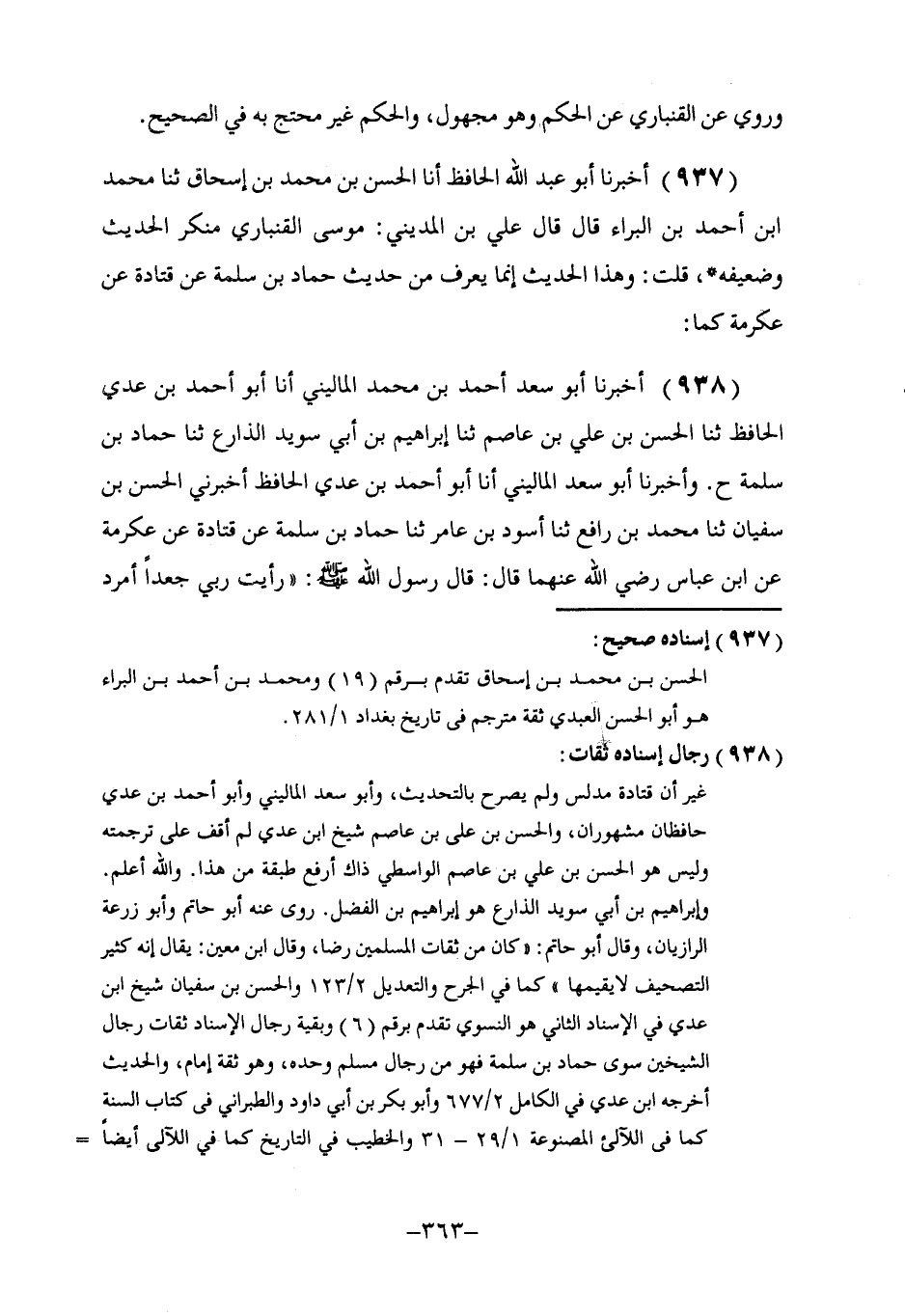 938 - كَمَا أَخْبَرَنَا أَبُو سَعْدٍ أَحْمَدُ بْنُ مُحَمَّدٍ الْمَالِينِيُّ، أنا أَبُو أَحْمَدَ بْنُ عَدِيٍّ الْحَافِظُ، ثنا الْحَسَنُ بْنُ عَلِيِّ بْنِ عَاصِمٍ، ثنا إِبْرَاهِيمُ بْنُ أَبِي سُوَيْدٍ الذِّرَاعُ، ثنا حَمَّادُ بْنُ سَلَمَةَ، ح. وَأَخْبَرَنَا أَبُو سَعْدٍ الْمَالِينِيُّ، أنا أَبُو أَحْمَدَ بْنُ عَدِيٍّ الْحَافِظَ، أَخْبَرَنِي الْحَسَنُ بْنُ سُفْيَانَ، ثنا مُحَمَّدُ بْنُ رَافِعٍ، ثنا أَسْوَدُ بْنُ عَامِرٍ، ثنا حَمَّادُ بْنُ سَلَمَةَ، عَنْ قَتَادَةَ، عَنْ عِكْرِمَةَ، عَنِ ابْنِ عَبَّاسٍ، رَضِيَ اللَّهُ عَنْهُمَا قَالَ: قَالَ رَسُولُ اللَّهِ صَلَّى اللهُ عَلَيْهِ وَسَلَّمَ: §«رَأَيْتُ رَبِّي جَعْدًا أَمْرَدَ -[364]- عَلَيْهِ حُلَّةٌ خَضْرَاءُ» . قَالَ: وَأَخْبَرَنَا أَبُو أَحْمَدَ، ثنا ابْنُ أَبِي سُفْيَانَ الْمَوْصِلِيُّ وَابْنُ شَهْرَيَارَ قَالَا: ثنا مُحَمَّدُ بْنُ رِزْقِ اللَّهِ بْنِ مُوسَى، ثنا الْأَسْوَدُ بْنُ عَامِرٍ. فَذَكَرَهُ بِإِسْنَادِهِ إِلَّا أَنَّهُ قَالَ: «فِي صُورَةِ شَابٍّ أَمْرَدَ جَعْدٍ» . قَالَ: وَزَادَ عَلِيُّ بْنُ شَهْرَيَارَ: «عَلَيْهِ حُلَّةٌ خَضْرَاءُ» . وَرَوَاهُ النَّضْرُ بْنُ سَلَمَةَ، عَنِ الْأَسْوَدِ بْنِ عَامِرٍ بِإِسْنَادِهِ أَنَّ مُحَمَّدًا صَلَّى اللهُ عَلَيْهِ وَسَلَّمَ رَأَى رَبَّهُ فِي صُورَةِ شَابٍّ أَمْرَدَ، دُونَهُ سِتْرٌ مِنْ لُؤْلُؤِ قَدَمَيْهِ ـ أَوْ قَالَ: رِجْلَيْهِ ـ فِي خُضْرَةٍ. -[365]-