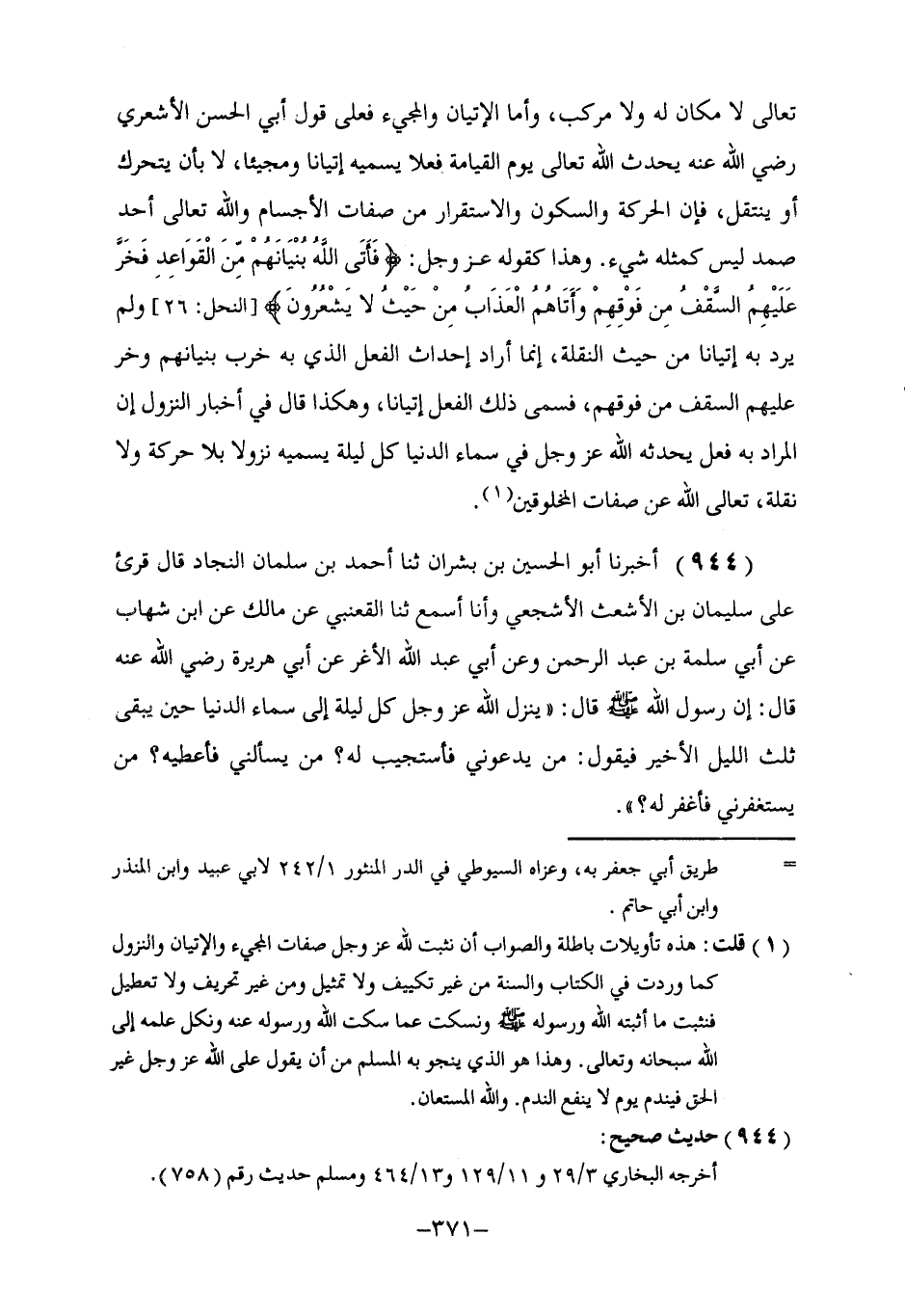 944 - أَخْبَرَنَا أَبُو الْحُسَيْنِ بْنُ بِشْرَانَ، ثنا أَحْمَدُ بْنُ سَلْمَانَ النِّجَادُ، قَالَ: قُرِئَ عَلَى سُلَيْمَانَ بْنِ الْأَشْعَثِ الْأَشْجَعِيِّ وَأَنَا أَسْمَعُ، ثنا الْقَعْنَبِيُّ، عَنْ مَالِكٍ، عَنِ ابْنِ شِهَابٍ، عَنْ أَبِي سَلَمَةَ بْنِ عَبْدِ الرَّحْمَنِ، وَعَنْ أَبِي عَبْدِ اللَّهِ الْأَغَرِّ، عَنْ أَبِي هُرَيْرَةَ، رَضِيَ اللَّهُ عَنْهُ قَالَ: إِنَّ رَسُولَ اللَّهِ صَلَّى اللهُ عَلَيْهِ وَسَلَّمَ قَالَ: §" يَنْزِلُ اللَّهُ عَزَّ وَجَلَّ كُلَّ لَيْلَةٍ إِلَى سَمَاءِ الدُّنْيَا حِينَ يَبْقَى ثُلُثُ اللَّيْلِ الْأَخِيرُ فَيَقُولُ: مَنْ يَدْعُونِي فَأَسْتَجِيبَ لَهُ؟ مَنْ يَسْأَلُنِي فَأُعْطِيَهُ؟ مَنْ يَسْتَغْفِرُنِي فَأَغْفِرَ لَهُ؟ " -[372]-