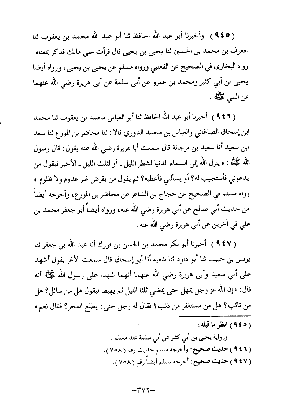 946 - أَخْبَرَنَا أَبُو عَبْدِ اللَّهِ الْحَافِظُ، ثنا أَبُو الْعَبَّاسِ مُحَمَّدُ بْنُ يَعْقُوبَ، ثنا مُحَمَّدُ بْنُ إِسْحَاقَ الصَّاغَانِيُّ، وَالْعَبَّاسُ بْنُ مُحَمَّدٍ الدُّورِيُّ، قَالَا: ثنا مُحَاضِرُ بْنُ الْمُوَرِّعِ، ثنا سَعْدُ بْنُ سَعِيدٍ، أنا سَعِيدُ بْنُ مَرْجَانَةَ، قَالَ: سَمِعْتُ أَبَا هُرَيْرَةَ، رَضِيَ اللَّهُ عَنْهُ يَقُولُ: قَالَ رَسُولُ اللَّهِ صَلَّى اللهُ عَلَيْهِ وَسَلَّمَ: §" يَنْزِلُ اللَّهُ إِلَى السَّمَاءِ الدُّنْيَا لِشَطْرِ اللَّيْلِ ـ أَوْ لَثُلُثِ اللَّيْلِ ـ الْأَخِيرِ فَيَقُولُ: مَنْ يَدْعُونِي فَأَسْتَجِيبَ لَهُ؟ أَوْ يَسْأَلُنِي فَأُعْطِيَهُ؟ ثُمَّ يَقُولُ: مَنْ يُقْرِضُ غَيْرَ عَدُومٍ وَلَا ظَلُومٍ؟ " رَوَاهُ مُسْلِمٌ فِي الصَّحِيحِ عَنْ حَجَّاجِ بْنِ الشَّاعِرِ، عَنْ مُحَاضِرِ بْنِ الْمُوَرِّعِ، وَأَخْرَجَهُ أَيْضًا مِنْ حَدِيثِ أَبِي صَالِحٍ عَنْ أَبِي هُرَيْرَةَ رَضِيَ اللَّهُ عَنْهُ، وَرَوَاهُ أَيْضًا أَبُو جَعْفَرٍ مُحَمَّدُ بْنُ عَلِيٍّ فِي آخَرِينَ عَنْ أَبِي هُرَيْرَةَ رَضِيَ اللَّهُ عَنْهُ