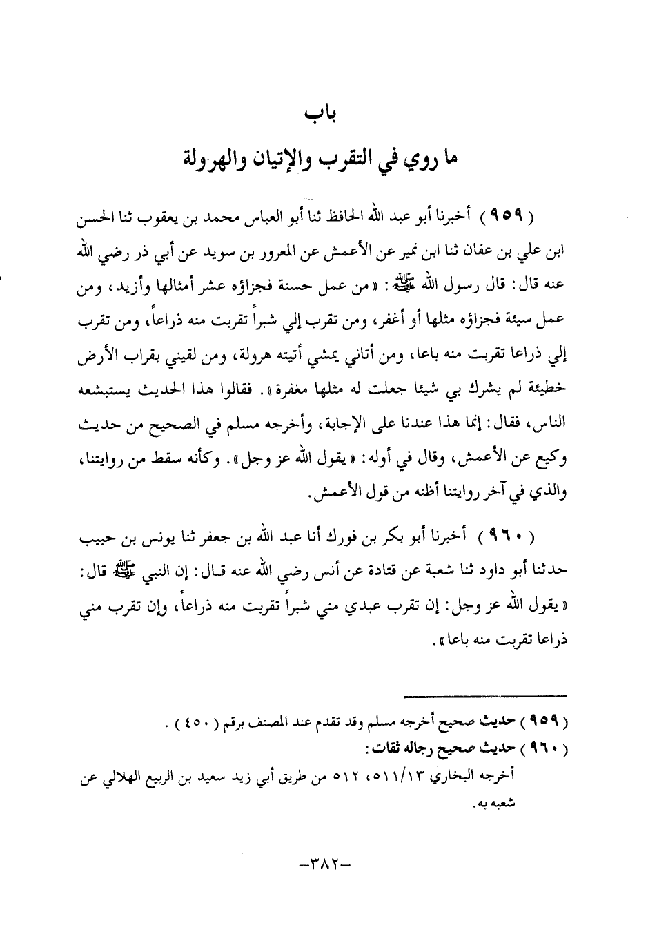 959 - أَخْبَرَنَا أَبُو عَبْدِ اللَّهِ الْحَافِظُ، ثنا أَبُو الْعَبَّاسِ مُحَمَّدُ بْنُ يَعْقُوبَ، ثنا الْحَسَنُ بْنُ عَلِيِّ بْنِ عَفَّانَ، ثنا ابْنُ نُمَيْرٍ، عَنِ الْأَعْمَشِ، عَنِ الْمَعْرُورِ بْنِ سُوَيْدٍ، عَنْ أَبِي ذَرٍّ، رَضِيَ اللَّهُ عَنْهُ، قَالَ: قَالَ رَسُولُ اللَّهِ صَلَّى اللهُ عَلَيْهِ وَسَلَّمَ: «مَنْ عَمِلَ حَسَنَةً فَجَزَاؤُهُ عَشْرُ أَمْثَالِهَا وَأَزِيدُ، وَمَنْ عَمِلَ سَيِّئَةً فَجَزَاؤُهُ مِثْلُهَا أَوْ أَغْفِرُ، §وَمَنْ تَقَرَّبَ إِلَيَّ شِبْرًا تَقَرَّبْتُ مِنْهُ ذِرَاعًا، وَمَنْ تَقَرَّبَ إِلَيَّ ذِرَاعًا تَقَرَّبْتُ مِنْهُ بَاعًا، وَمَنْ أَتَانِي يَمْشِي أَتَيْتُهُ هَرْوَلَةً، وَمَنْ لَقِيَنِي بِقِرَابِ الْأَرْضِ خَطِيئَةً لَمْ يُشْرِكْ بِي شَيْئًا جَعَلْتُ لَهُ مِثْلَهَا مَغْفِرَةً» فَقَالُوا: هَذَا الْحَدِيثُ يَسْتَبْشِعُهُ النَّاسُ. فَقَالَ: إِنَّمَا هَذَا عِنْدَنَا عَلَى الْإِجَابَةِ. وَأَخْرَجَهُ مُسْلِمٌ فِي الصَّحِيحِ مِنْ حَدِيثِ وَكِيعٍ عَنِ الْأَعْمَشِ، وَقَالَ فِي أَوَّلِهِ: «يَقُولُ اللَّهُ عَزَّ وَجَلَّ» . وَكَأَنَّهُ سَقَطَ مِنْ رِوَايَتِنَا، وَالَّذِي فِي آخِرِ رِوَايَتِنَا أَظُنُّهُ مِنْ قَوْلِ الْأَعْمَشِ