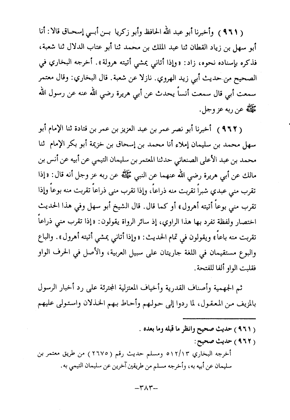 962 - أَخْبَرَنَا أَبُو نَصْرٍ عُمَرُ بْنُ عَبْدِ الْعَزِيزِ بْنِ عُمَرَ بْنِ قَتَادَةَ، ثنا الْإِمَامُ أَبُو سَهْلٍ مُحَمَّدُ بْنُ سُلَيْمَانَ إِمْلَاءً، أنا مُحَمَّدُ بْنُ إِسْحَاقَ بْنِ خُزَيْمَةَ أَبُو بَكْرٍ الْإِمَامُ، ثنا مُحَمَّدُ بْنُ عَبْدِ الْأَعْلَى الصَّنْعَانِيُّ، حَدَّثَنَا الْمُعْتَمِرُ بْنُ سُلَيْمَانَ التَّيْمِيُّ، عَنْ أَبِيهِ، عَنْ أَنَسِ بْنِ مَالِكٍ، عَنْ أَبِي هُرَيْرَةَ، رَضِيَ اللَّهُ عَنْهُمَا عَنِ النَّبِيِّ صَلَّى اللهُ عَلَيْهِ وَسَلَّمَ عَنْ رَبِّهِ عَزَّ وَجَلَّ أَنَّهُ قَالَ: «§إِذَا تَقَرَّبَ مِنِّي عَبْدِي شِبْرًا تَقَرَّبْتُ مِنْهُ ذِرَاعًا، وَإِذَا تَقَرَّبَ مِنِّي ذِرَاعًا تَقَرَّبْتُ مِنْهُ بُوعًا وَإِذَا تَقَرَّبَ مِنِّي بُوعًا أَتَيْتُهُ أُهَرْوِلُ» أَوْ كَمَا قَالَ. قَالَ الشَّيْخُ أَبُو سَهْلٍ: " وَفِي هَذَا الْحَدِيثِ اخْتِصَارٌ، وَلَفْظُةٌ تَفَرَّدَ بِهَا هَذَا الرَّاوِي، إِذْ سَائِرُ الرُّوَاةِ يَقُولُونَ: «إِذَا تَقَرَّبَ مِنِّي ذِرَاعًا تَقَرَّبْتُ مِنْهُ بَاعًا» وَيَقُولُونَ فِي تَمَامِ الْحَدِيثِ: «وَإِذَا أَتَانِي يَمْشِي أَتَيْتُهُ أُهَرْوِلُ» . وَالْبَاعُ وَالْبُوعُ مُسْتَقِيمَانِ فِي اللُّغَةِ، جَارِيَتَانِ عَلَى سَبِيلِ الْعَرَبِيَّةِ، وَالْأَصْلُ فِي الْحَرْفِ الْوَاوُ فَقَلَّبْتُ الْوَاوُ أَلْفًا لِلْفَتْحَةِ. ثُمَّ الْجَهْمِيَّةُ وَأَصْنَافُ الْقَدَرِيَّةِ وَأَخْيَافُ الْمُعْتَزَلَيَّةِ الْمُجْتَرِئَةِ عَلَى رَدِّ أَخْبَارِ الرَّسُولِ بِالْمُزَيَّفِ مِنَ الْمَعْقُولِ، لَمَّا رُدُّوا إِلَى حَوْلِهِمْ وَأَحَاطَ بِهِمُ الْخِذْلَانُ وَاسْتَوْلَى عَلَيْهِمُ -[384]- بِخَدَائِعِهِ الشَّيْطَانُ، وَلَمْ يَعْصِمْهُمُ التَّوْفِيقُ وَلَا اسْتَنْقَذَهُمُ التَّحْقِيقُ، قَالُوا: الْهَرْوَلَةُ لَا تَكُونُ إِلَّا مِنَ الْجِسْمِ الْمُنْتَقِلِ، وَالْحَيَوَانُ الْمُهَرْوِلُ، وَهُوَ ضَرْبٌ مِنْ ضُرُوبِ حَرَكَاتِ الْإِنْسَانِ كَالْهَرْوَلَةِ الْمَعْرُوفَةِ فِي الْحَجِّ، وَهَكَذَا قَالُوا، فِي قَوْلِهِ: «تَقَرَّبْتُ مِنْهُ ذِرَاعًا» ، تَشْبِيهٌ إِذْ يُقَالُ ذَلِكَ فِي الْأَشْخَاصِ الْمُتَقَارِبَةِ، وَالْأَجْسَامِ الْمُتَدَانِيَةِ الْحَامِلَةِ لِلْأَعْرَاضِ، ذَوَاتِ الِانْبِسَاطِ وَالِانْقِبَاضِ، فَأَمَّا الْقَدِيمُ الْمُتَعَالِي عَنْ صِفَةِ الْمَخْلُوقِينَ، وَعَنْ نُعُوتِ الْمُخْتَرِعِينَ، فَلَا يُقَالُ عَلَيْهِ مَا يَنْثَلِمُ بِهِ التَّوْحِيدُ وَلَا يَسْلَمُ عَلَيْهِ التَّمْجِيدُ. فَأَقُولُ: إِنَّ قَوْلَ الرَّسُولِ صَلَّى اللهُ عَلَيْهِ وَسَلَّمَ مُوَافِقٌ لِقَضَايَا الْعُقُولِ إِذْ هُوَ سَيِّدُ الْمُوَحِّدِينَ مِنَ الْأَوَّلِينَ وَالْآخِرِينَ، وَلَكِنْ مَنْ نَبَذَ الدِّينَ وَرَاءَهُ وَحَكَّمَ هَوَاهُ وَآرَاءَهُ، ضَلَّ عَنْ سَبِيلِ الْمُؤْمِنِينَ، وَبَاءَ بِسَخَطِ رَبِّ الْعَالَمِينَ، تَقَرَّبَ الْعَبْدُ مِنْ مَوْلَاهُ بِطَاعَاتِهِ وَإِرَادَتِهِ وَحَرَكَاتِهِ وَسَكَنَاتِهِ سِرًّا وَعَلَنًا، كَالَّذِي رُوِيَ عَنِ النَّبِيِّ صَلَّى اللهُ عَلَيْهِ وَسَلَّمَ: «مَا تَقَرَّبَ الْعَبْدُ مِنِّي بِمِثْلِ مَا تَقَرَّبَ مِنْ أَدَاءِ مَا افْتَرَضْتُهُ عَلَيْهِ، فَلَا يَزَالُ يَتَقَرَّبُ إِلَيَّ بِالنَّوَافِلِ حَتَّى أَكُونَ لَهُ سَمْعًا وَبَصَرًا» . وَهَذَا الْقَوْلُ مِنَ الرَّسُولِ صَلَّى اللهُ عَلَيْهِ وَسَلَّمَ مِنْ لَطِيفِ التَّمْثِيلِ عِنْدَ ذَوِي التَّحْصِيلِ، الْبَعِيدُ مِنَ التَّشْبِيهِ، الْمَكِينُ مِنَ التَّوْحِيدُ، وَهُوَ أَنْ يَسْتَوْلِيَ الْحَقُّ عَلَى الْمتَقَرِّبِ إِلَيْهِ بِالنَّوَافِلِ حَتَّى لَا يَسْمَعُ شَيْئًا إِلَّا بِهِ، وَلَا يَنْطِقُ إِلَّا عَنْهُ، نَشْرًا لِآلَائِهِ، وَذِكْرًا لِنَعْم