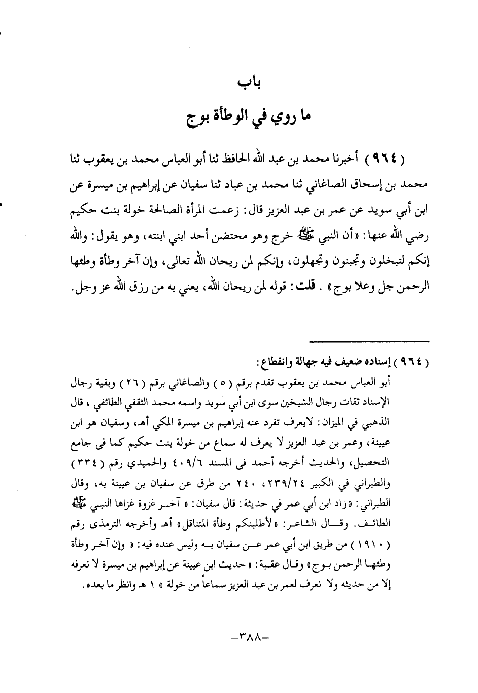 964 - أَخْبَرَنَا مُحَمَّدُ بْنُ عَبْدِ اللَّهِ الْحَافِظُ، ثنا أَبُو الْعَبَّاسِ مُحَمَّدُ بْنُ يَعْقُوبَ، ثنا مُحَمَّدُ بْنُ إِسْحَاقَ الصَّاغَانِيُّ، ثنا مُحَمَّدُ بْنُ عَبَّادٍ، ثنا سُفْيَانُ، عَنْ إِبْرَاهِيمَ بْنِ مَيْسَرَةَ، عَنِ ابْنِ أَبِي سُوَيْدٍ، عَنْ عُمَرَ بْنِ عَبْدِ الْعَزِيزِ، قَالَ: زَعَمَتِ الْمَرْأَةُ الصَّالِحَةُ خَوْلَةُ بِنْتُ حَكِيمٍ رَضِيَ اللَّهُ عَنْهَا: أَنَّ النَّبِيَّ صَلَّى اللهُ عَلَيْهِ وَسَلَّمَ خَرَجَ وَهُوَ مُحْتَضِنٌ أَحَدَ ابْنَيِ ابْنَتِهِ، وَهُوَ يَقُولُ: «وَاللَّهِ إِنَّكُمْ لَتُبَخِّلُونَ وَتُجَبِّنُونَ وَتُجَهِّلُونَ، وَإِنَّكُمْ لَمِنْ رَيْحَانِ اللَّهِ تَعَالَى، وَإِنَّ §آخِرَ وَطْأَةٍ وَطِئَهَا الرَّحْمَنُ جَلَّ وَعَلَا بِوَجٍّ» . قُلْتُ: قَوْلُهُ: «لَمِنْ رَيْحَانِ اللَّهِ» ، يَعْنِي بِهِ: مِنْ رِزْقِ اللَّهِ عَزَّ وَجَلَّ