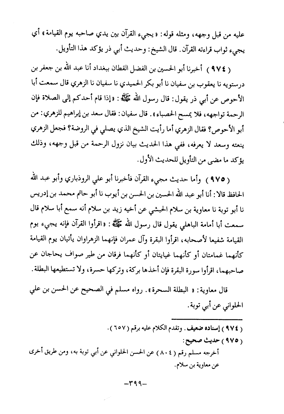 975 - وَأَمَّا حَدِيثُ مَجِيءِ الْقُرْآنِ فَأَخْبَرَنَا أَبُو عَلِيٍّ الرُّوذْبَارِيُّ، وَأَبُو عَبْدِ اللَّهِ الْحَافِظُ، قَالَا: أنا أَبُو عَبْدِ اللَّهِ الْحُسَيْنُ بْنُ الْحَسَنِ بْنِ أَيُّوبَ، نا أَبُو حَاتِمٍ مُحَمَّدُ بْنُ إِدْرِيسَ، نا أَبُو تَوْبَةَ، نا مُعَاوِيَةُ بْنُ سَلَّامٍ الْحَبَشِيُّ، عَنْ أَخِيهِ زَيْدِ بْنِ سَلَّامٍ أَنَّهُ سَمِعَ أَبَا سَلَّامٍ، قَالَ: سَمِعْتُ أَبَا أُمَامَةَ الْبَاهِلِيَّ، يَقُولُ: قَالَ رَسُولُ اللَّهِ صَلَّى اللهُ عَلَيْهِ وَسَلَّمَ: «§اقْرَءُوا الْقُرْآنَ فَإِنَّهُ يَجِيءُ يَوْمَ الْقِيَامَةِ شَفِيعًا لِأَصْحَابِهِ، اقْرَءُوا الْبَقَرَةَ وَآلَ عِمْرَانَ فَإِنَّهُمَا الزَّهْرَاوَانِ، يَأْتِيَانِ يَوْمَ الْقِيَامَةِ كَأَنَّهُمَا غَمَامَتَانِ أَوْ كَأَنَّهُمَا غَيَايَتَانِ أَوْ كَأَنَّهُمَا فِرْقَانِ مِنْ طَيْرٍ صَوَافَّ يُحَاجَّانِ عَنْ صَاحِبِهِمَا، اقْرَءُوا سُورَةَ الْبَقَرَةِ؛ فَإِنَّ أَخْذَهَا بَرَكَةٌ، وَتَرْكَهَا حَسْرَةٌ، وَلَا تَسْتَطِيعُهَا الْبَطَلَةُ» . قَالَ مُعَاوِيَةُ: الْبَطَلَةُ: السَّحَرَةُ. رَوَاهُ مُسْلِمٌ فِي الصَّحِيحِ عَنِ الْحَسَنِ بْنِ عَلِيٍّ الْحُلْوَانِيِّ عَنْ أَبِي تَوْبَةَ. -[400]- وَالْمُرَادُ بِهَذَا وَاللَّهُ أَعْلَمُ التَّرْغِيبُ فِي قِرَاءَةِ الْقُرْآنِ، ثُمَّ الْكَلَامُ فِي مَجِيءِ قِرَاءَتِهِ يَوْمَ الْقِيَامَةِ نَحْوَ الْكَلَامِ فِي وَزْنِ الْأَعْمَالِ يَوْمَ الْقِيَامَةِ، وَذَلِكَ مَذْكُورٌ فِي مَوْضِعِهِ